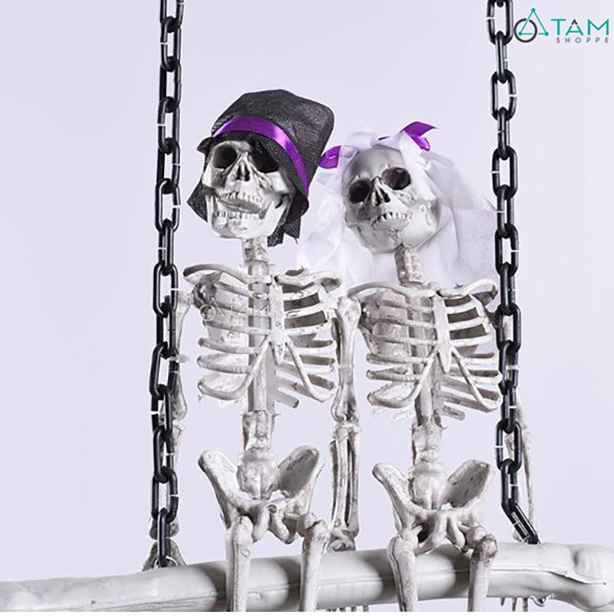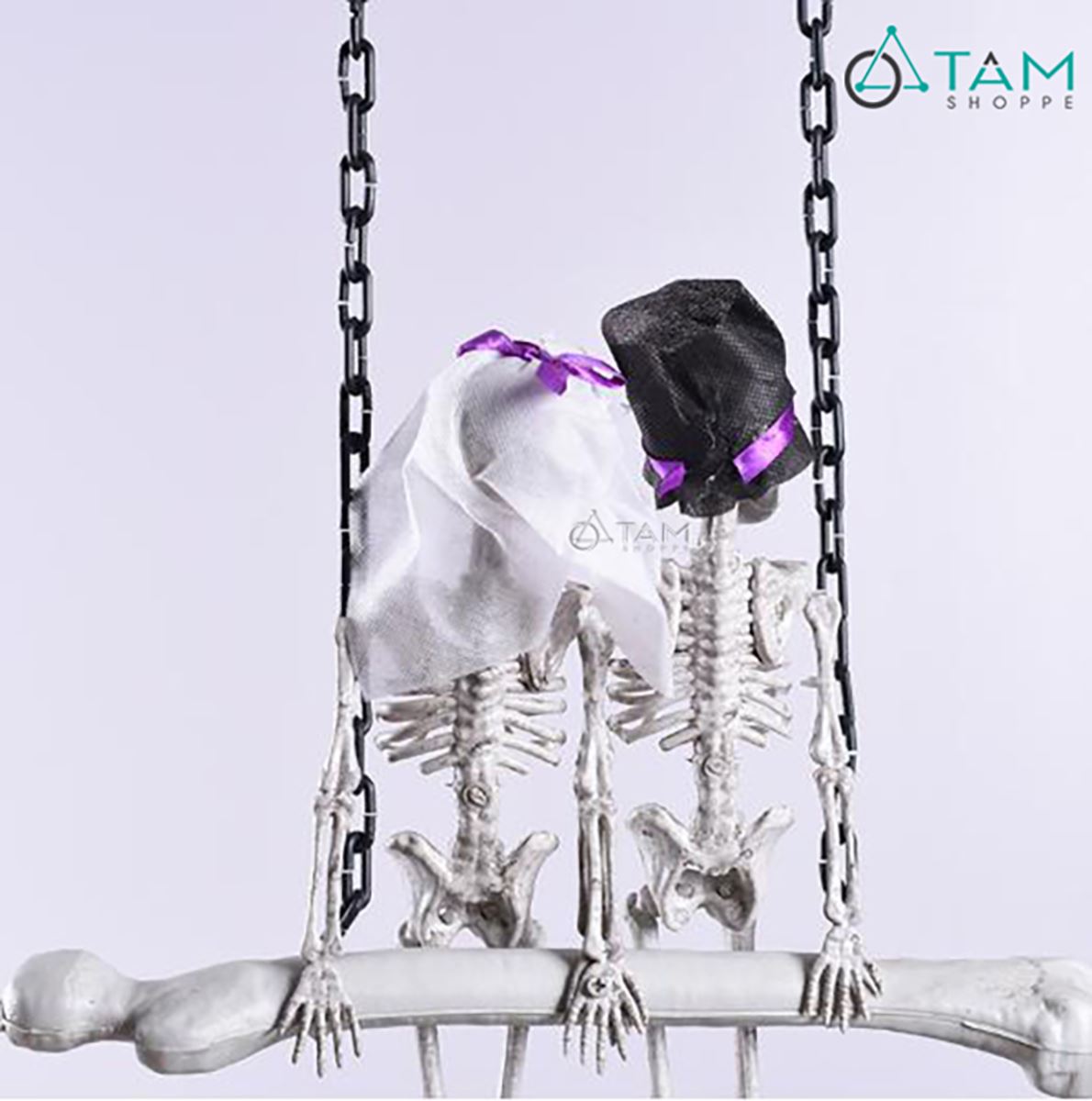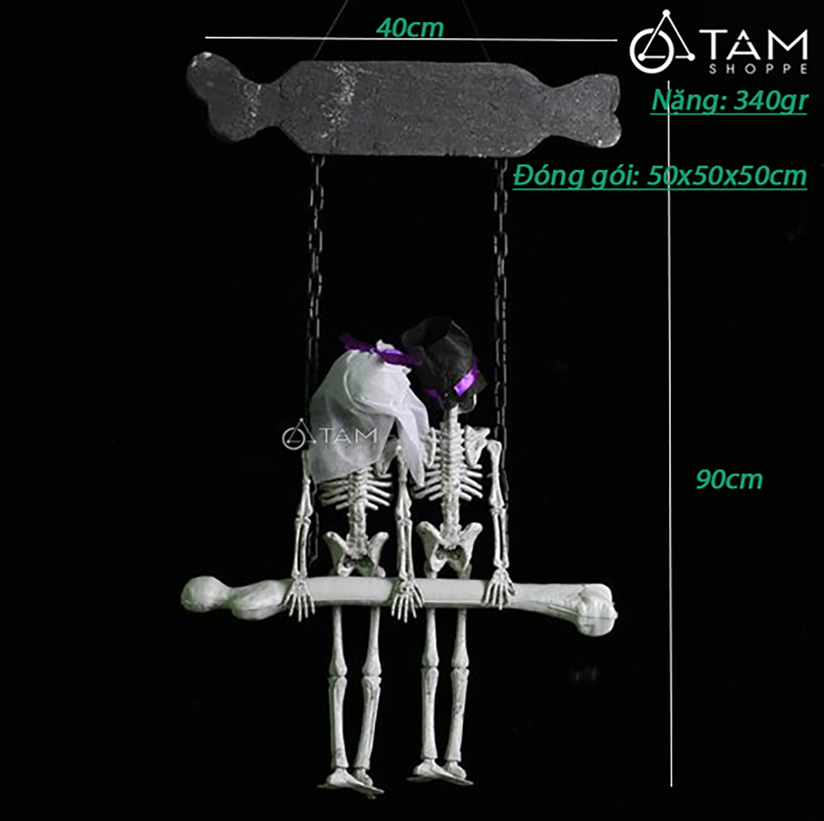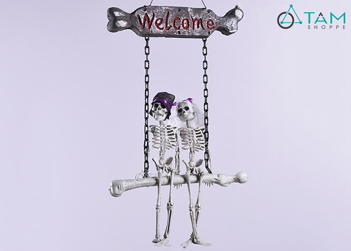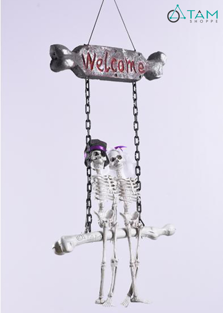 Bảng treo cửa Halloween 2 bộ xương ngồi xích đu [Độc đáo - Dài 90cm] trang trí đẹp mắt. Đồ trang trí Halloween là những vật dụng, mô hình hoặc phụ kiện được dùng để tạo không khí rùng rợn, huyền bí, vui nhộn đặc trưng cho ngày lễ Halloween (31/10).