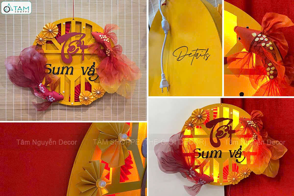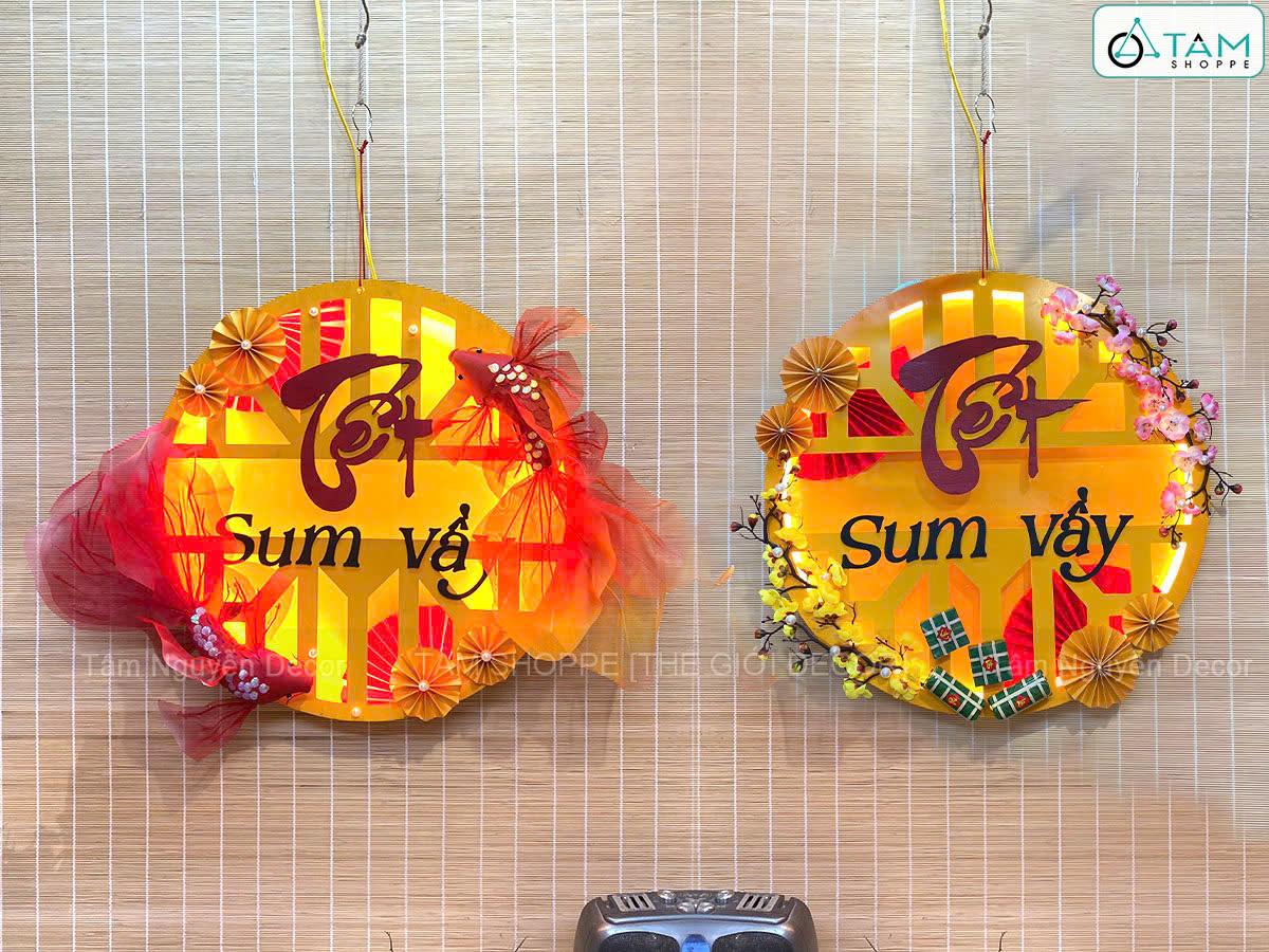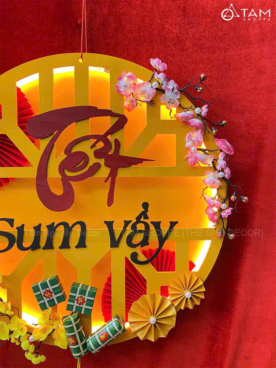 [Order 3 - 5 ngày] Bảng treo Tết Sum Vầy đèn Led [Bằng gỗ - Cắm điện] ĐK 60cm trang trí đẹp mắt. Đồ trang trí Tết là các vật dụng, phụ kiện, hoặc mô hình được dùng để trang hoàng không gian trong dịp lễ, nhằm tạo nên không khí ấm áp, vui tươi và mang đậm sắc màu lễ hội.
