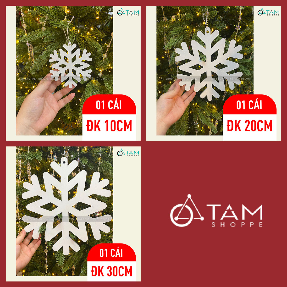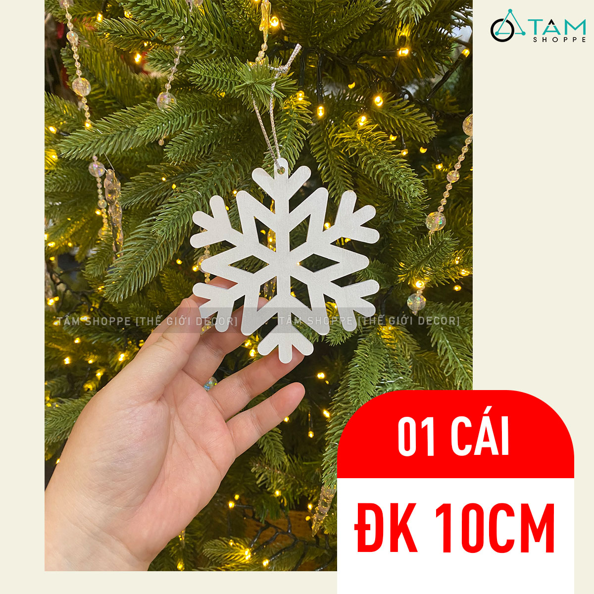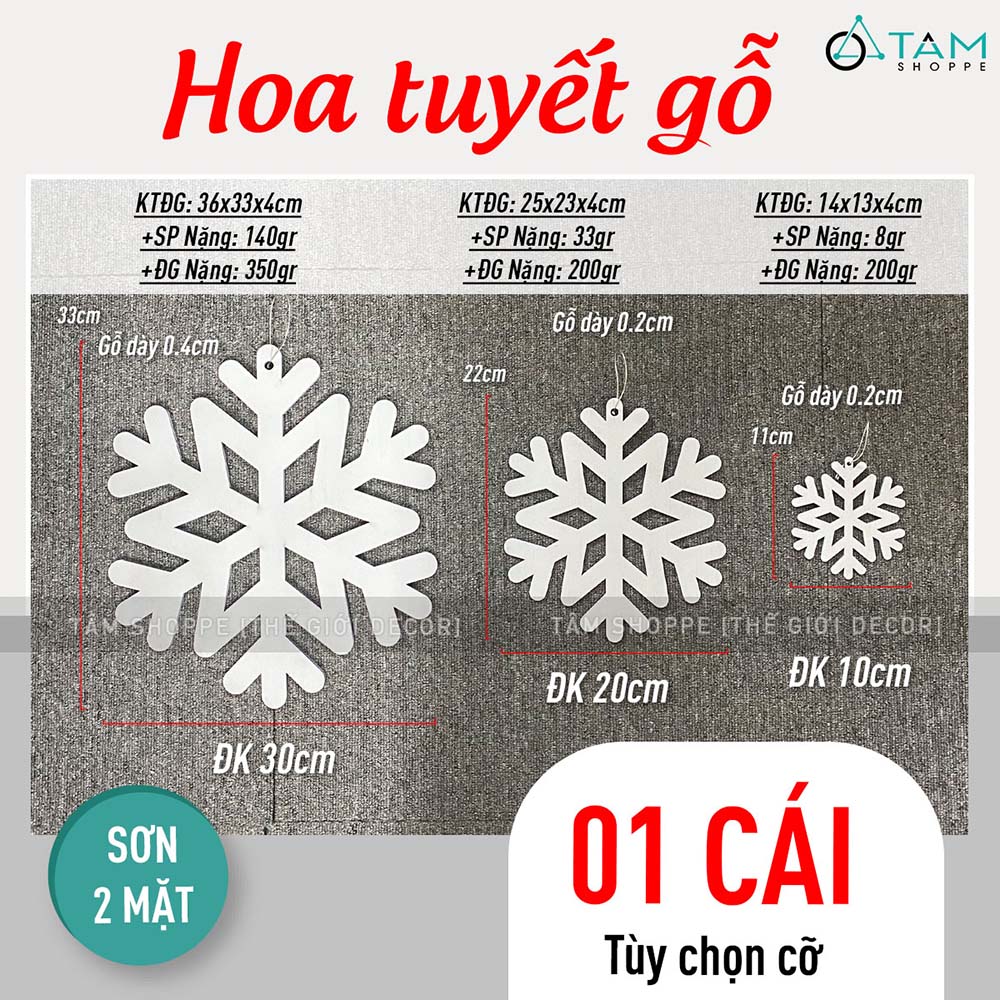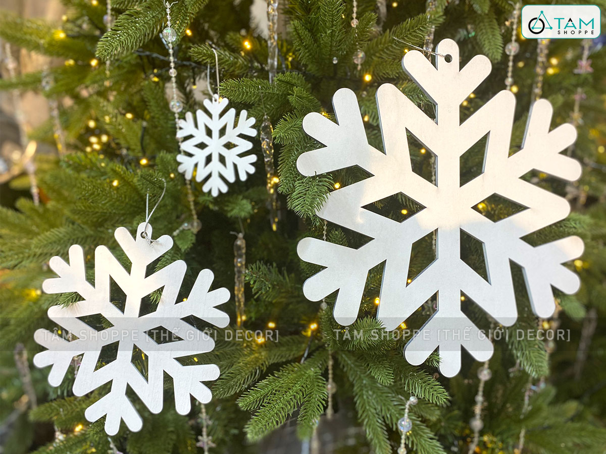 Bông tuyết trắng bằng gỗ trang trí [ĐK10/20/30cm - Có lỗ xỏ dây] trang trí đẹp mắt. Đồ trang trí Noel là các vật dụng, phụ kiện, hoặc mô hình được dùng để trang hoàng không gian trong dịp Giáng Sinh (Noel), nhằm tạo nên không khí ấm áp, vui tươi và mang đậm sắc màu lễ hội.