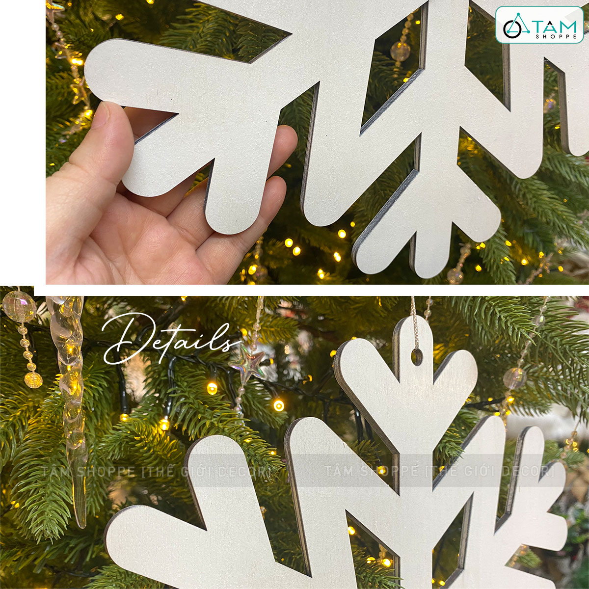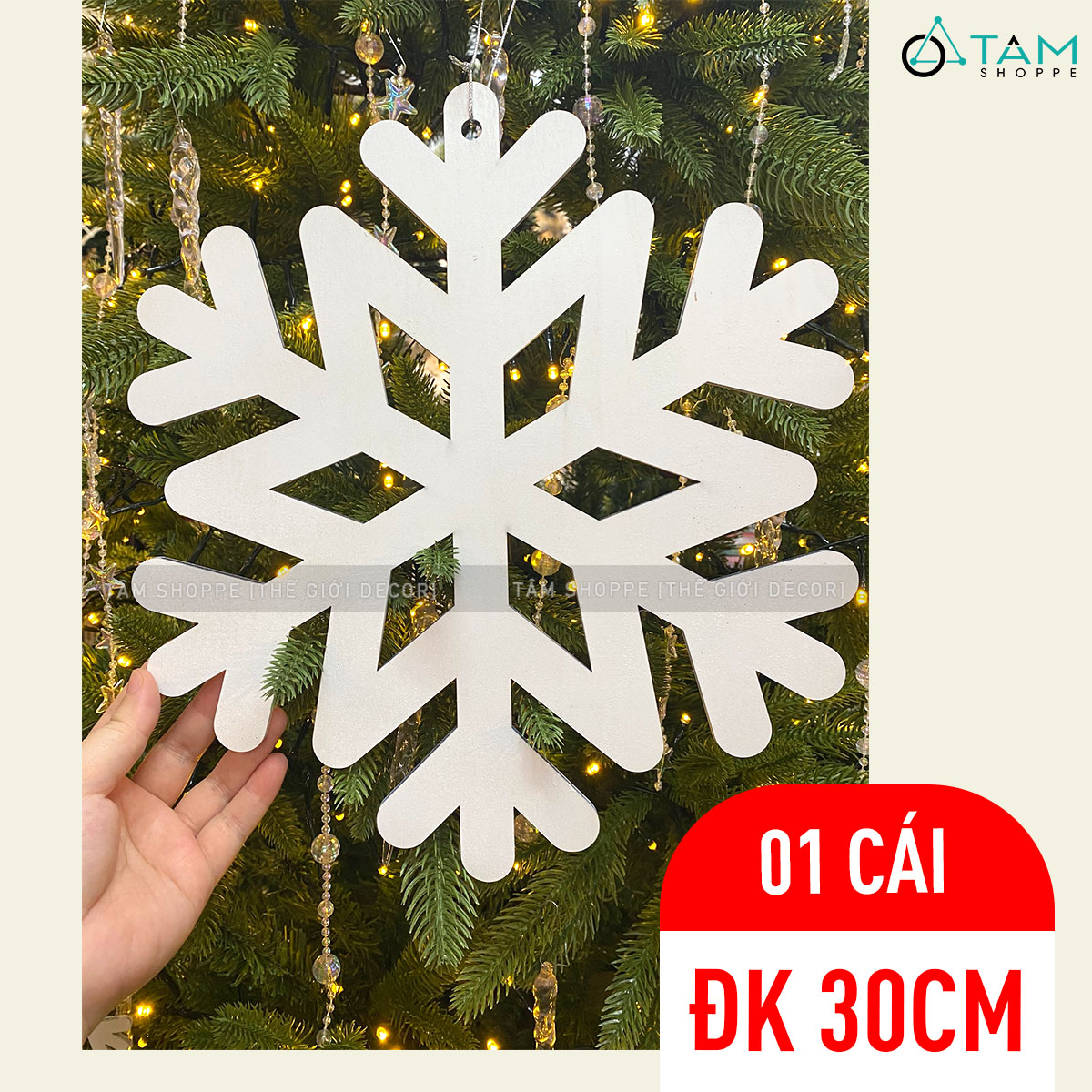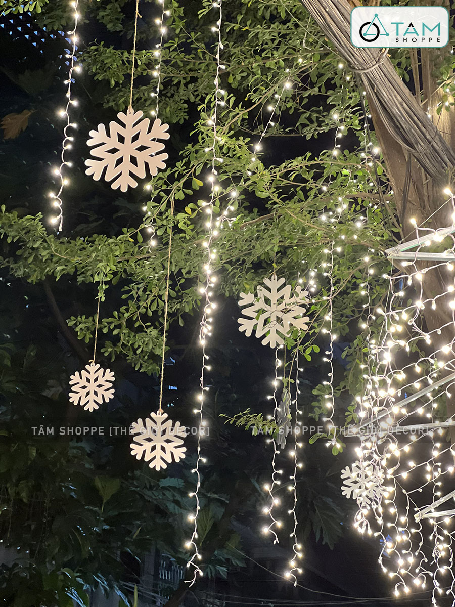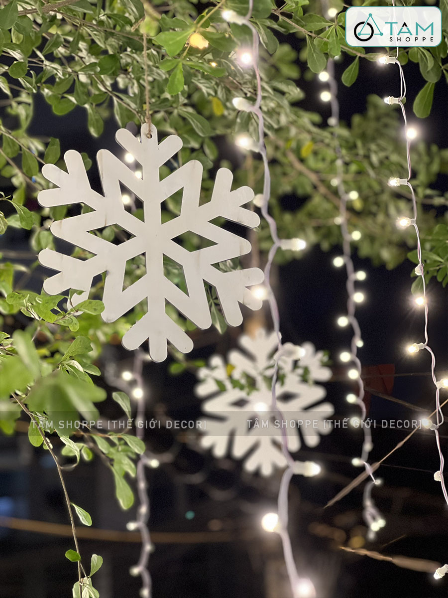Bông tuyết làm bằng gỗ, sơn màu trắng tinh khôi đẹp mắt. Trên bông tuyết có sẵn lỗ để xỏ dây treo.
