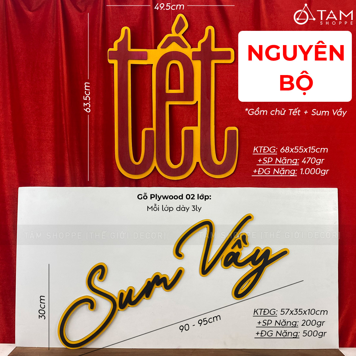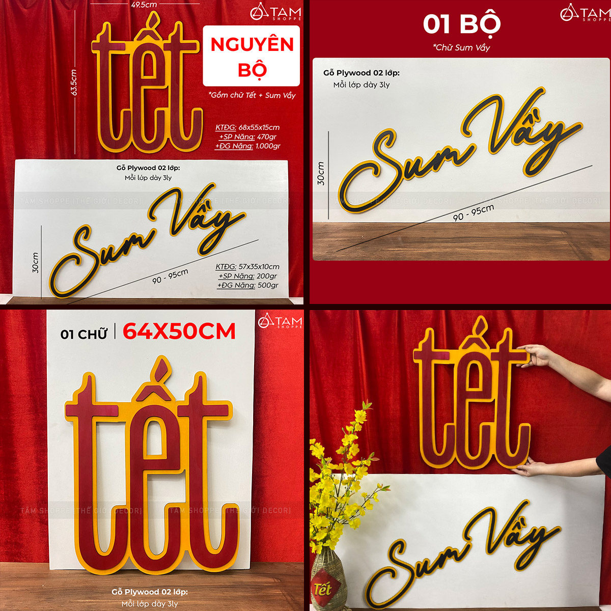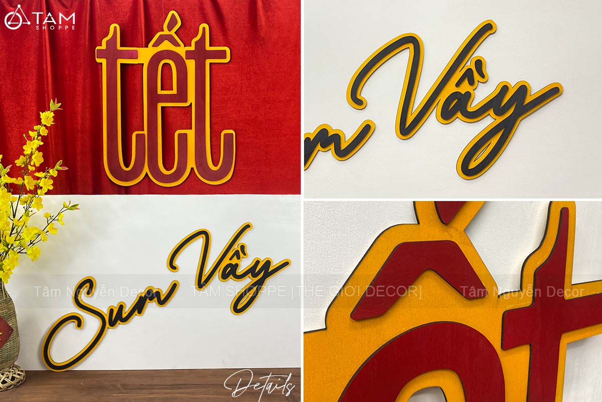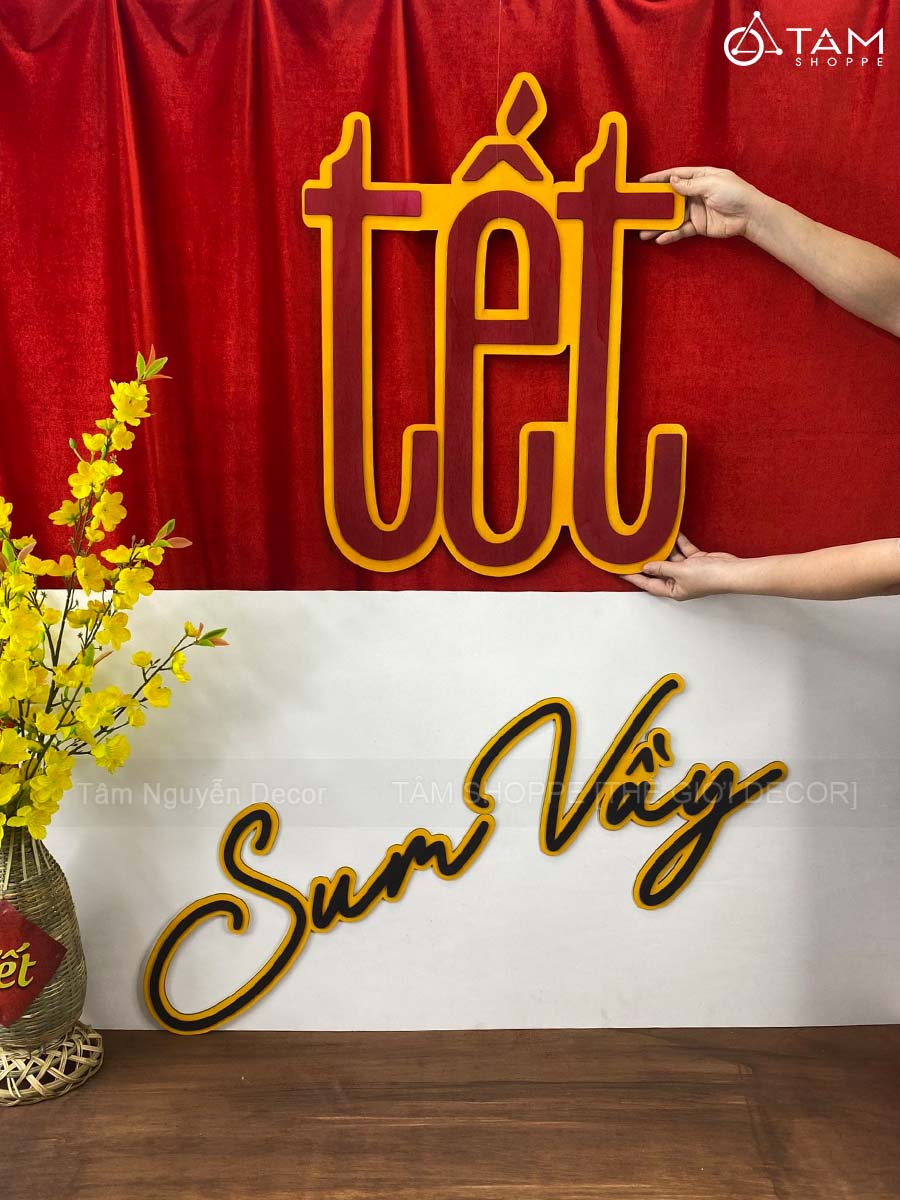 Chữ Tết Sum Vầy Cao 30-64cm [Bằng gỗ - Nhẹ] trang trí đẹp mắt. Đồ trang trí Tết là các vật dụng, phụ kiện, hoặc mô hình được dùng để trang hoàng không gian trong dịp Tết, nhằm tạo nên không khí ấm áp, vui tươi và mang đậm sắc màu lễ hội.