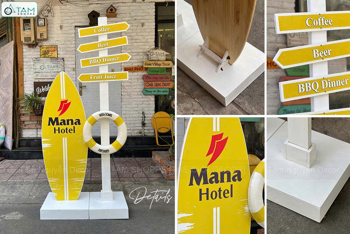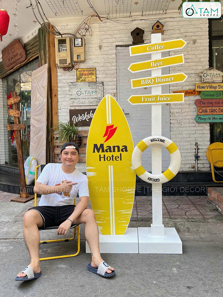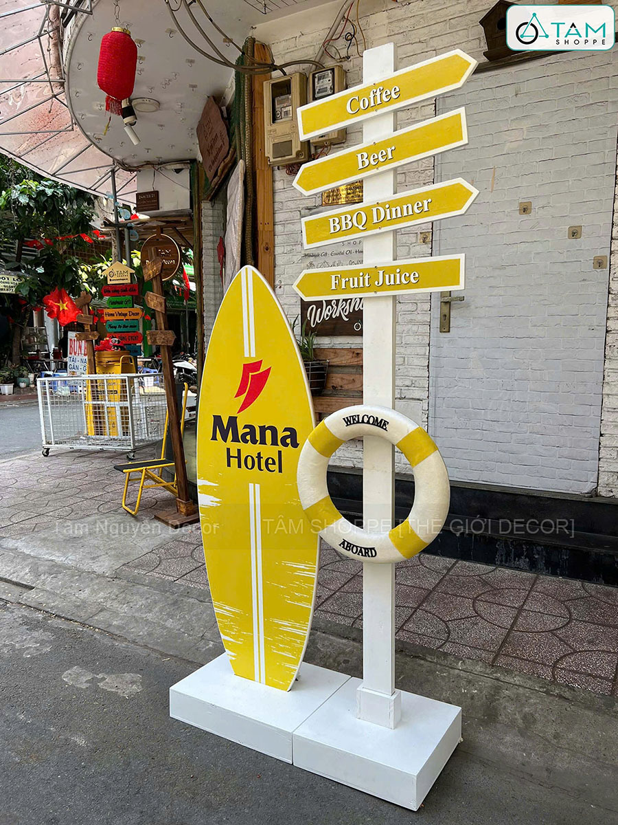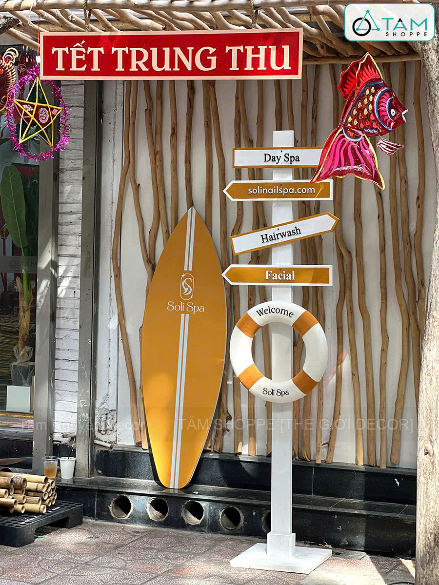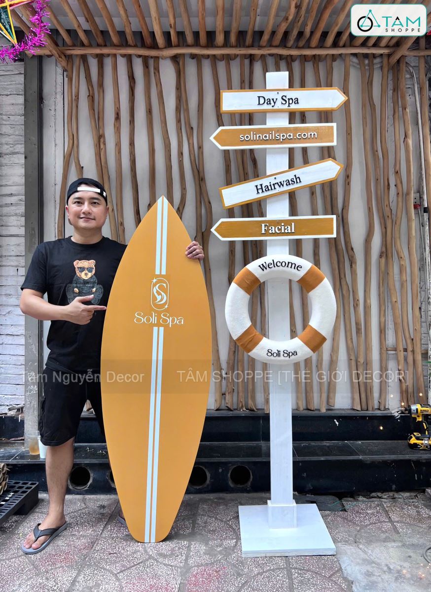 Concept decor biển “Summer Direction” - Logo, màu theo yêu cầu [2026 - Tâm Nguyễn Decor]. Set decor biển với ván lướt sóng – cây chỉ đường – phao cứu sinh là sự kết hợp giữa thẩm mỹ – nhận diện thương hiệu – tính ứng dụng cao, giúp concept này trở thành lựa chọn lý tưởng cho mọi không gian cần “refresh” vibe trẻ trung, năng động.