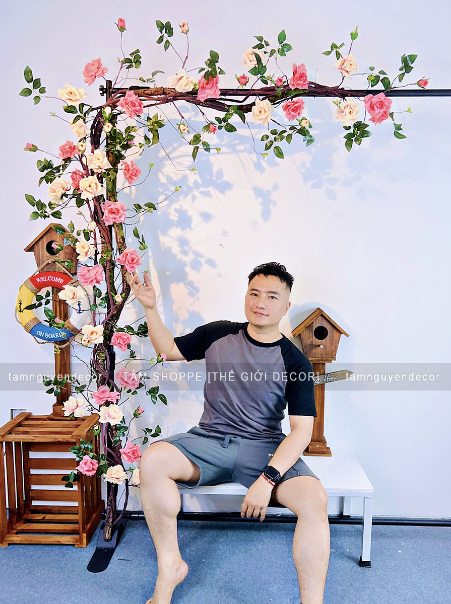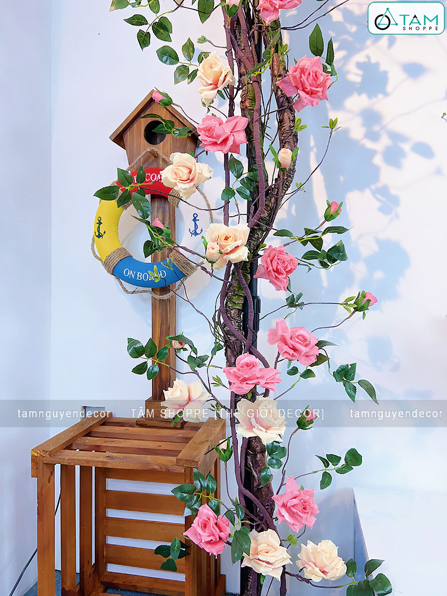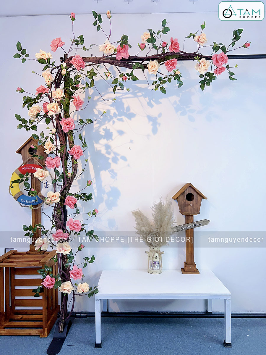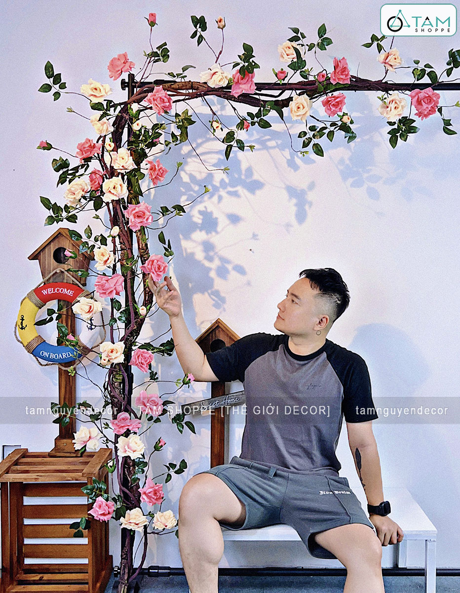 - Sử dụng 02 dây hồng leo màu Hồng nhạt + 02 dây hồng leo màu Cam nhạt dài 1m7. Kết hợp 02 dây leo giả dây rừng dài 1m7. Nên phối 2 màu hoặc tối đa 3 màu để giàn hoa được sống động hơn.