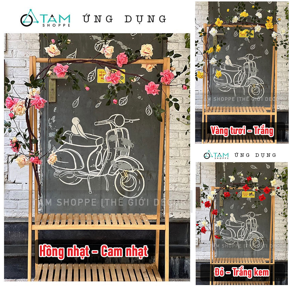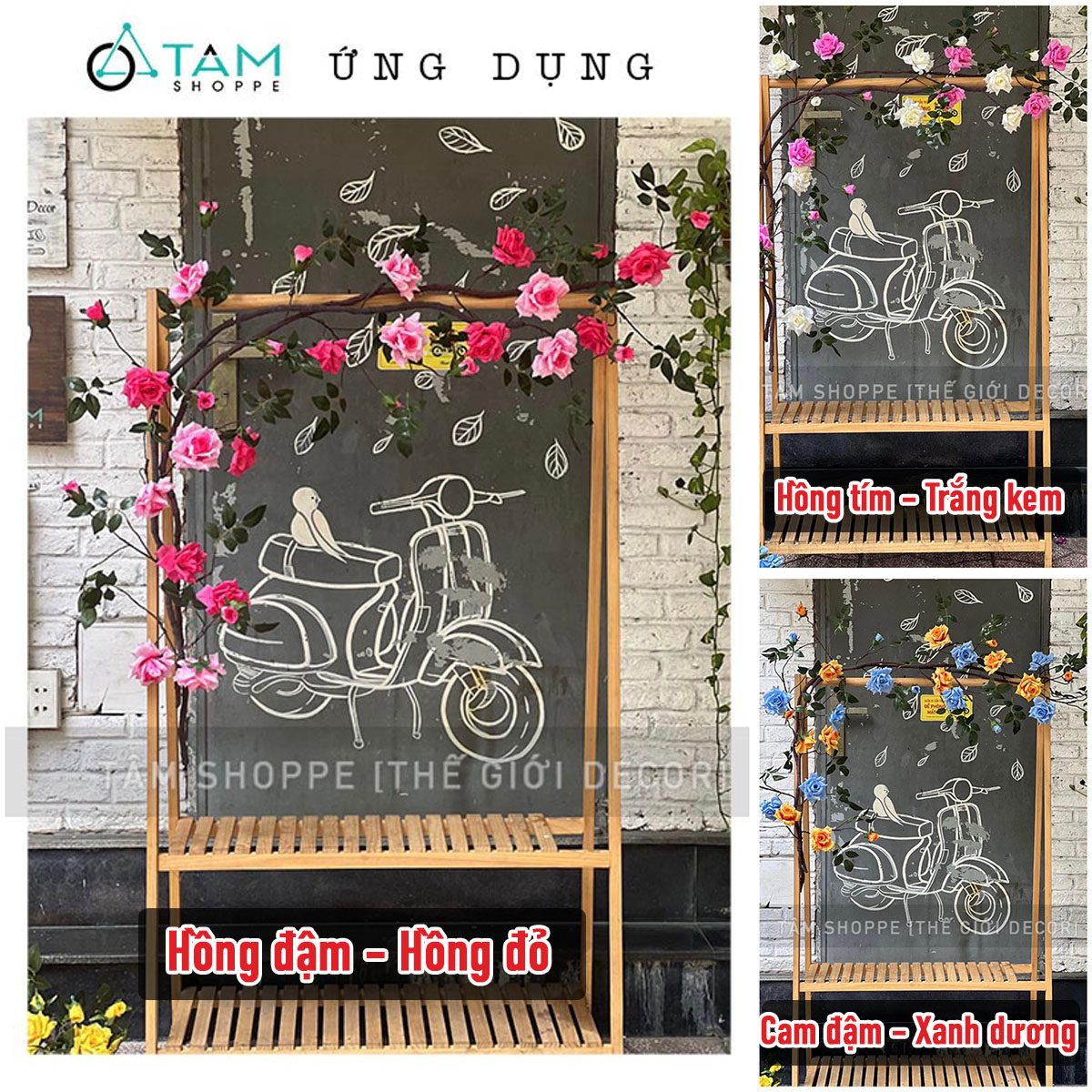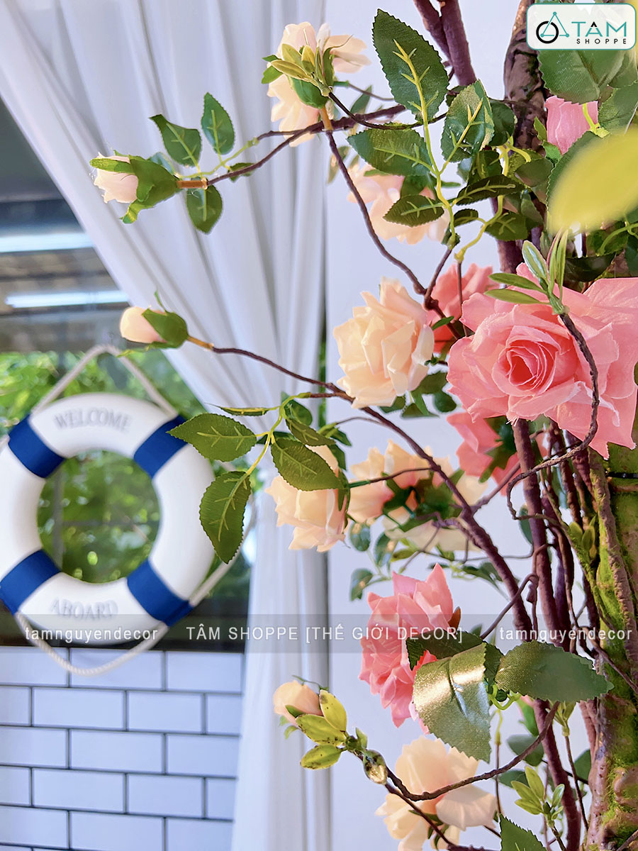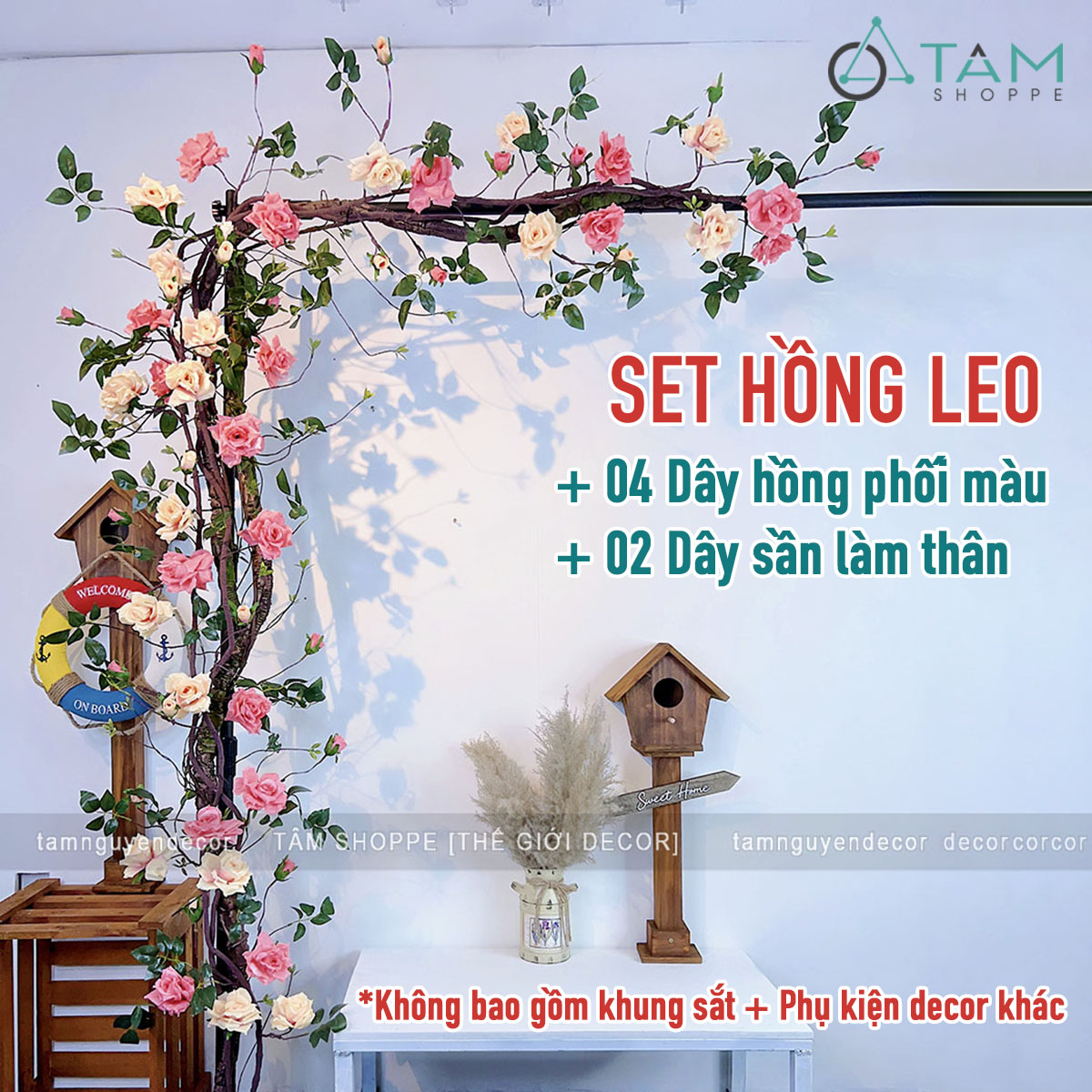 - Sử dụng 02 dây hồng leo màu Hồng nhạt + 02 dây hồng leo màu Cam nhạt dài 1m7. Kết hợp 02 dây leo giả dây rừng dài 1m7. Nên phối 2 màu hoặc tối đa 3 màu để giàn hoa được sống động hơn.
