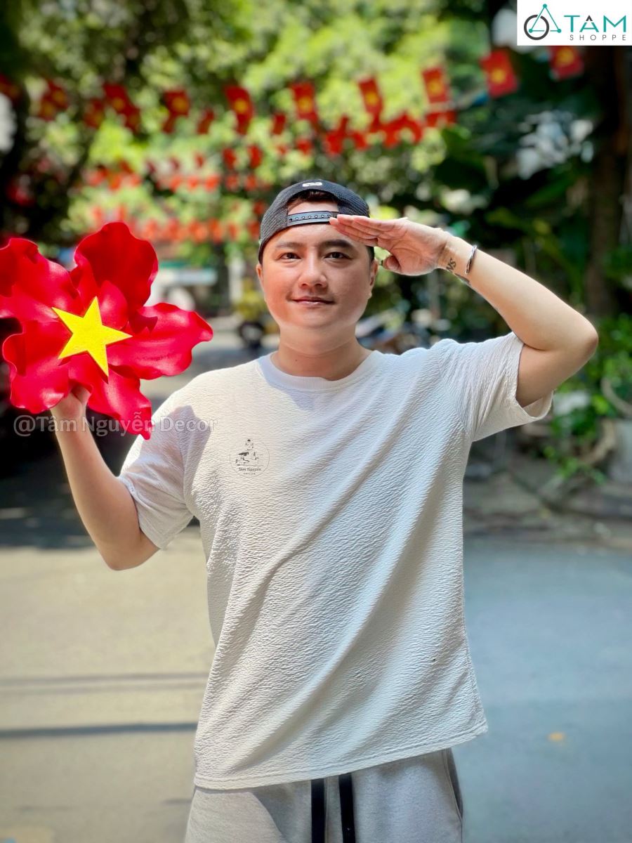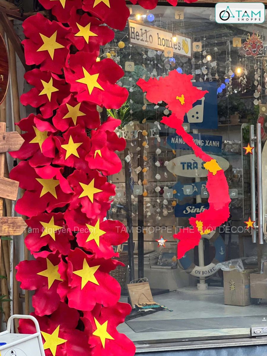 Cổng hoa cờ và bản đồ Việt Nam - Toàn vẹn lãnh thổ [2026 - Tâm Nguyễn Decor] có bố cục trang trí mang đậm tinh thần tự hào dân tộc. Với điểm nhấn là những bông hoa ngôi sao đỏ rực lấy cảm hứng từ lá cờ Việt Nam – biểu tượng của ý chí, đoàn kết và khát vọng vươn lên. Sắc đỏ tượng trưng cho nhiệt huyết và sự hy sinh, trong khi ngôi sao vàng đại diện cho niềm tin, ánh sáng dẫn lối và tinh thần dân tộc bền vững.