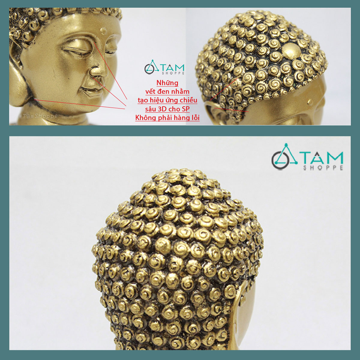 Tượng sơn màu vàng Gold và những vết lem đen tạo chiều sâu và hoài cổ. Màu sắc mỗi đợt có thể chênh lệch một ít do pha màu thủ công.