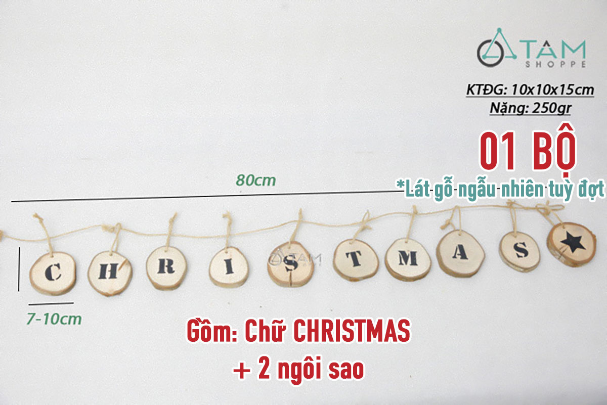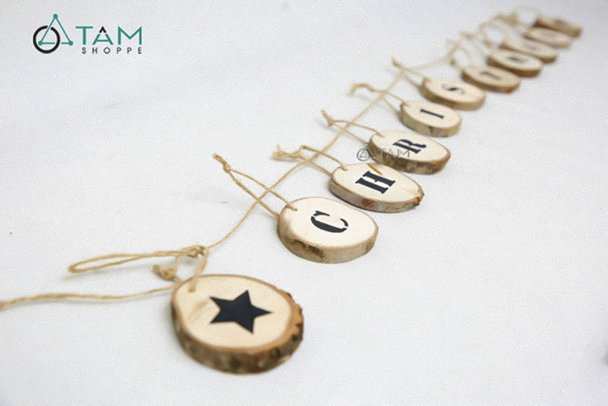 Dây banner chữ Christmas lát gỗ tròn 2 sao [Tự nhiên - thủ công] trang trí đẹp mắt.