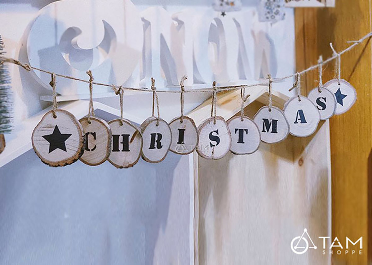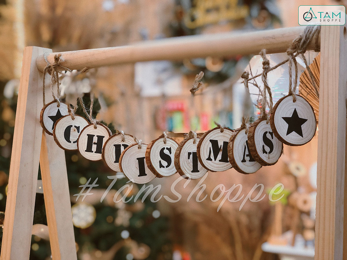 Dây banner chữ Christmas lát gỗ tròn 2 sao [Tự nhiên - thủ công] trang trí đẹp mắt. Đồ trang trí Noel là các vật dụng, phụ kiện, hoặc mô hình được dùng để trang hoàng không gian trong dịp Giáng Sinh (Noel), nhằm tạo nên không khí ấm áp, vui tươi và mang đậm sắc màu lễ hội.
