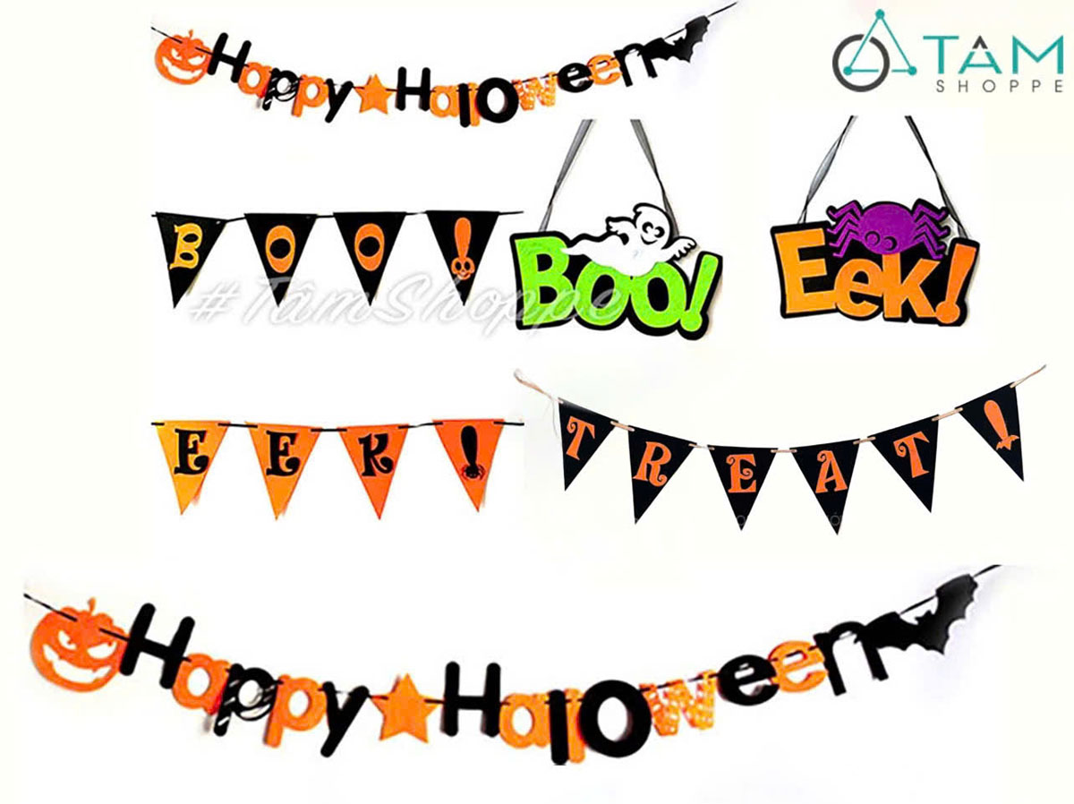 Dây banner nỉ Happy Halloween - Treats - Boo - Eek [Kèm dây - Nhiều kiểu] trang trí đẹp mắt. Đồ trang trí Halloween là những vật dụng, mô hình hoặc phụ kiện được dùng để tạo không khí rùng rợn, huyền bí, vui nhộn đặc trưng cho ngày lễ Halloween (31/10).