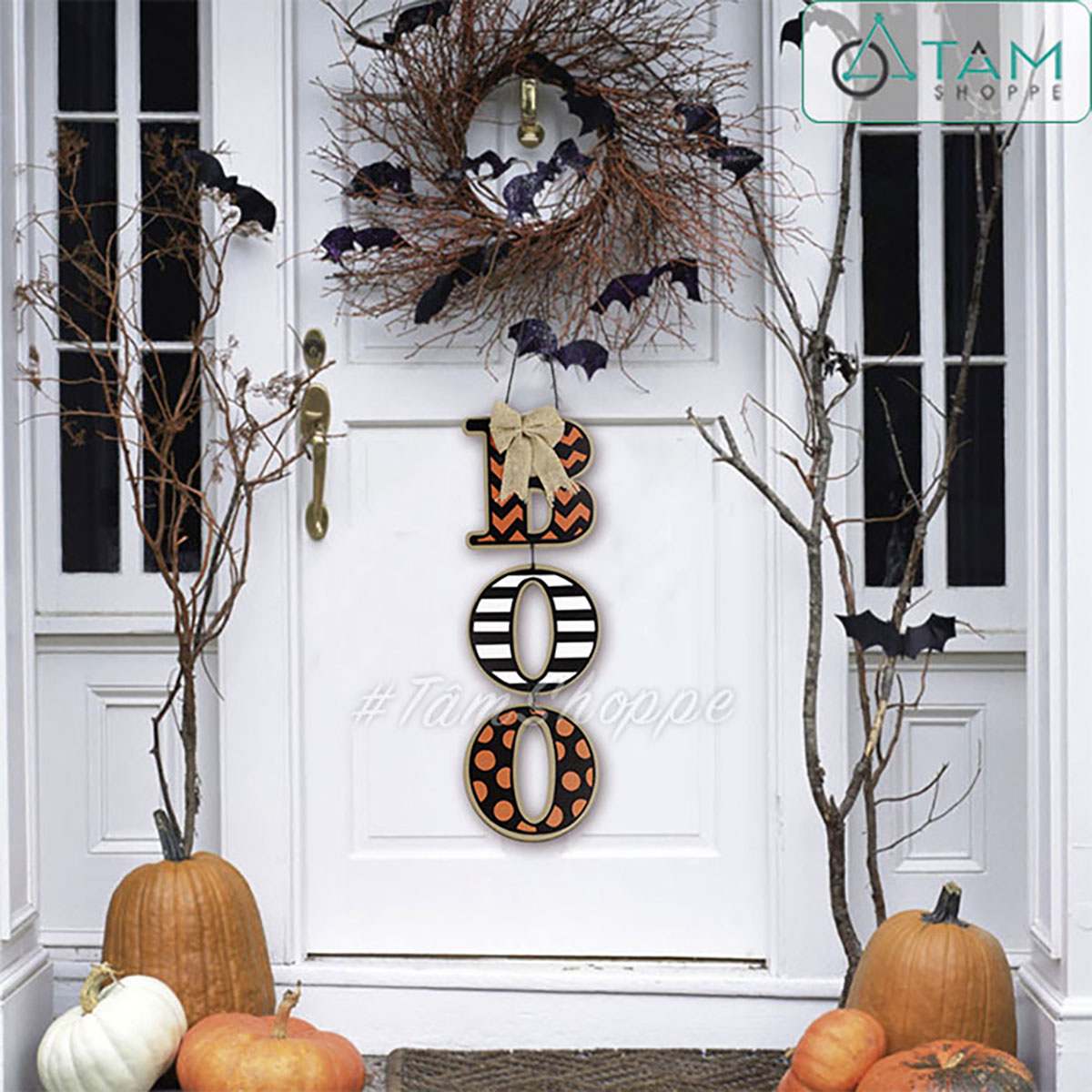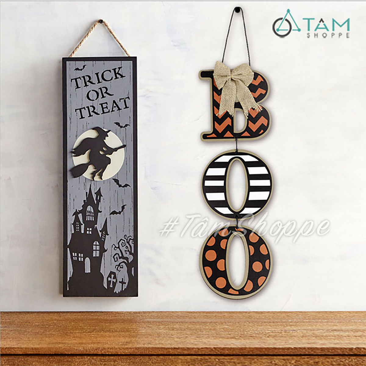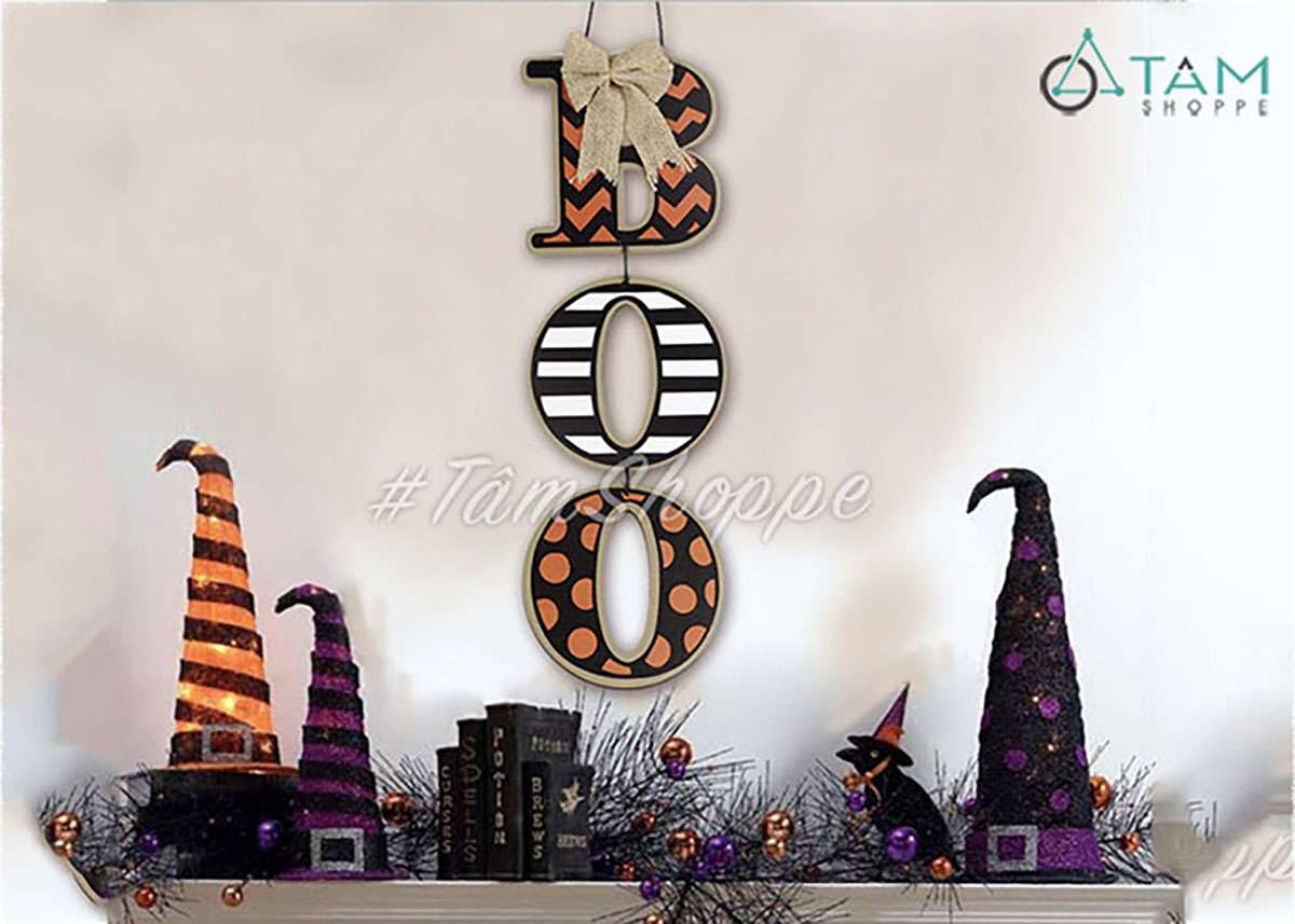 Dây treo Halloween chữ BOO gỗ hoạ tiết [01 mặt - Dài 50cm] trang trí đẹp mắt.
