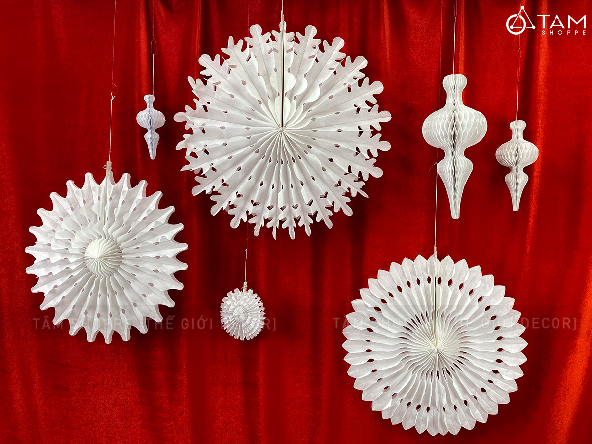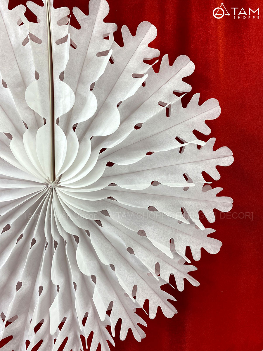 Giấy xếp Bông tuyết - Tuyết nhũ Trắng (Nhiều kiểu - Nhiều Size) trang trí đẹp mắt. Đồ trang trí lễ hội là các vật dụng, phụ kiện, hoặc mô hình được dùng để trang hoàng không gian trong dịp lễ hội (Noel, Tết, Trung Thu...), nhằm tạo nên không khí ấm áp, vui tươi và mang đậm sắc màu lễ hội.