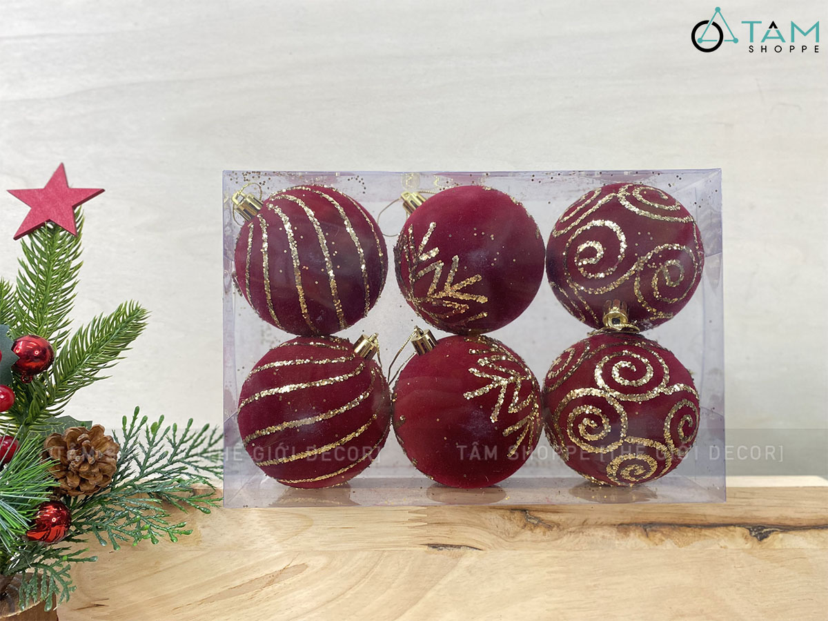 Hộp 06 Trái châu Noel phun nhung Đỏ kim tuyến Vàng ĐK 8cm [Nhiều kiểu - Sang Xịn] trang trí đẹp mắt
