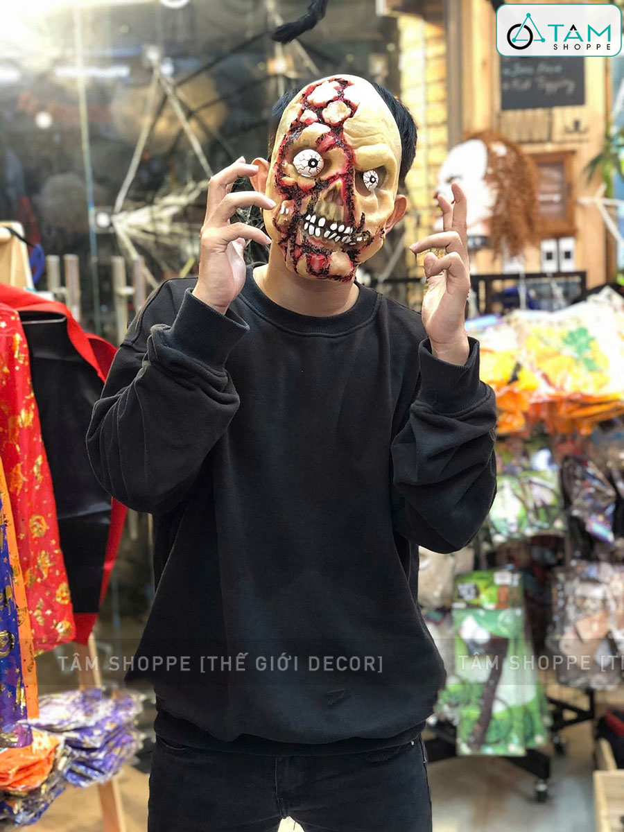 Mặt nạ zombie dây máu [Cao su - Kinh dị] hoá trang đẹp mắt. Đồ hoá trang Halloween là những trang phục, phụ kiện và đạo cụ dùng để biến hoá thành các nhân vật đặc trưng của lễ hội Halloween. Mục đích là tạo vẻ ngoài kỳ bí, rùng rợn hoặc vui nhộn, phù hợp với không khí lễ hội.