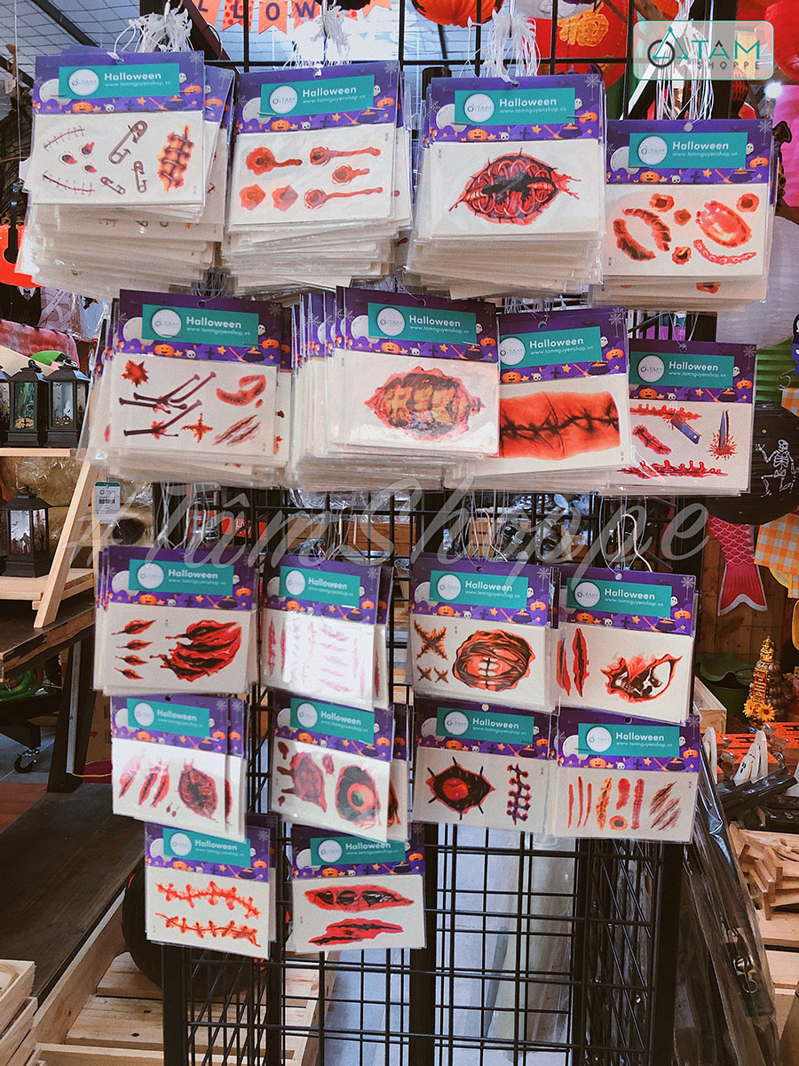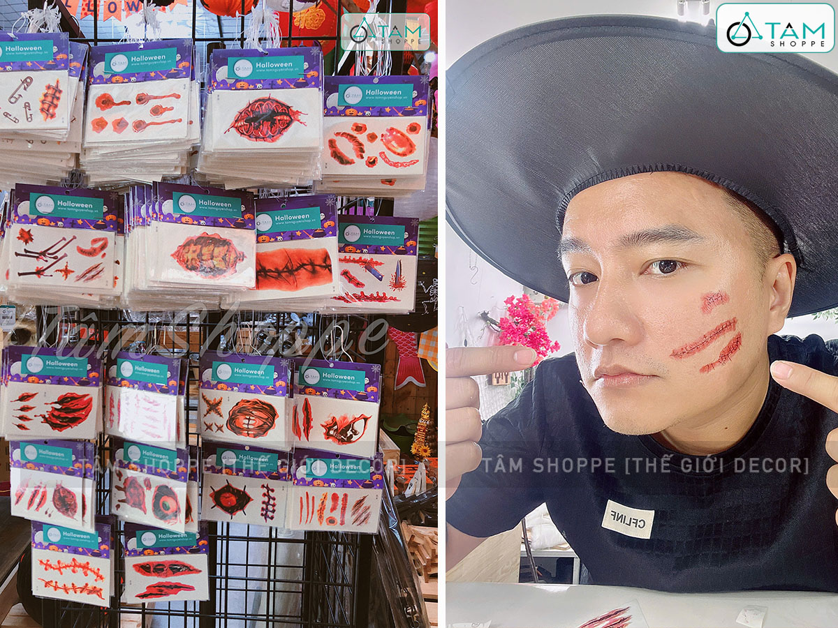 Miếng dán hình xăm giả sẹo, hoạ tiết hoá trang [Nhiều kiểu - Dễ dán] hoá trang đẹp mắt. Đồ hoá trang Halloween là những trang phục, phụ kiện và đạo cụ dùng để biến hoá thành các nhân vật đặc trưng của lễ hội Halloween. Mục đích là tạo vẻ ngoài kỳ bí, rùng rợn hoặc vui nhộn, phù hợp với không khí lễ hội.