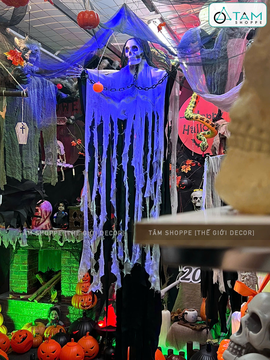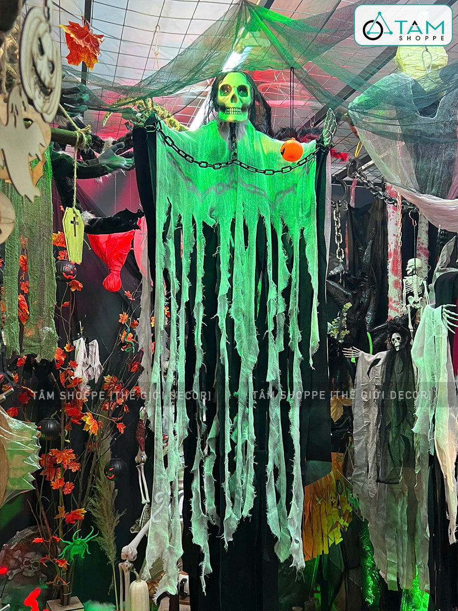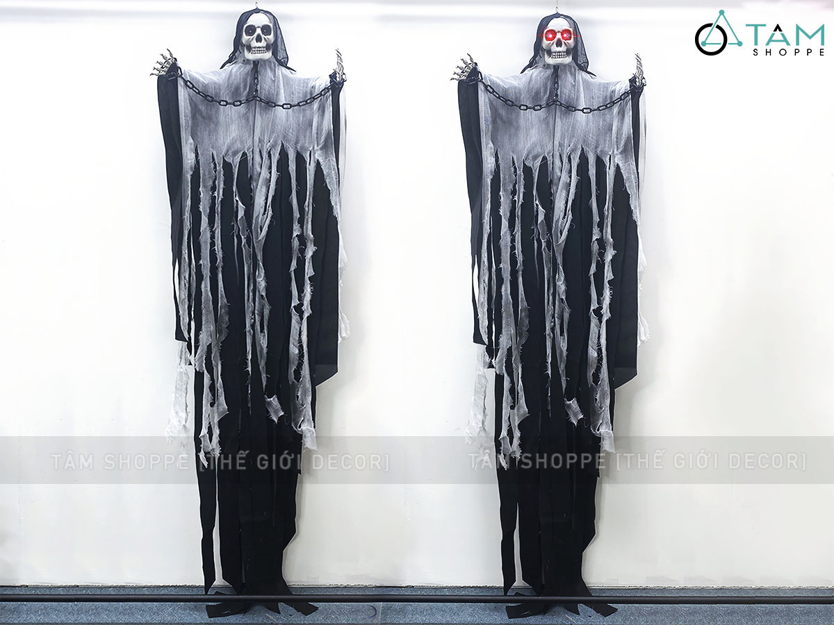 Mô hình con ma đeo xích điện tử gào thét dài 200cm [Mắt led - Cảm ứng tiếng động] trang trí đẹp mắt. Đồ trang trí Halloween là những vật dụng, mô hình hoặc phụ kiện được dùng để tạo không khí rùng rợn, huyền bí, vui nhộn đặc trưng cho ngày lễ Halloween (31/10).