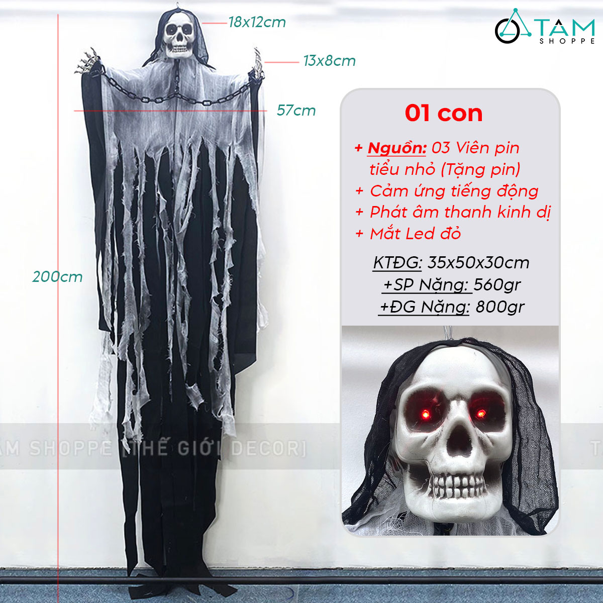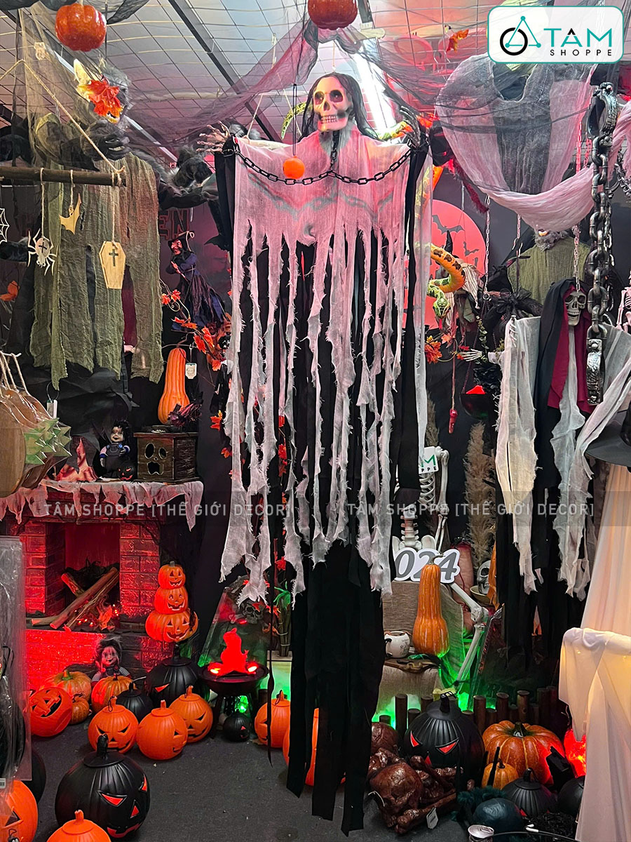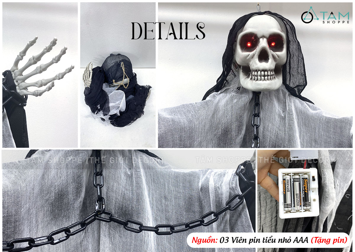 Mô hình con ma đeo xích điện tử gào thét dài 200cm [Mắt led - Cảm ứng tiếng động] trang trí đẹp mắt. Đồ trang trí Halloween là những vật dụng, mô hình hoặc phụ kiện được dùng để tạo không khí rùng rợn, huyền bí, vui nhộn đặc trưng cho ngày lễ Halloween (31/10).