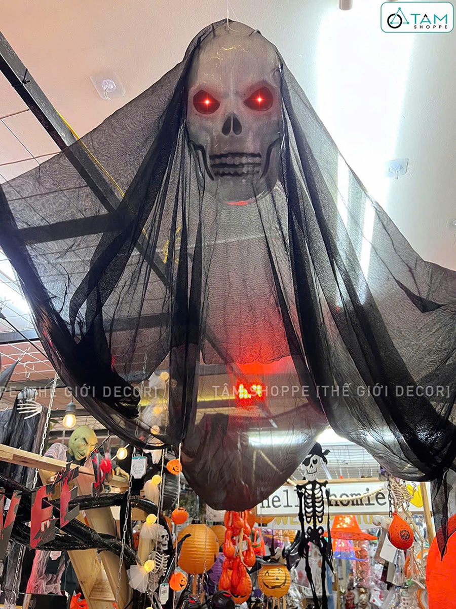 Mô hình con ma vải đu dây bay bay dài 3m [Mắt Led - Cảm ứng phát âm thanh] trang trí đẹp mắt. Đồ trang trí Halloween là những vật dụng, mô hình hoặc phụ kiện được dùng để tạo không khí rùng rợn, huyền bí, vui nhộn đặc trưng cho ngày lễ Halloween (31/10).