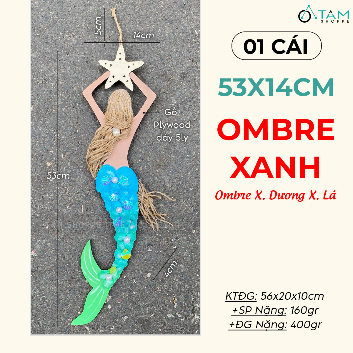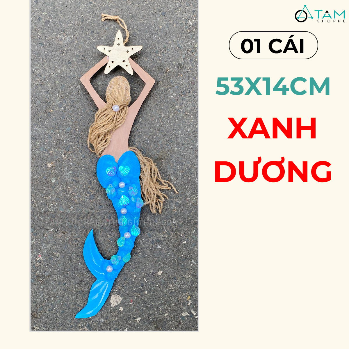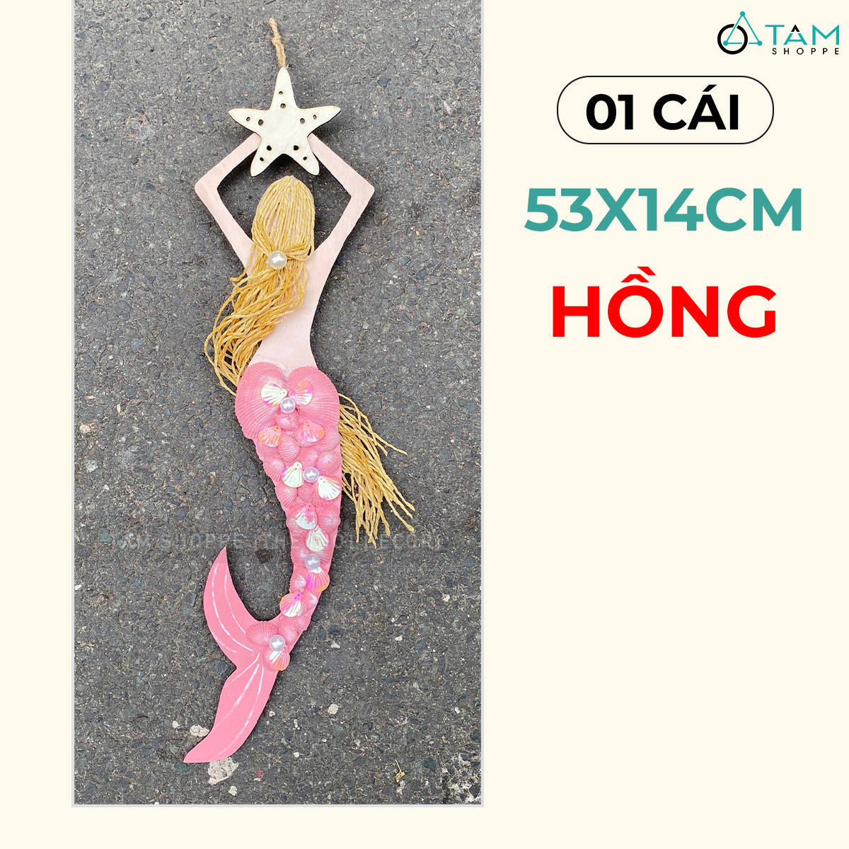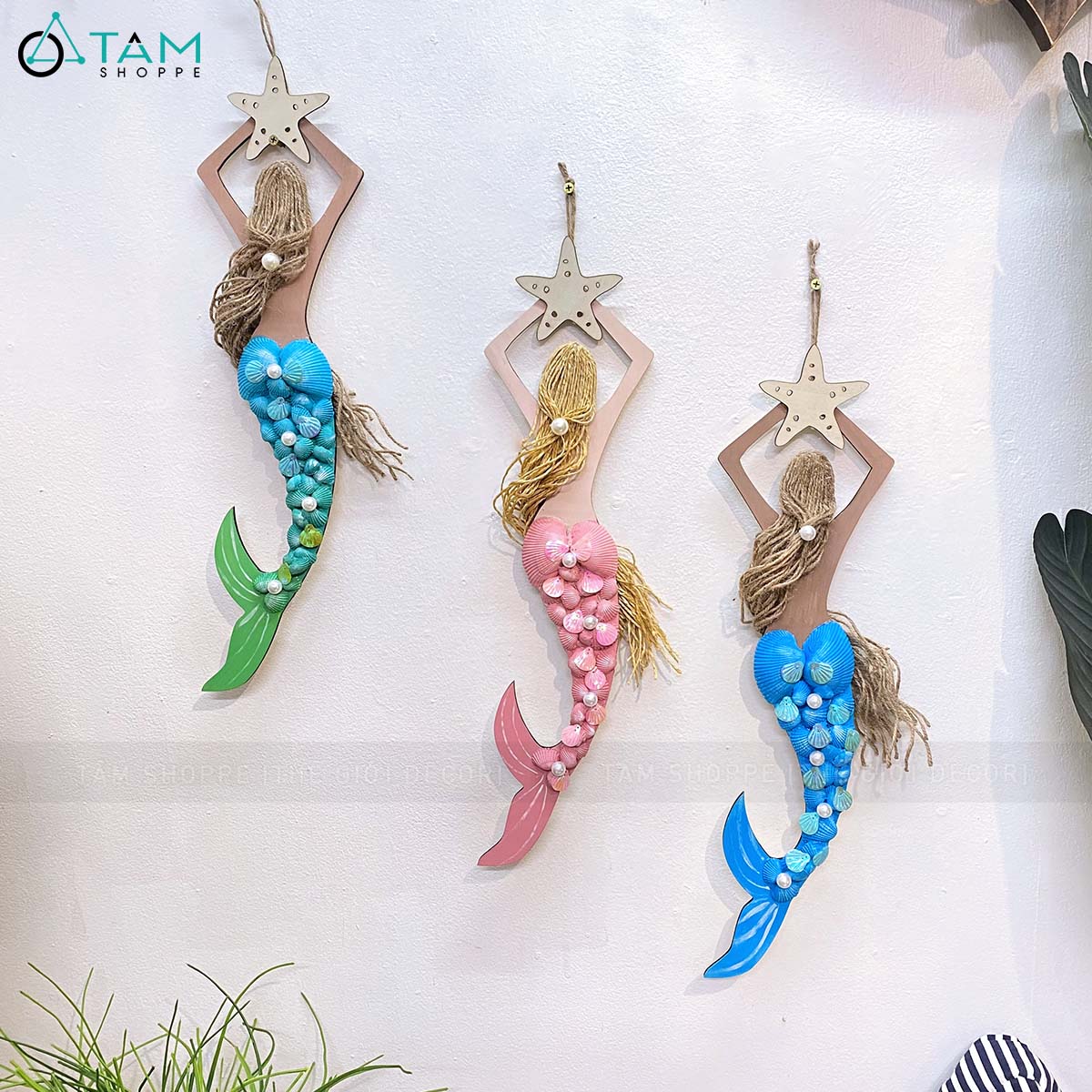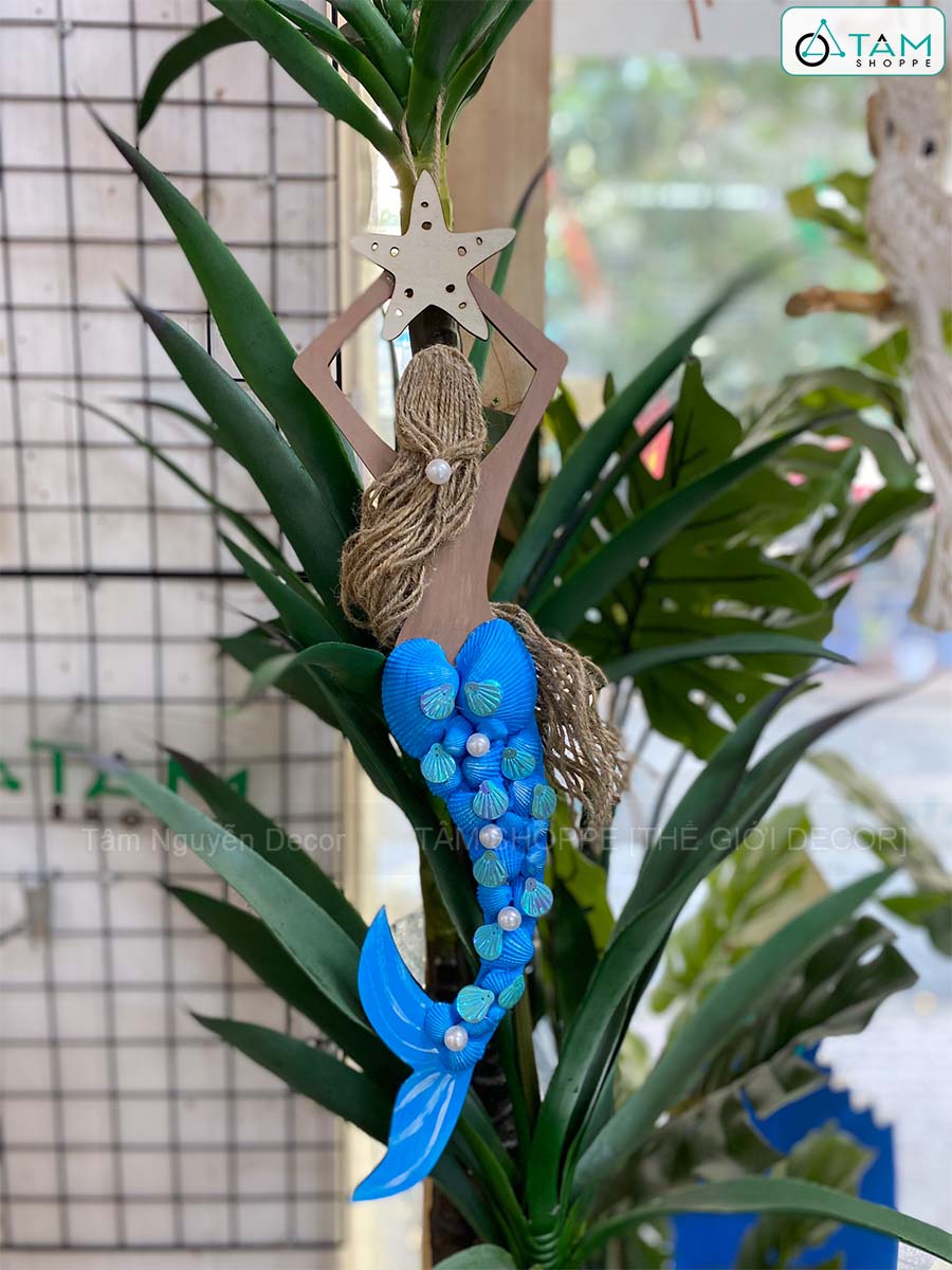 Mô hình Nàng tiên cá Handmade vỏ sò ốc [Bằng gỗ - 3 màu] KT53x14cm trang trí đẹp mắt.
