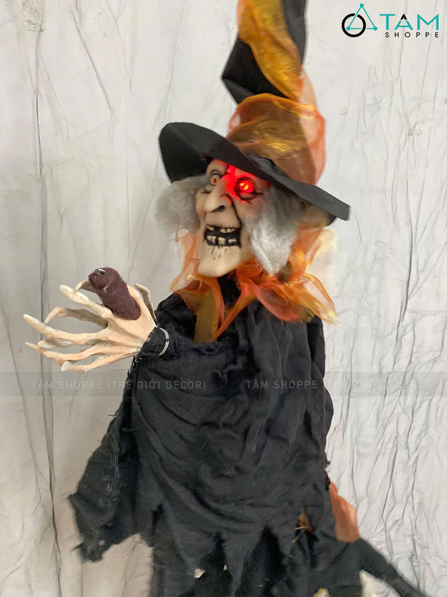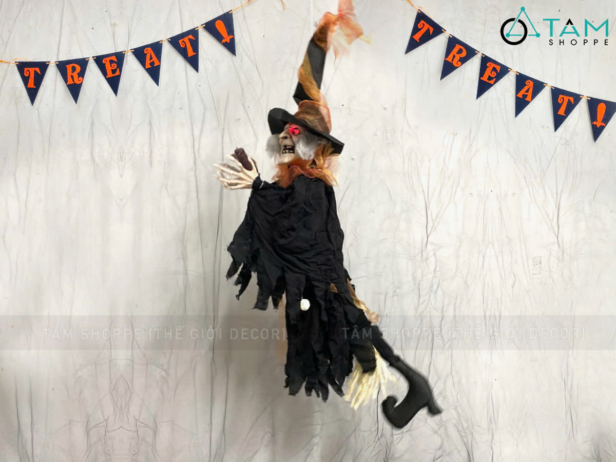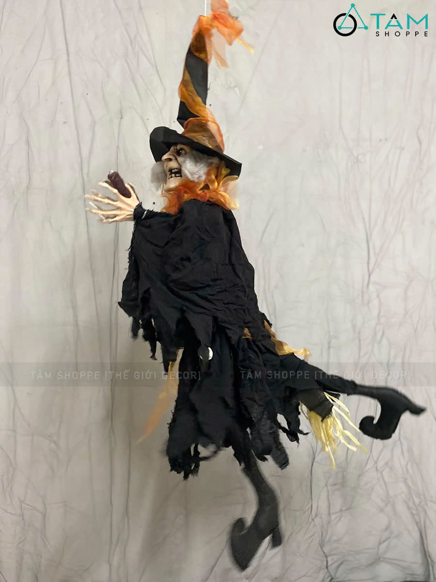 Mô hình phù thuỷ đen cưỡi chổi giãy dụa [Điện tử - Cảm ứng] trang trí đẹp mắt. Đồ trang trí Halloween là những vật dụng, mô hình hoặc phụ kiện được dùng để tạo không khí rùng rợn, huyền bí, vui nhộn đặc trưng cho ngày lễ Halloween (31/10).