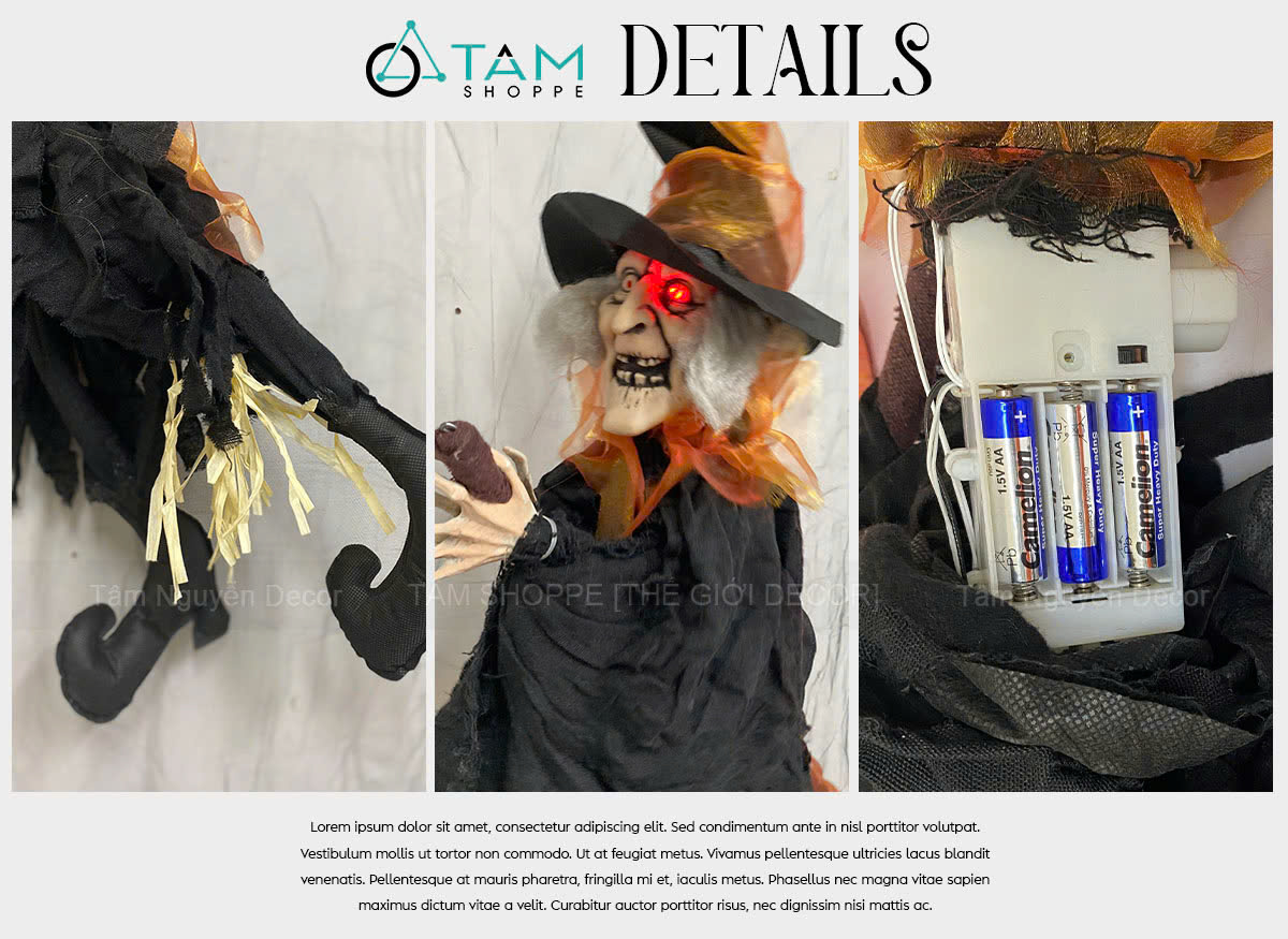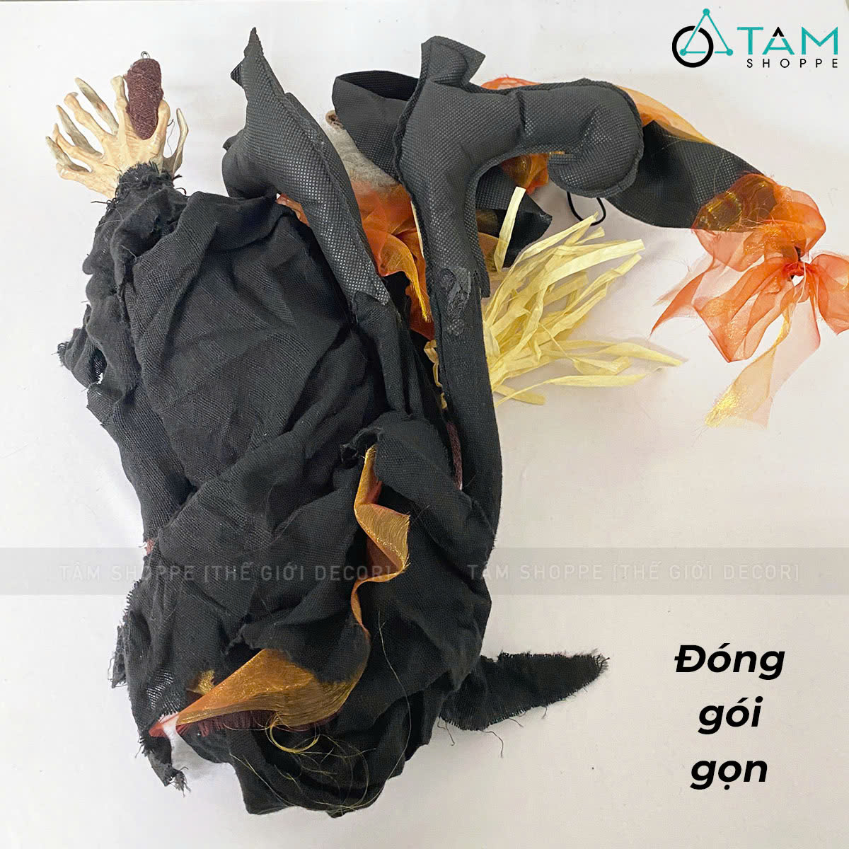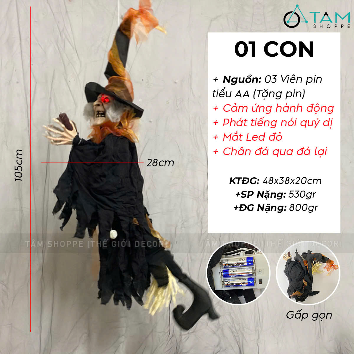 Mô hình phù thuỷ đen cưỡi chổi giãy dụa [Điện tử - Cảm ứng] trang trí đẹp mắt. Đồ trang trí Halloween là những vật dụng, mô hình hoặc phụ kiện được dùng để tạo không khí rùng rợn, huyền bí, vui nhộn đặc trưng cho ngày lễ Halloween (31/10).