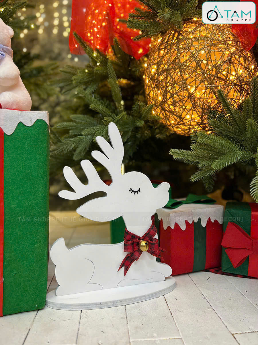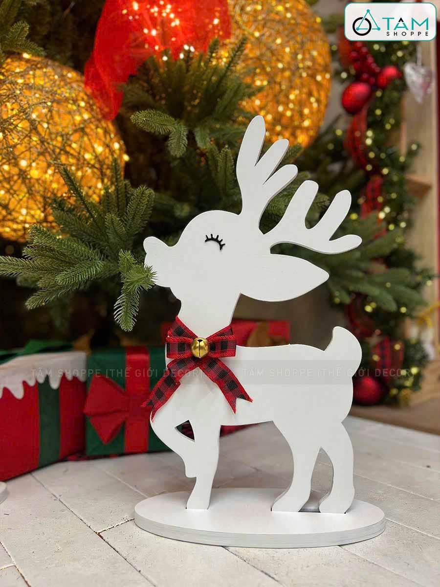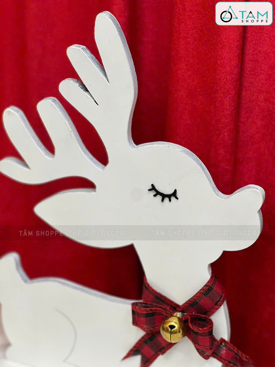 Mô hình tuần lộc trắng đeo nơ lục lạc [Bằng gỗ] trang trí đẹp mắt