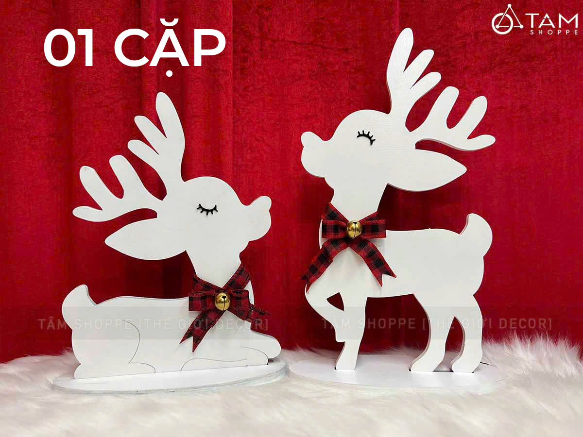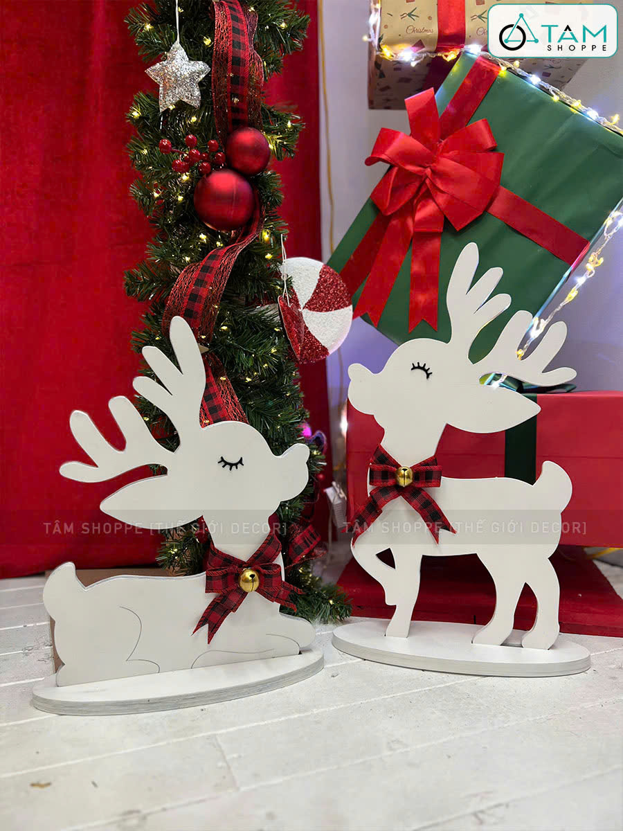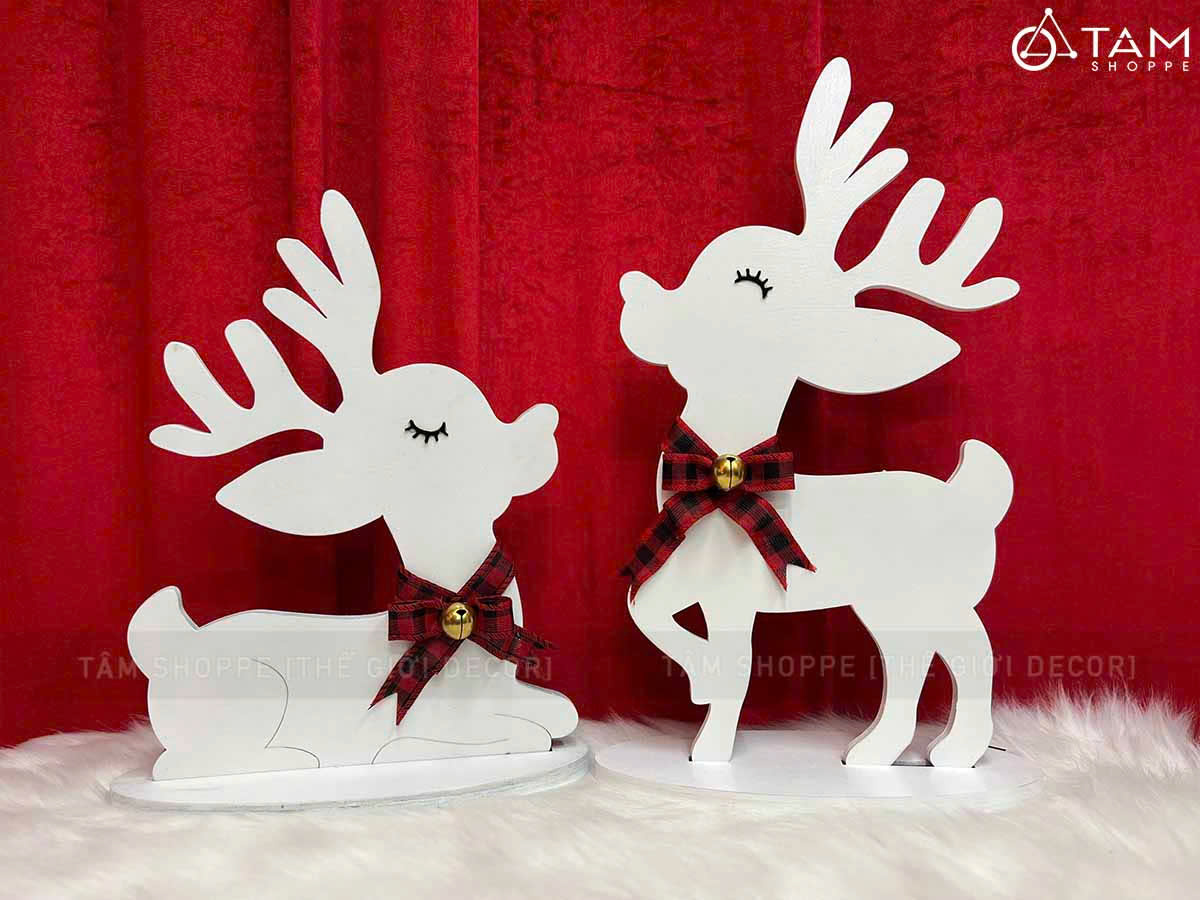 Mô hình tuần lộc trắng đeo nơ lục lạc [Bằng gỗ] trang trí đẹp mắt