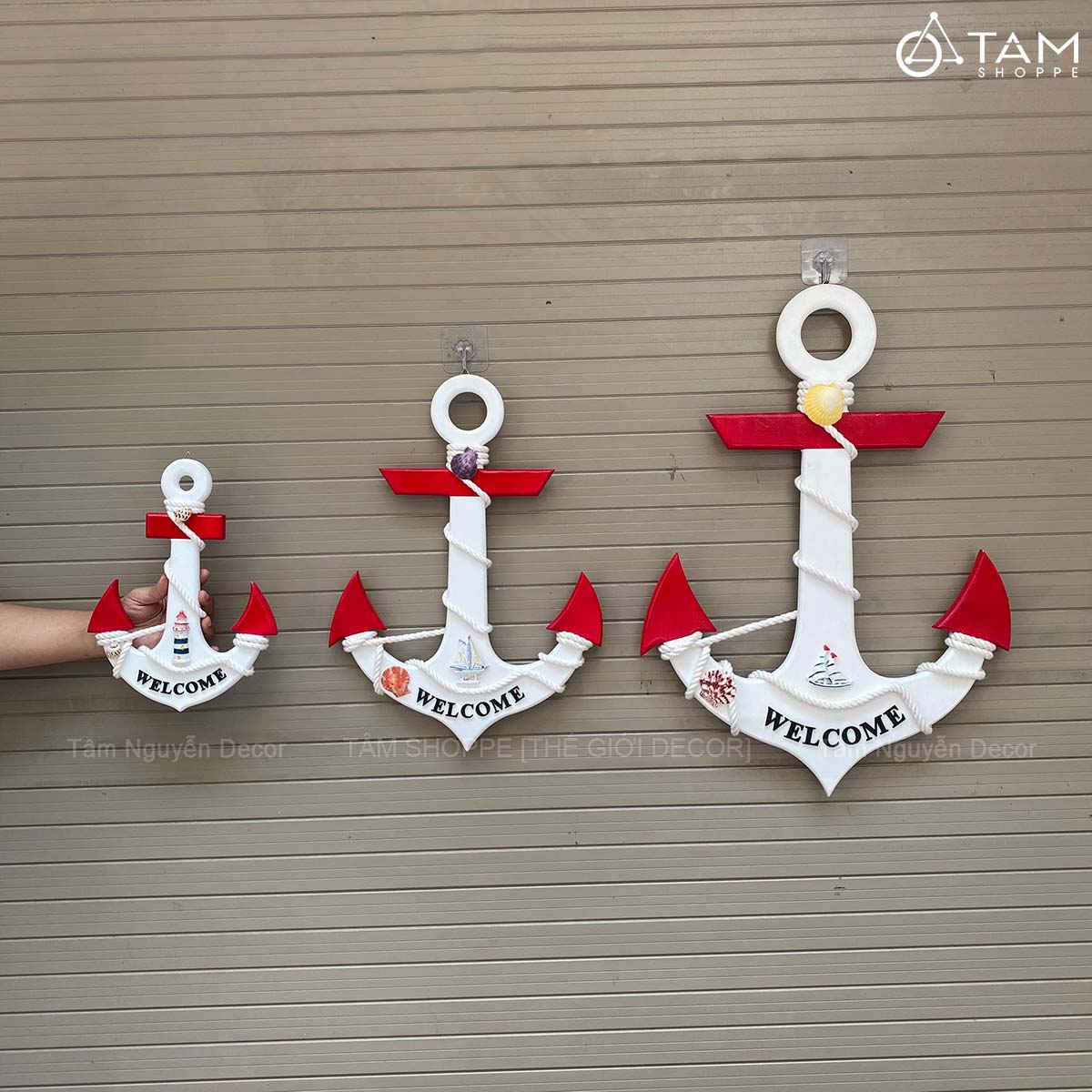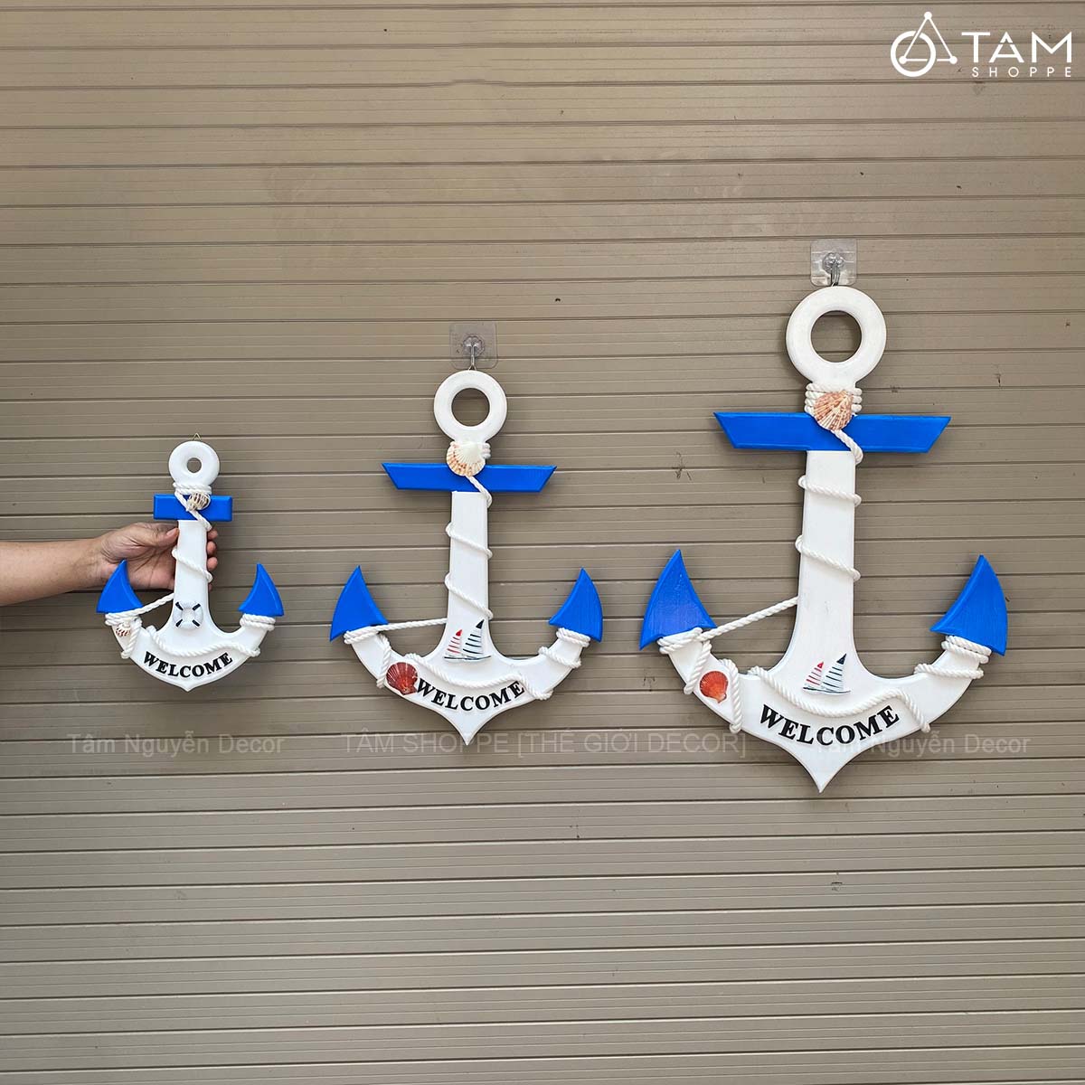 Mỏ neo gỗ Welcome quấn dây thừng đính phụ kiện [3 Size - 2 màu] C32-50-67cm trang trí đẹp mắt.