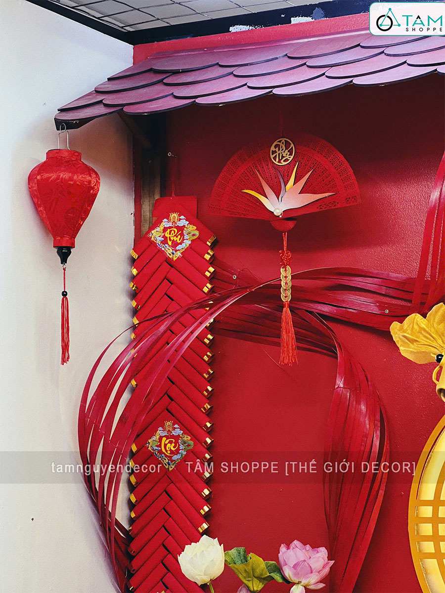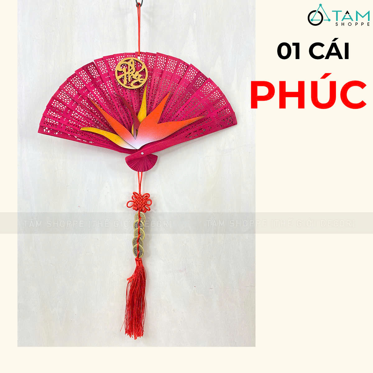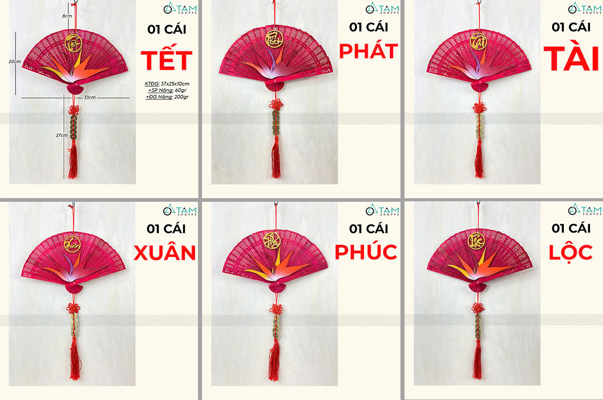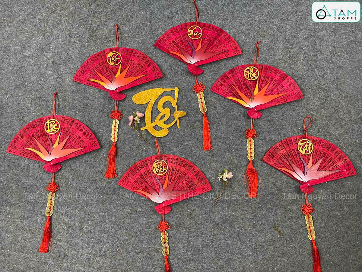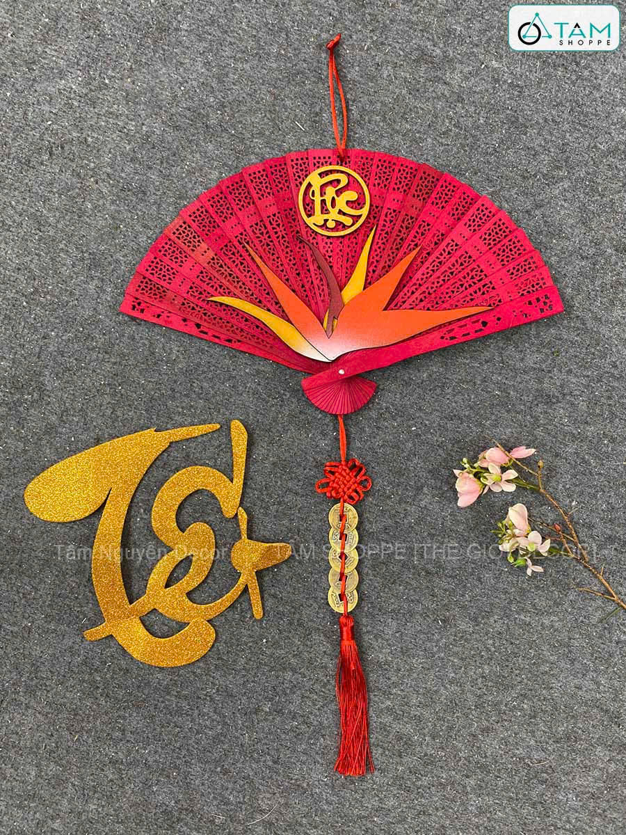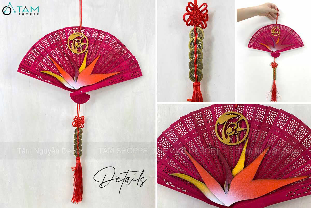Quạt đỏ hoa Thiên Điểu treo trang trí Tết [Đa dạng chữ - Quạt gỗ] trang trí đẹp mắt. Đồ trang trí Tết là các vật dụng, phụ kiện, hoặc mô hình được dùng để trang hoàng không gian trong dịp lễ, nhằm tạo nên không khí ấm áp, vui tươi và mang đậm sắc màu lễ hội.