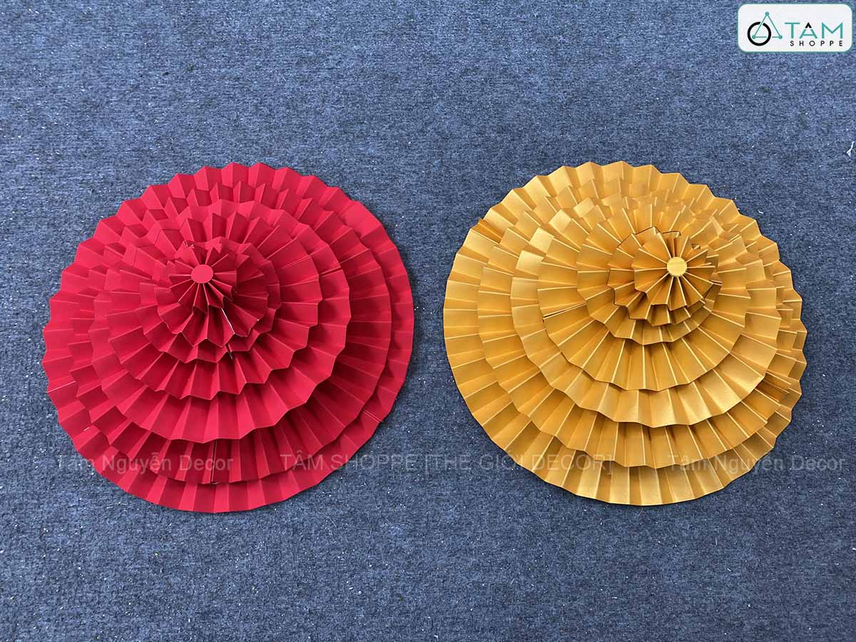 Quạt giấy nhung xịn có nếp Vàng Đỏ [Nhiều cỡ - Cao cấp] trang trí đẹp mắt. Đồ trang trí Tết là các vật dụng, phụ kiện, hoặc mô hình được dùng để trang hoàng không gian trong dịp lễ, nhằm tạo nên không khí ấm áp, vui tươi và mang đậm sắc màu lễ hội.