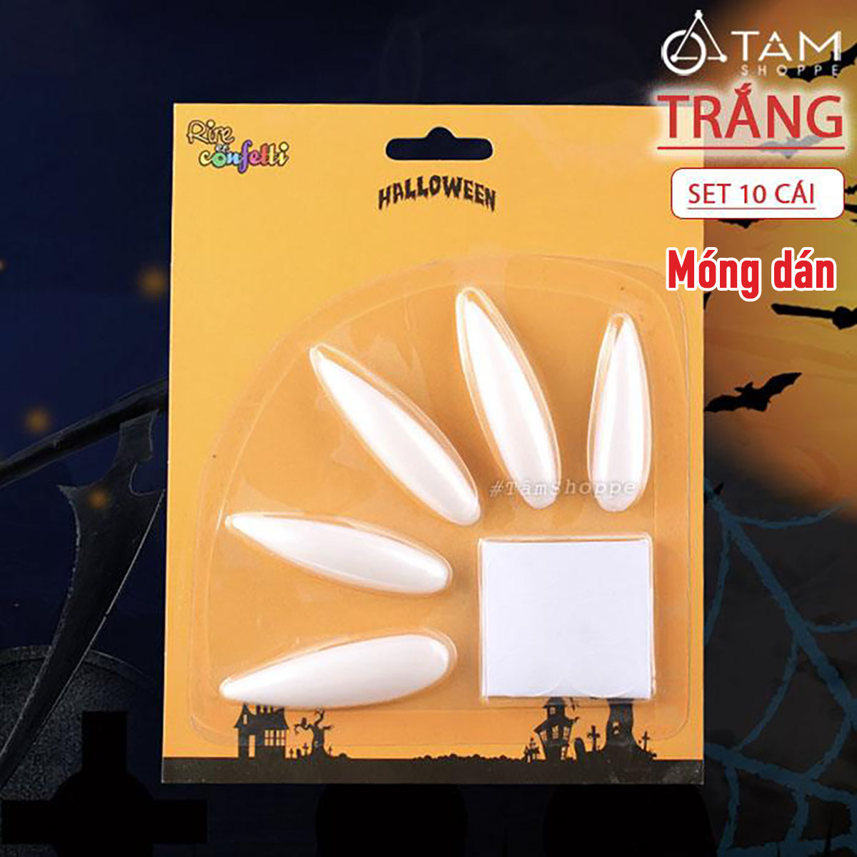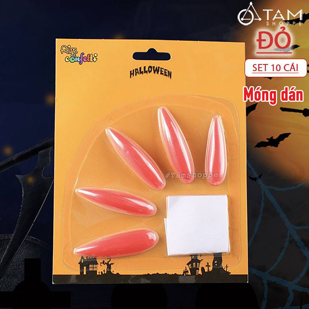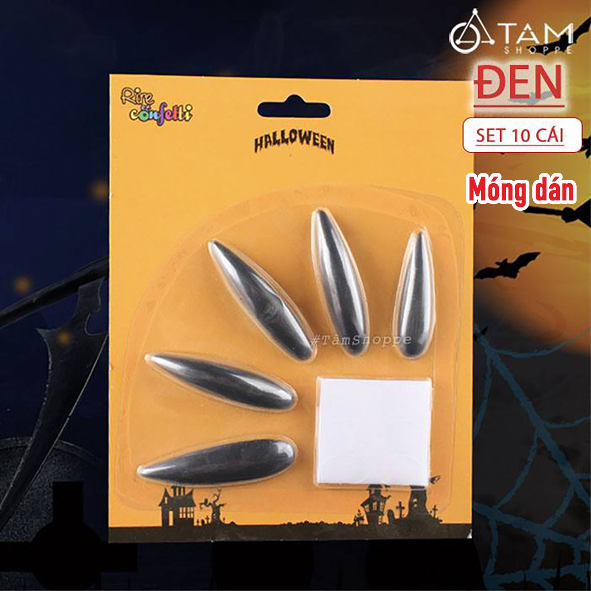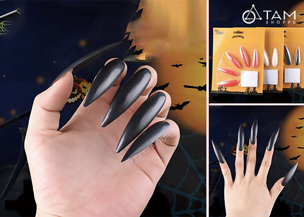 Set 10 móng tay nhọn hoá trang yêu tinh, ma quỷ [Kiểu dán/ chụp - Đủ màu] hoá trang đẹp mắt. Đồ hoá trang Halloween là những trang phục, phụ kiện và đạo cụ dùng để biến hoá thành các nhân vật đặc trưng của lễ hội Halloween. Mục đích là tạo vẻ ngoài kỳ bí, rùng rợn hoặc vui nhộn, phù hợp với không khí lễ hội.