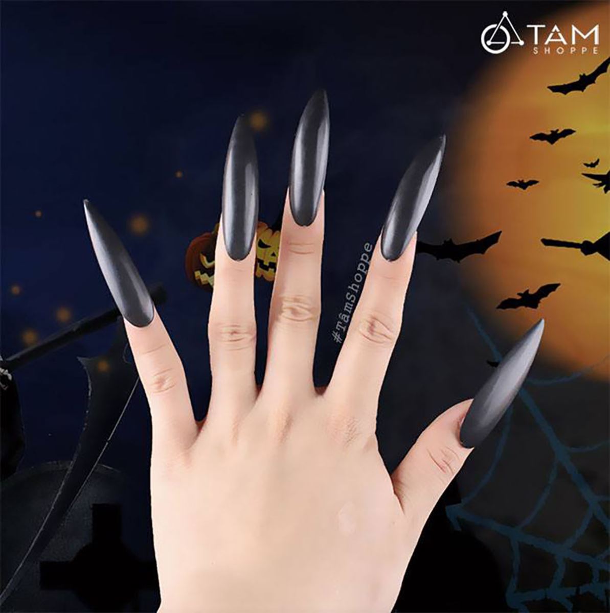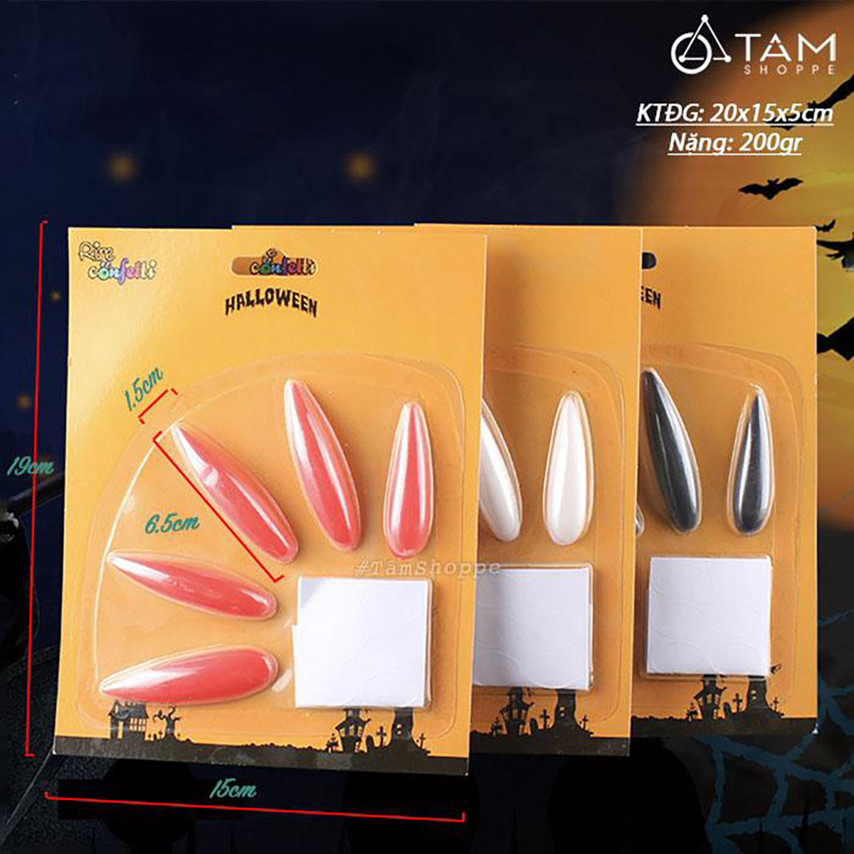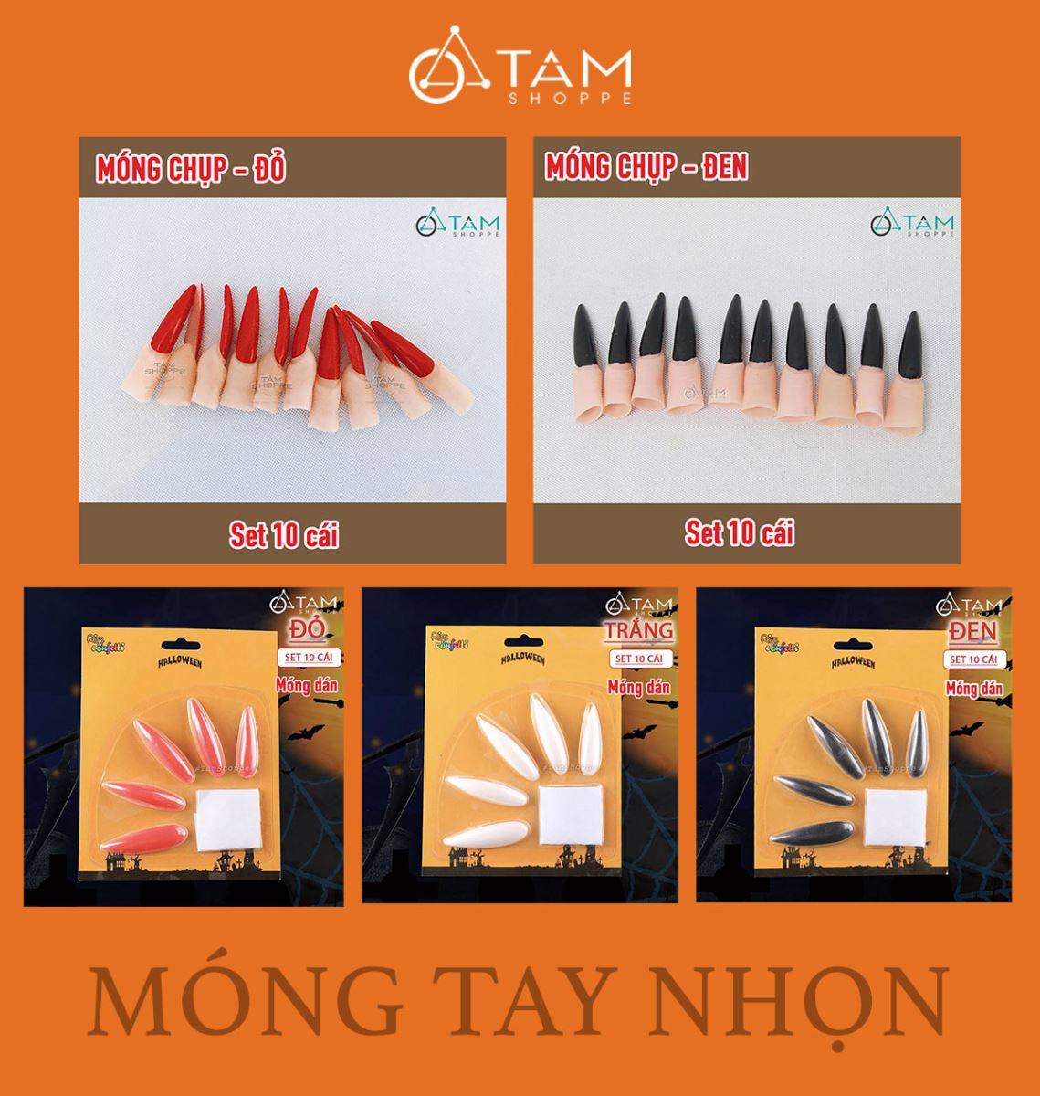 Set 10 móng tay nhọn hoá trang yêu tinh, ma quỷ [Kiểu dán/ chụp - Đủ màu] hoá trang đẹp mắt. Đồ hoá trang Halloween là những trang phục, phụ kiện và đạo cụ dùng để biến hoá thành các nhân vật đặc trưng của lễ hội Halloween. Mục đích là tạo vẻ ngoài kỳ bí, rùng rợn hoặc vui nhộn, phù hợp với không khí lễ hội.