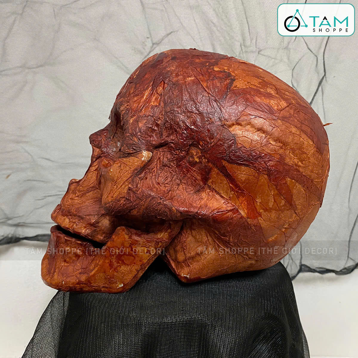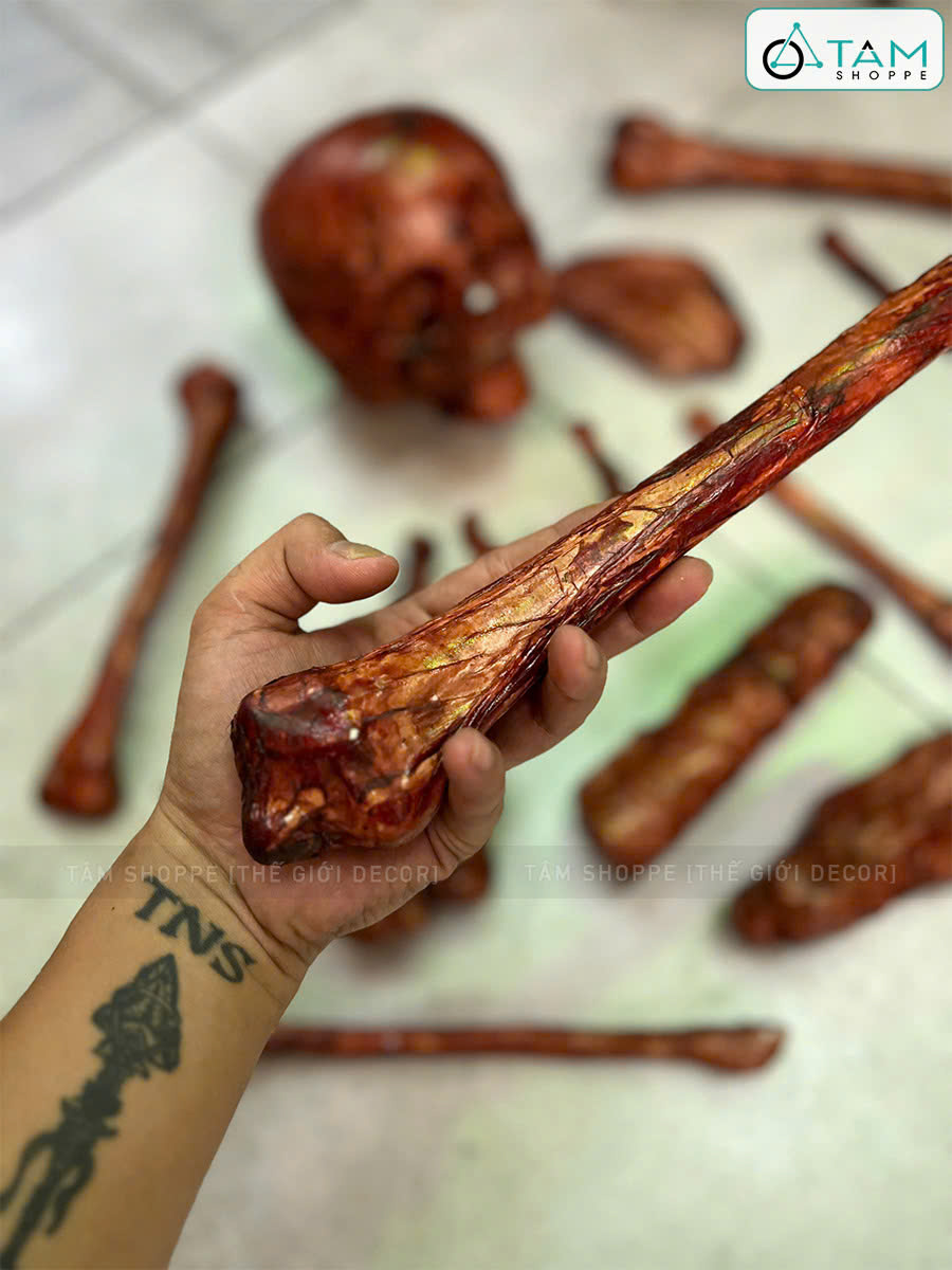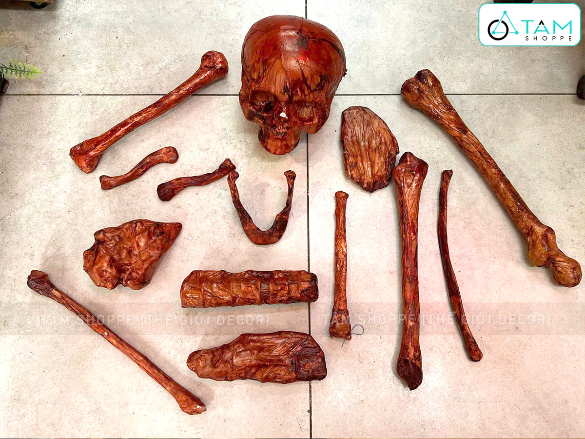 Mô hình xương làm bằng nhựa, quấn giấy mỏng bám sát và sơn màu giả máu khô trông kinh dị như thật.