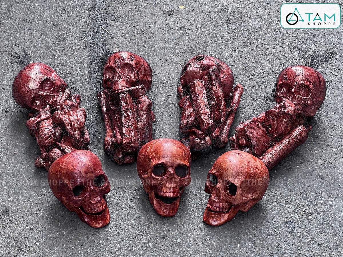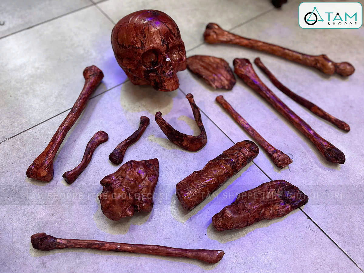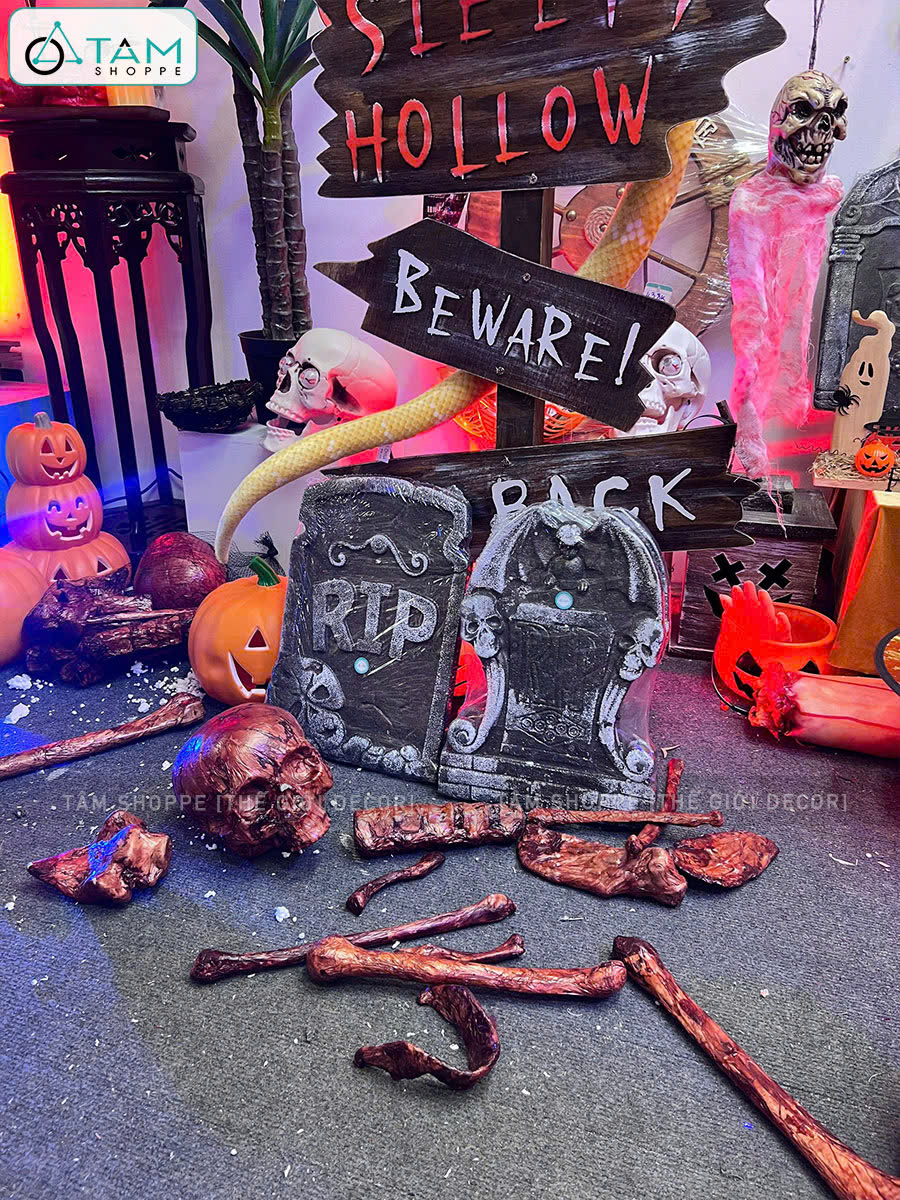 Mô hình xương người trang trí là món decor biểu tượng của Halloween, tượng trưng cho cái chết, linh hồn và thế giới tâm linh, thường được dùng để tạo không khí rùng rợn hoặc huyền bí cho không gian trang trí.