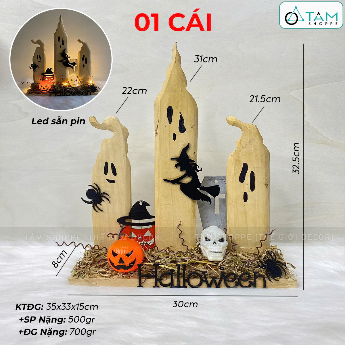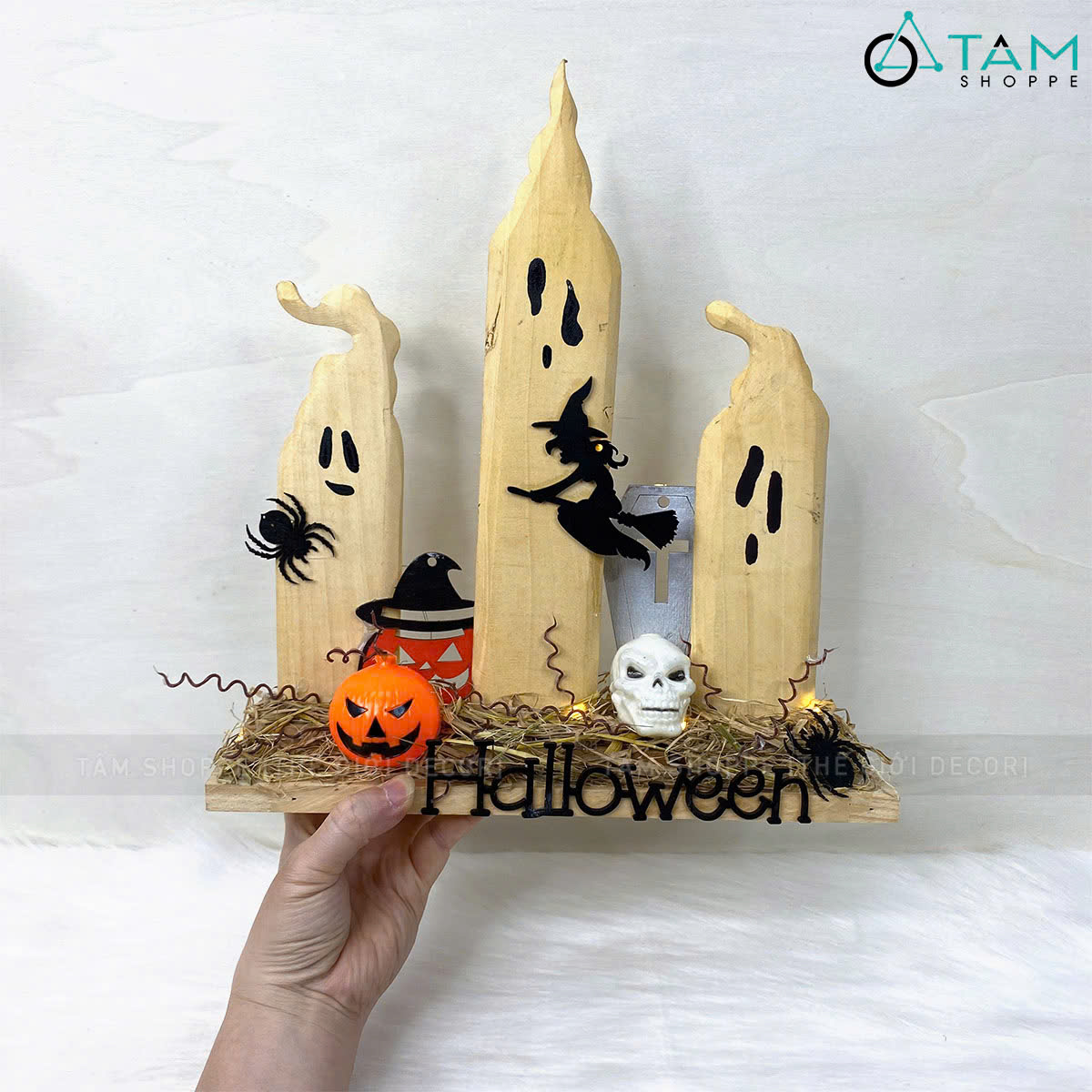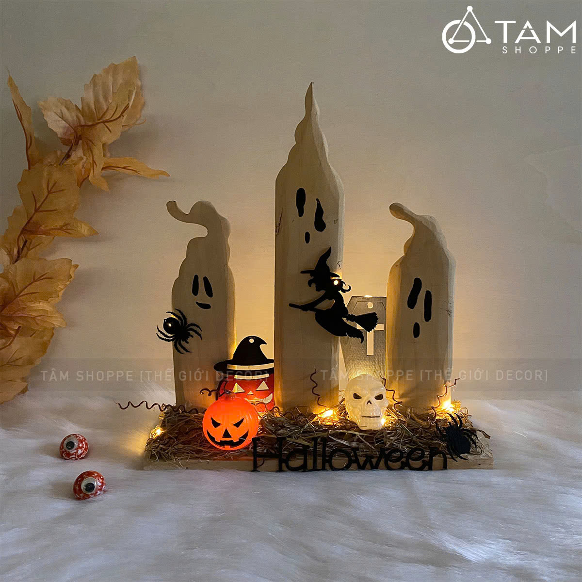 Tiểu cảnh để bàn HLW ba ma nến phù thuỷ [Bằng gỗ - có đèn] trang trí đẹp mắt.