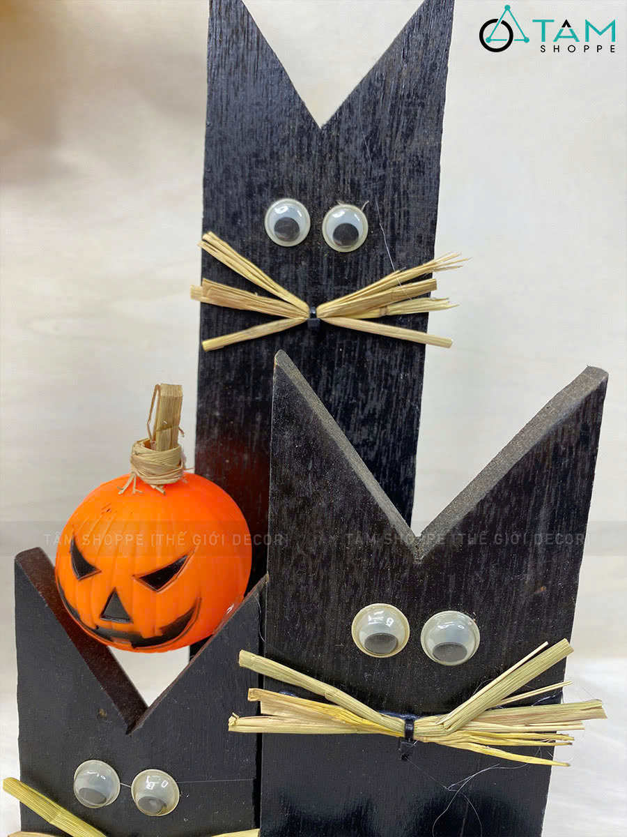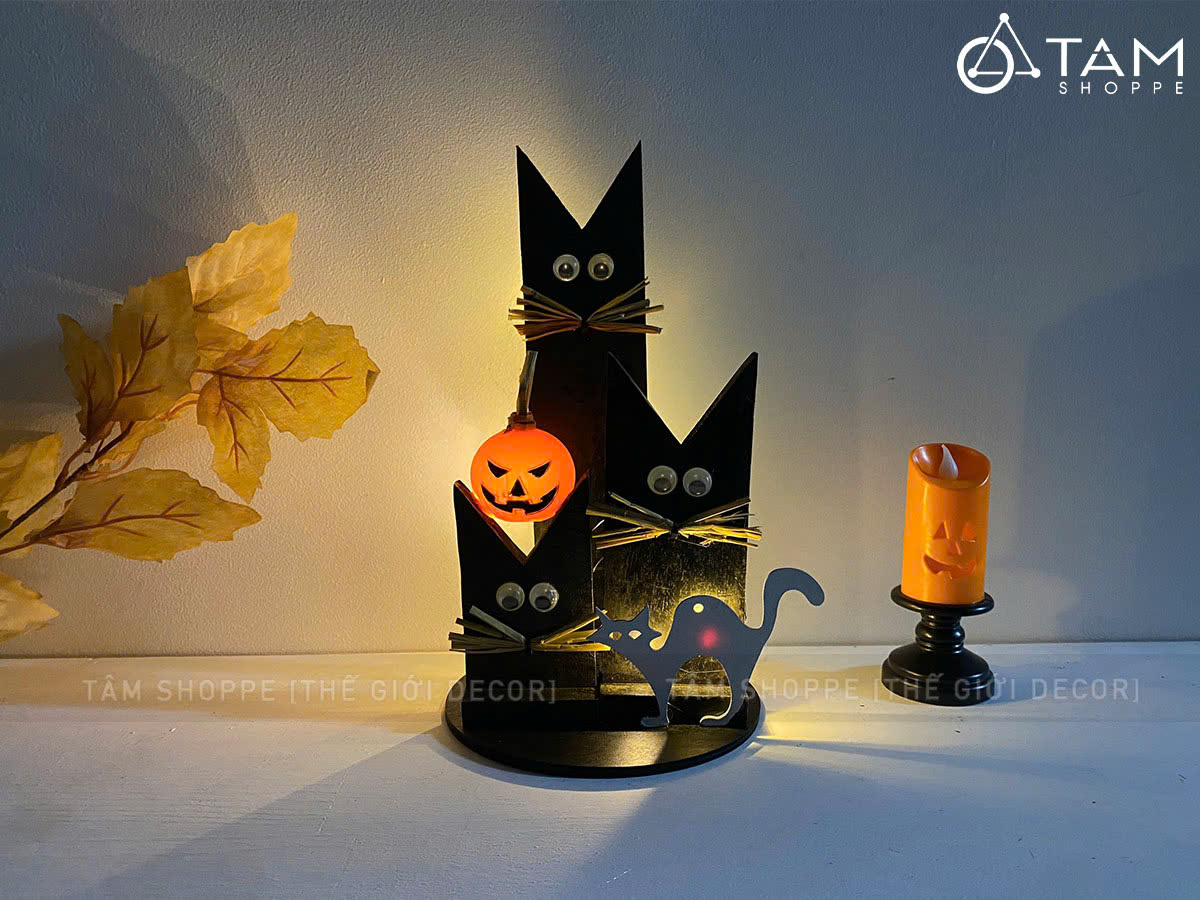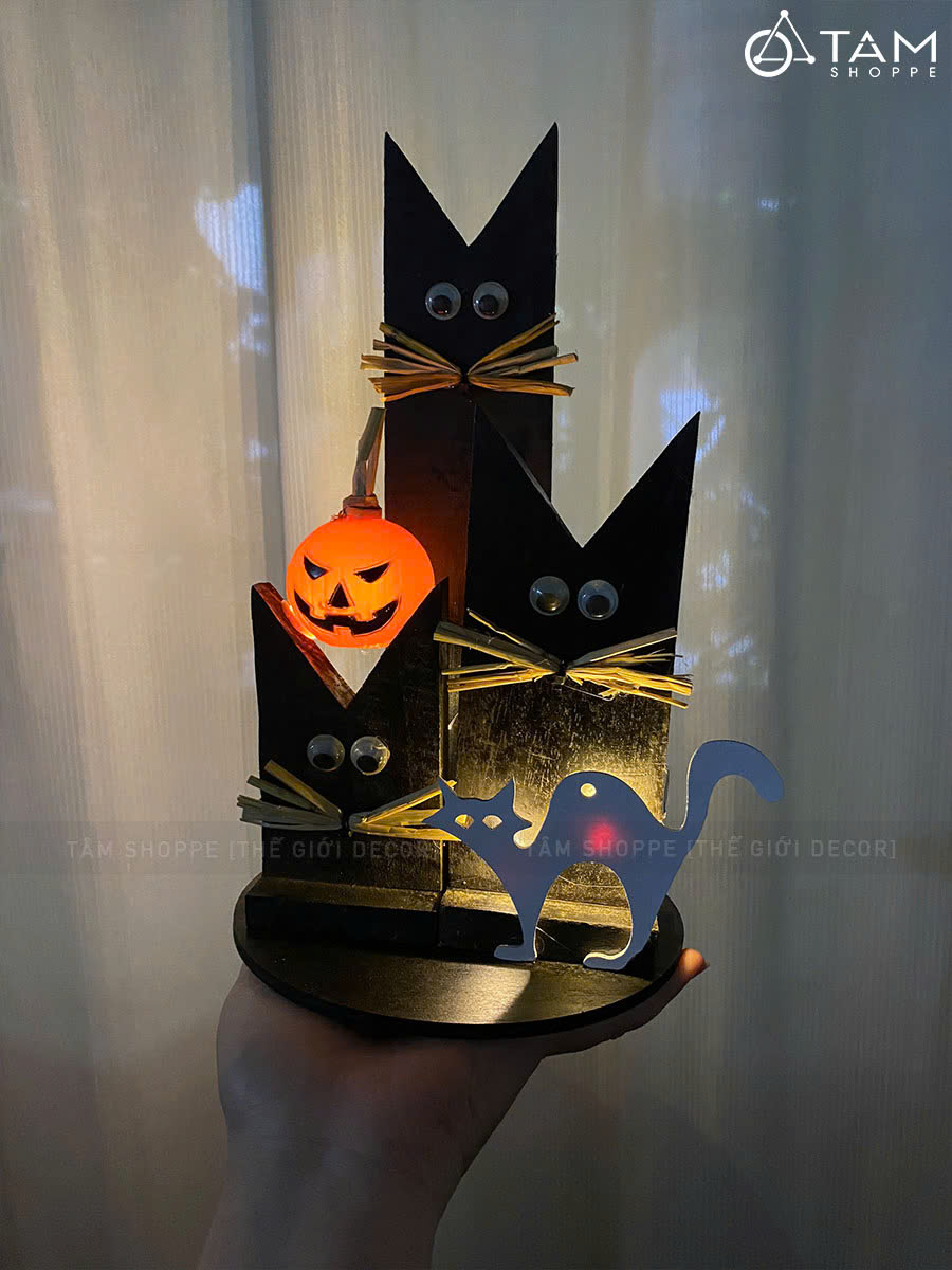 Tiểu cảnh để bàn HLW ba mèo đen tai nhọn [Bằng gỗ - có đèn] trang trí đẹp mắt. Đồ trang trí Halloween là những vật dụng, mô hình hoặc phụ kiện được dùng để tạo không khí rùng rợn, huyền bí, vui nhộn đặc trưng cho ngày lễ Halloween (31/10).