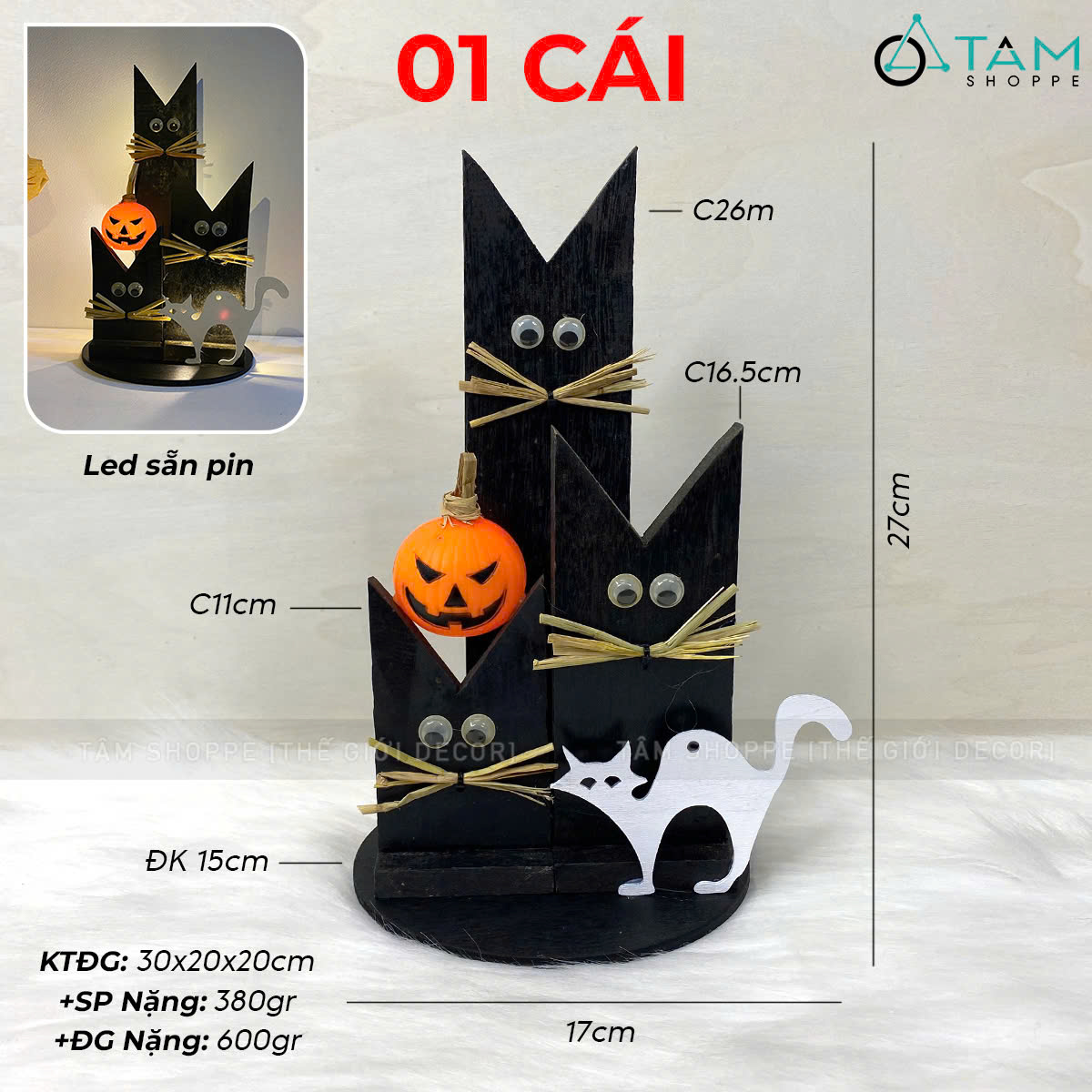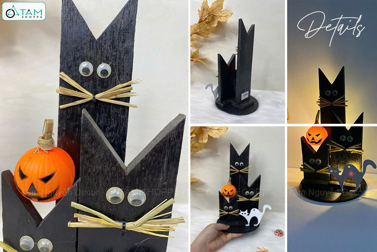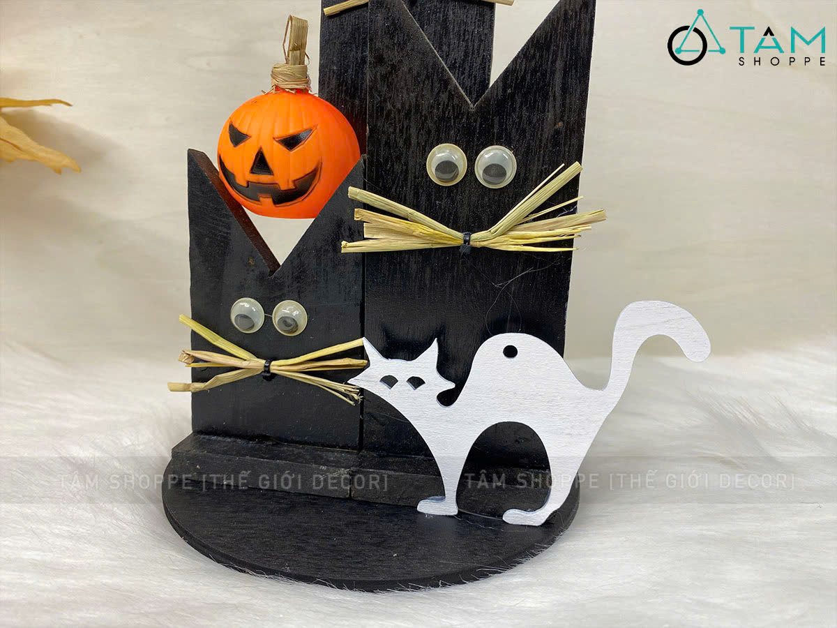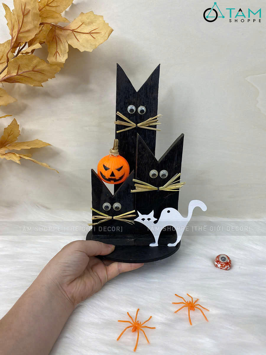 Tiểu cảnh để bàn HLW ba mèo đen tai nhọn [Bằng gỗ - có đèn] trang trí đẹp mắt. Đồ trang trí Halloween là những vật dụng, mô hình hoặc phụ kiện được dùng để tạo không khí rùng rợn, huyền bí, vui nhộn đặc trưng cho ngày lễ Halloween (31/10).