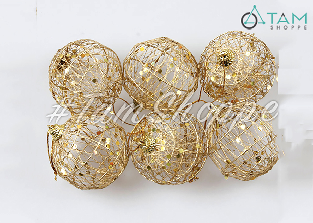 Hộp 06 trái châu Noel lưới kẽm vàng gold [2 cỡ - lấp lánh] trang trí đẹp mắt.
