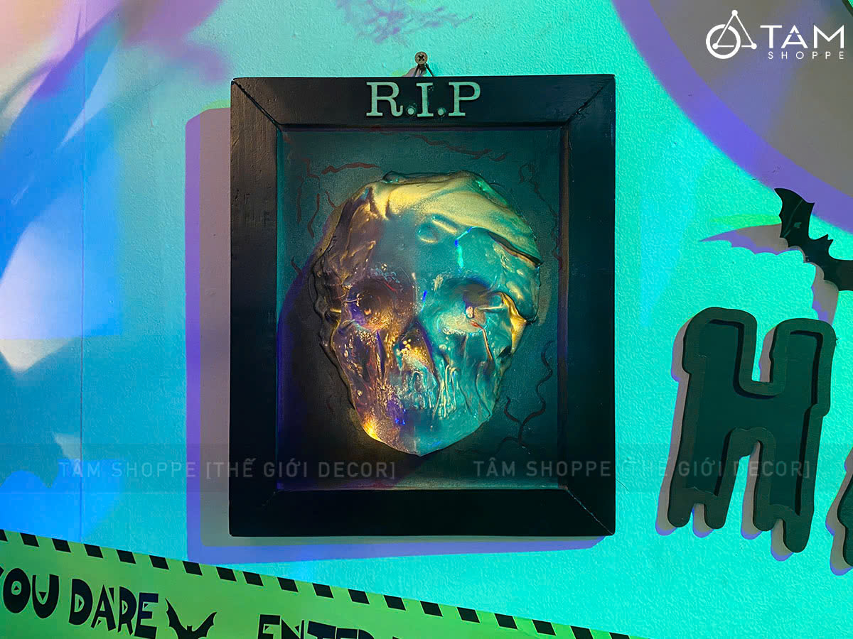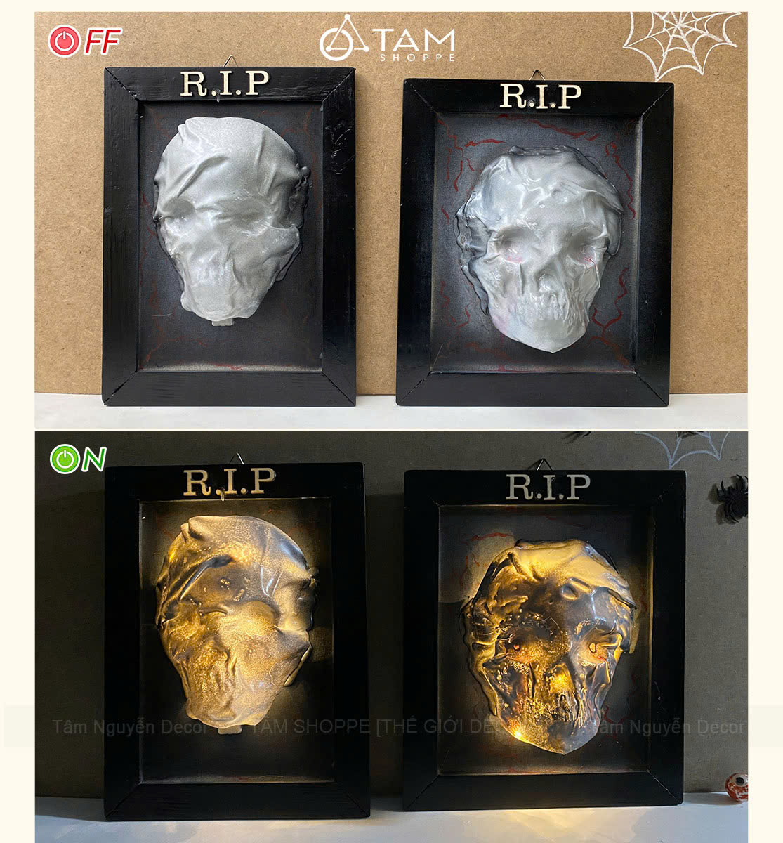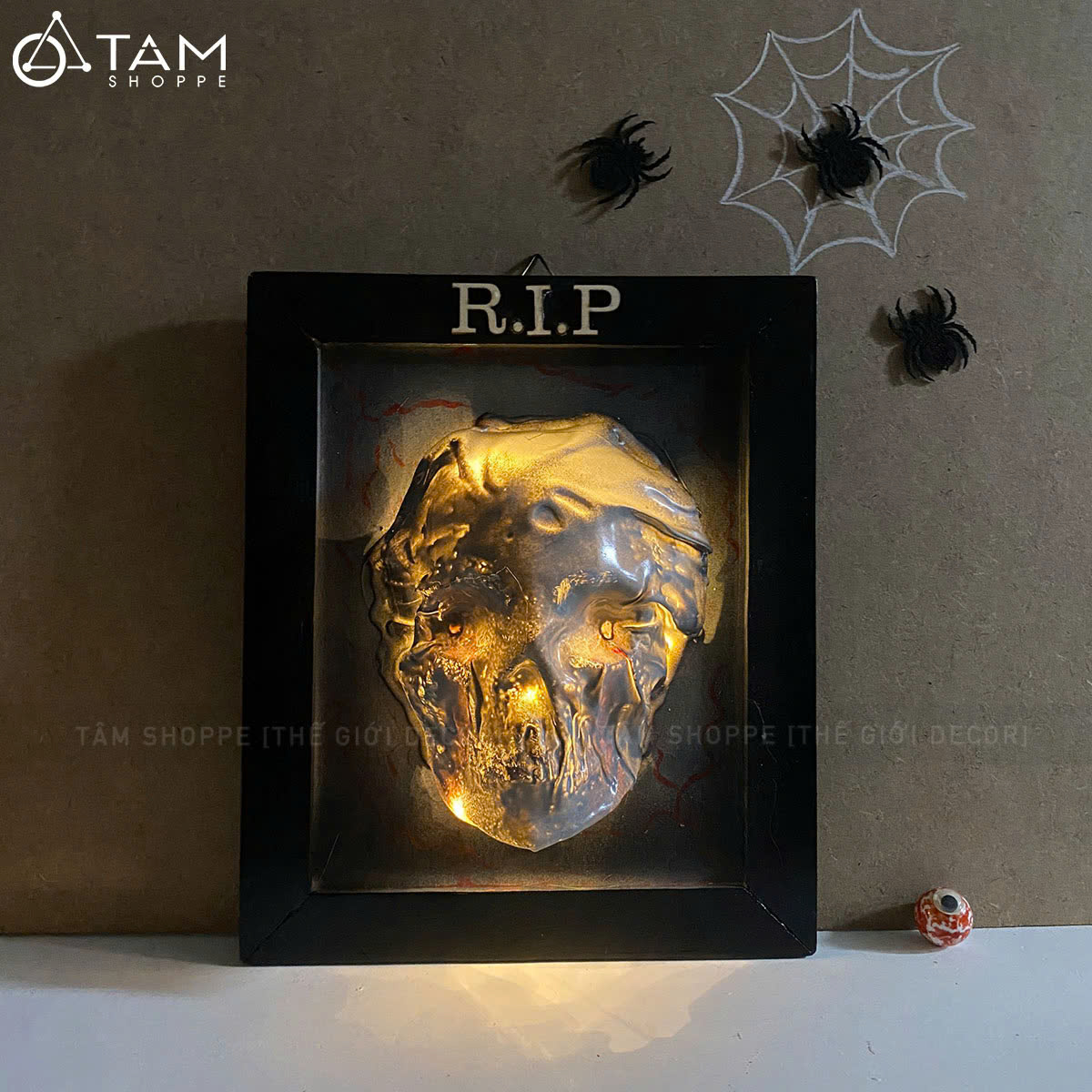 Tranh gỗ Halloween RIP đầu lâu xám có đèn [25x30cm - sẵn pin] trang trí đẹp mắt.