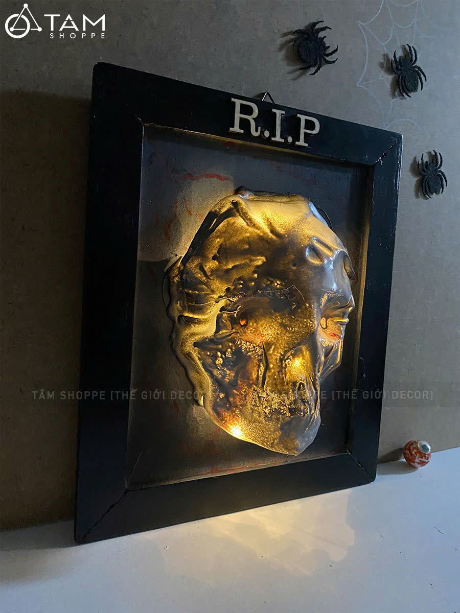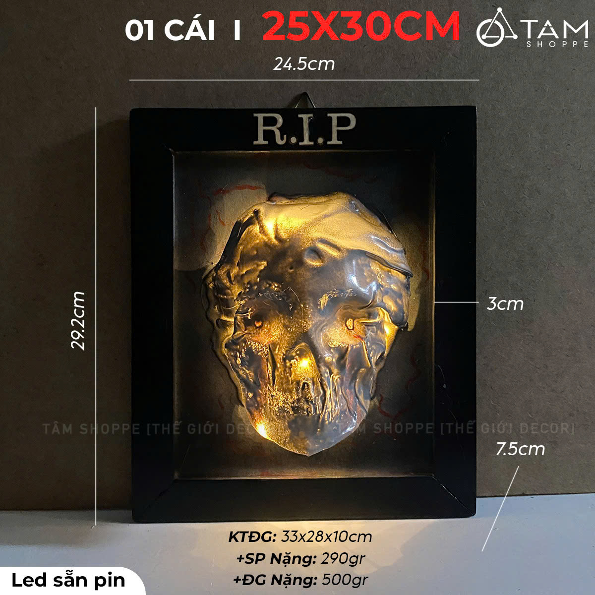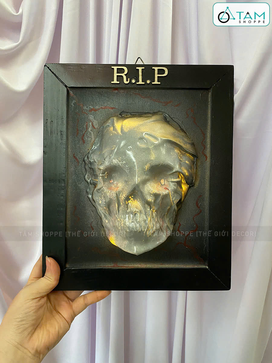 Tranh gỗ Halloween RIP đầu lâu xám có đèn [25x30cm - sẵn pin] trang trí đẹp mắt.