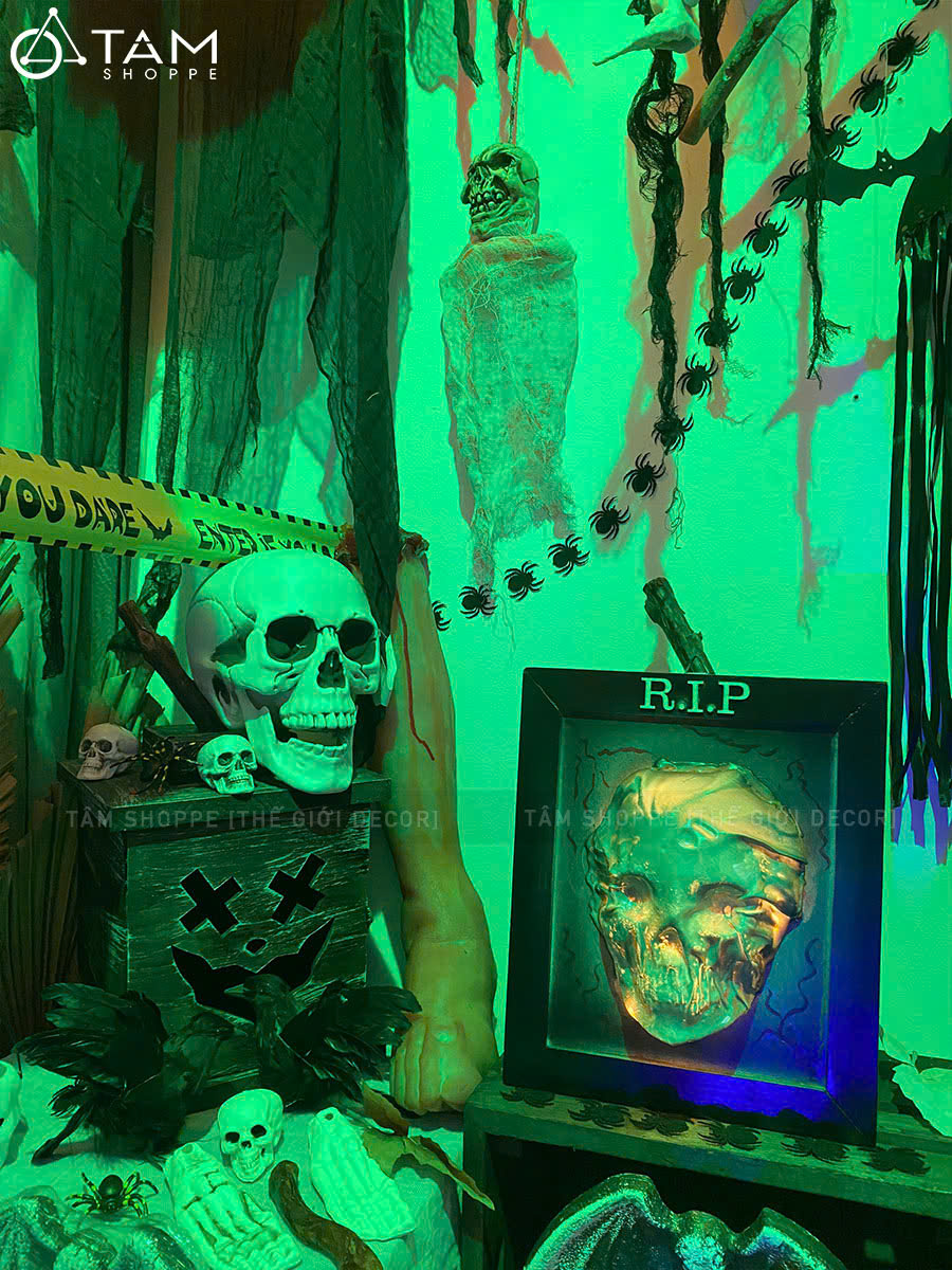 Tranh gỗ Halloween RIP đầu lâu xám có đèn [25x30cm - sẵn pin] trang trí đẹp mắt. Đồ trang trí Halloween là những vật dụng, mô hình hoặc phụ kiện được dùng để tạo không khí rùng rợn, huyền bí, vui nhộn đặc trưng cho ngày lễ Halloween (31/10).