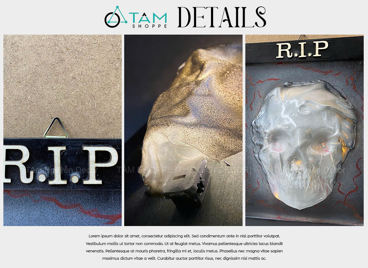 Viền khung bằng gỗ, đầu lâu nhựa mỏng sơn màu xám đen độc đáo. Mặt sau có khoen treo