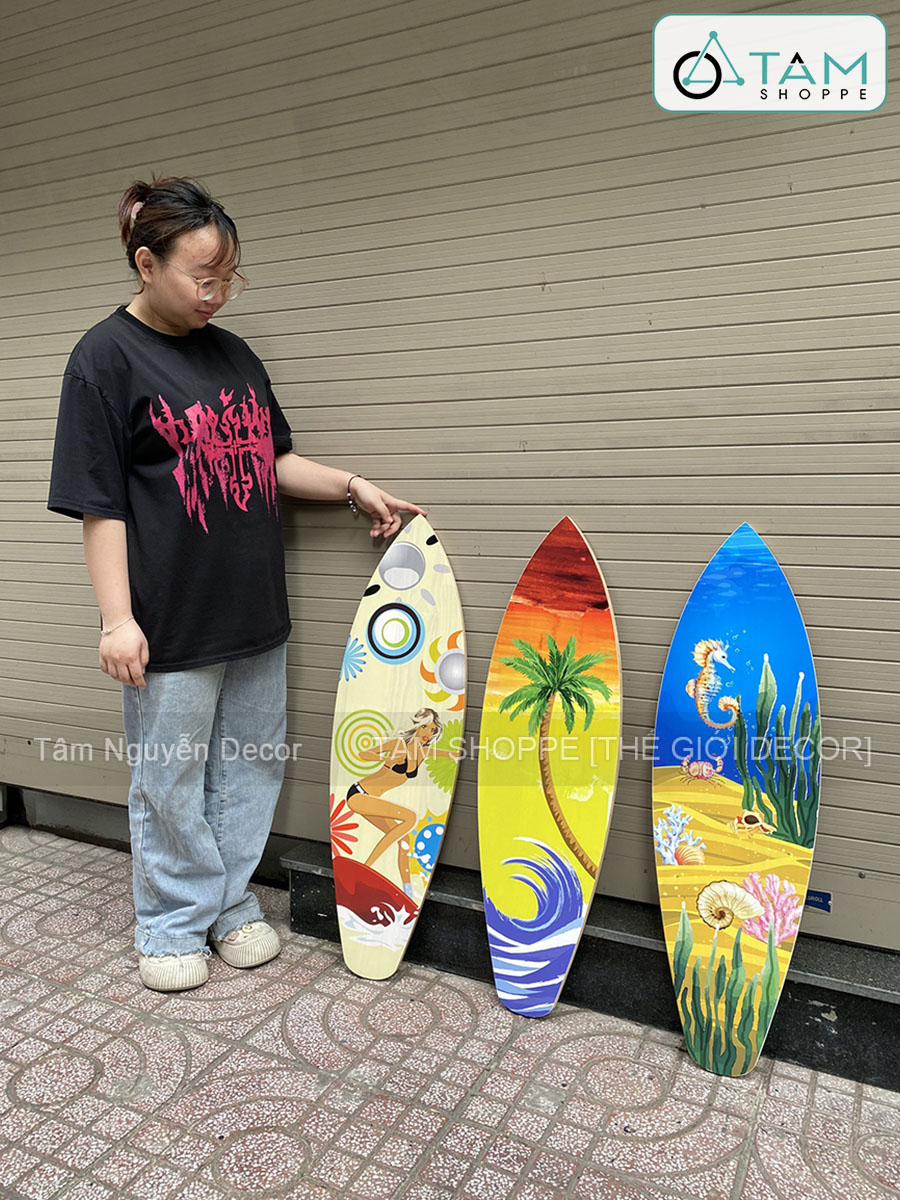 Một chiếc ván lướt sóng lớn, có màu sắc nổi bật hoặc họa tiết bắt mắt có thể trở thành trung tâm thu hút ánh nhìn trong không gian. Thích hợp treo trên tường phòng khách, hành lang, phòng ngủ hoặc không gian mở như sân thượng, ban công.