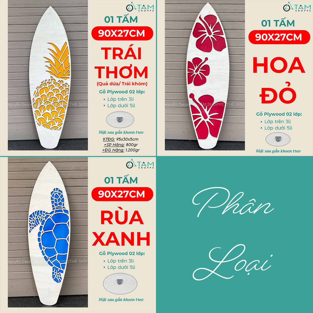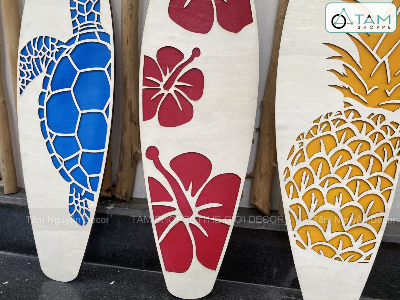 - Mô hình ván lướt sóng làm bằng chất liệu gỗ Plywood 02 lớp (Mỗi lớp dày 2ly - 5ly), cắt cách điệu hoạ tiết hình con rùa, trái thơm, hoa dâm bụt thú vị.