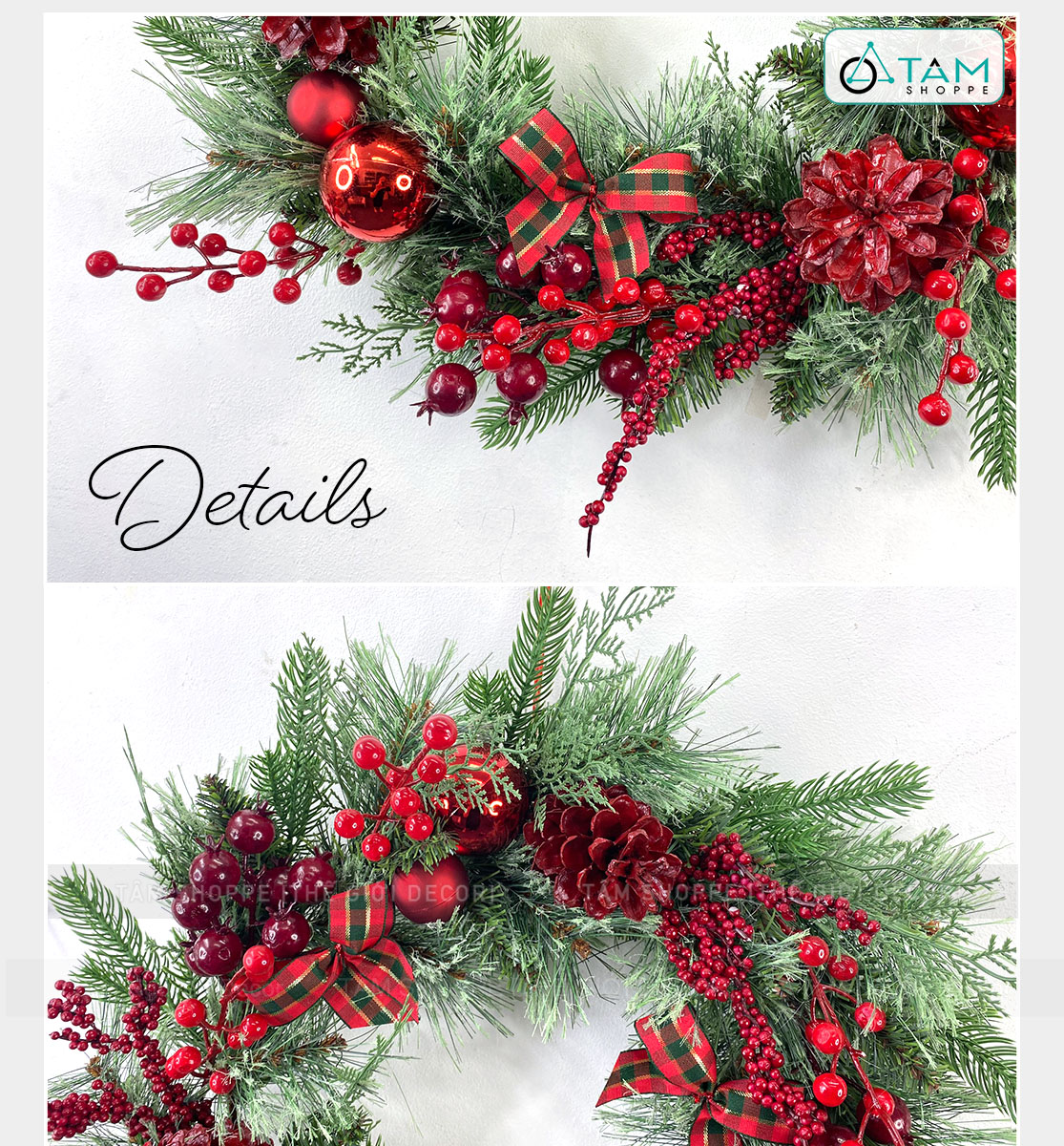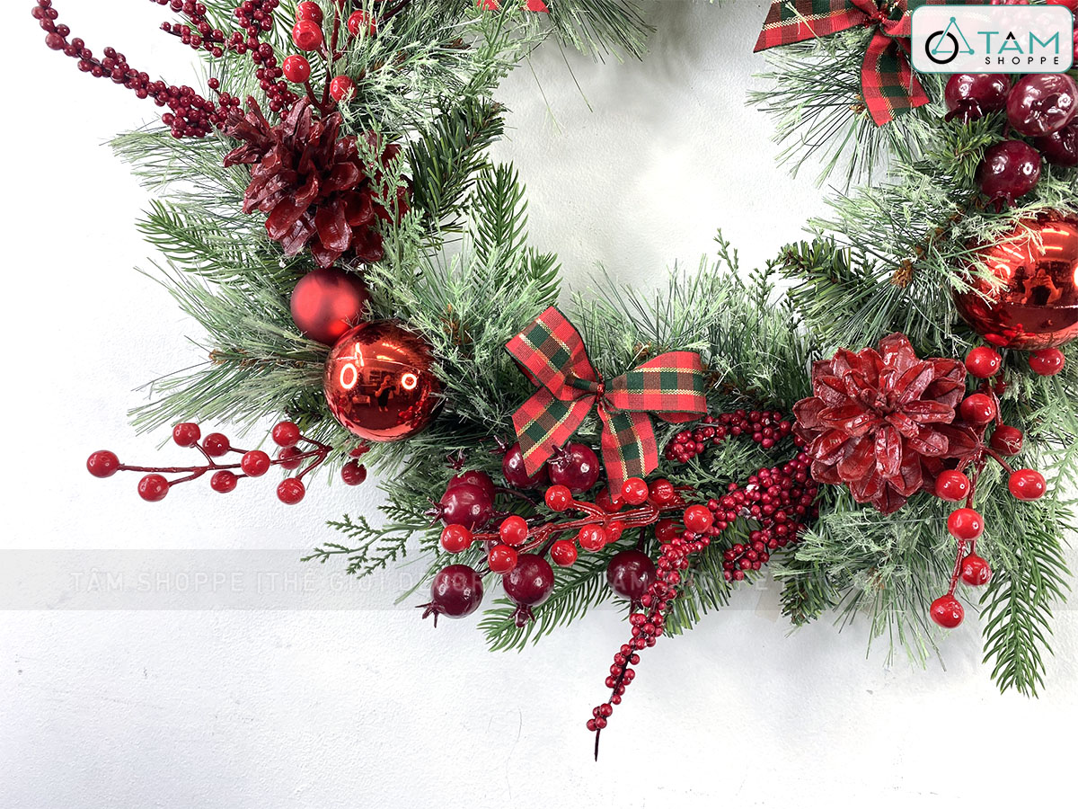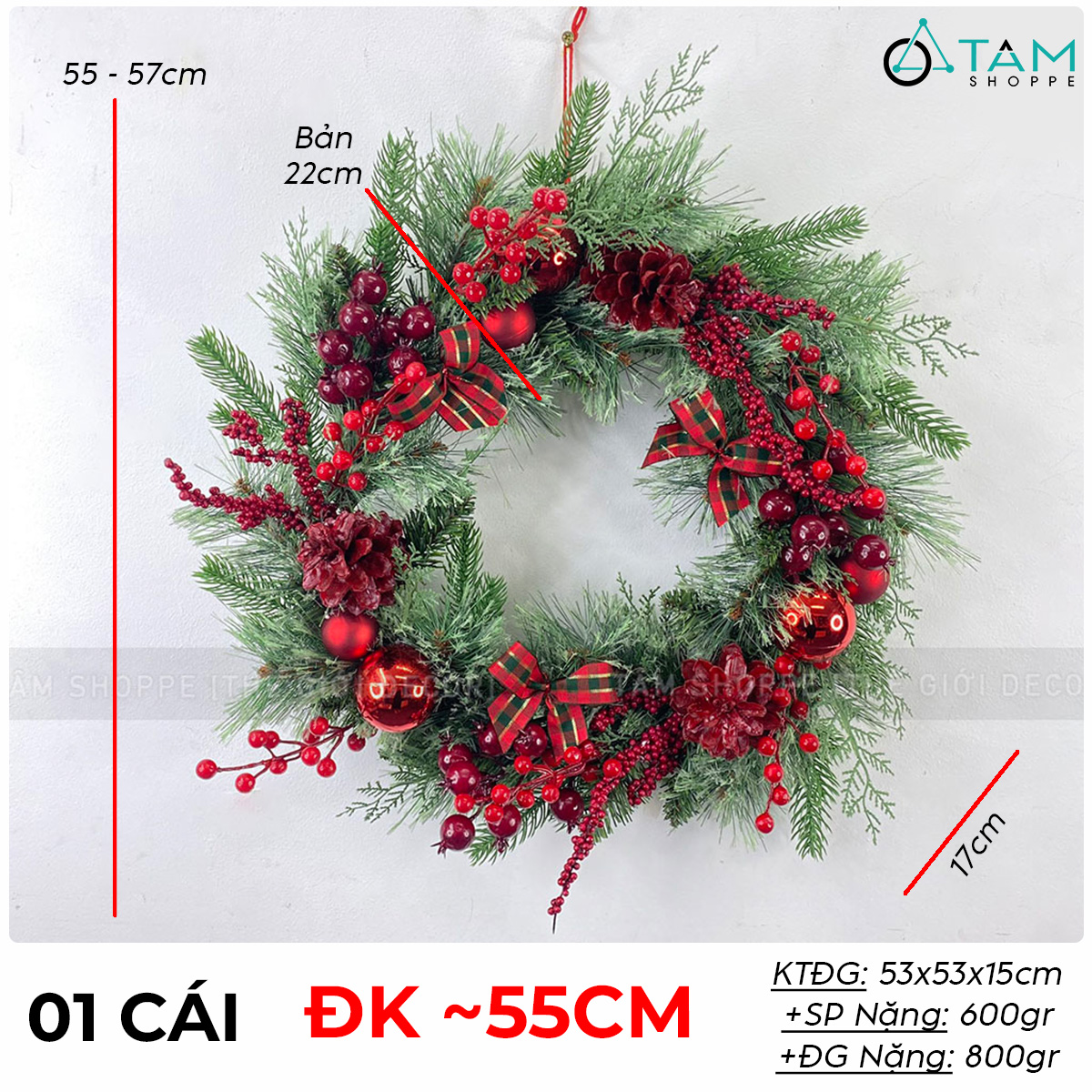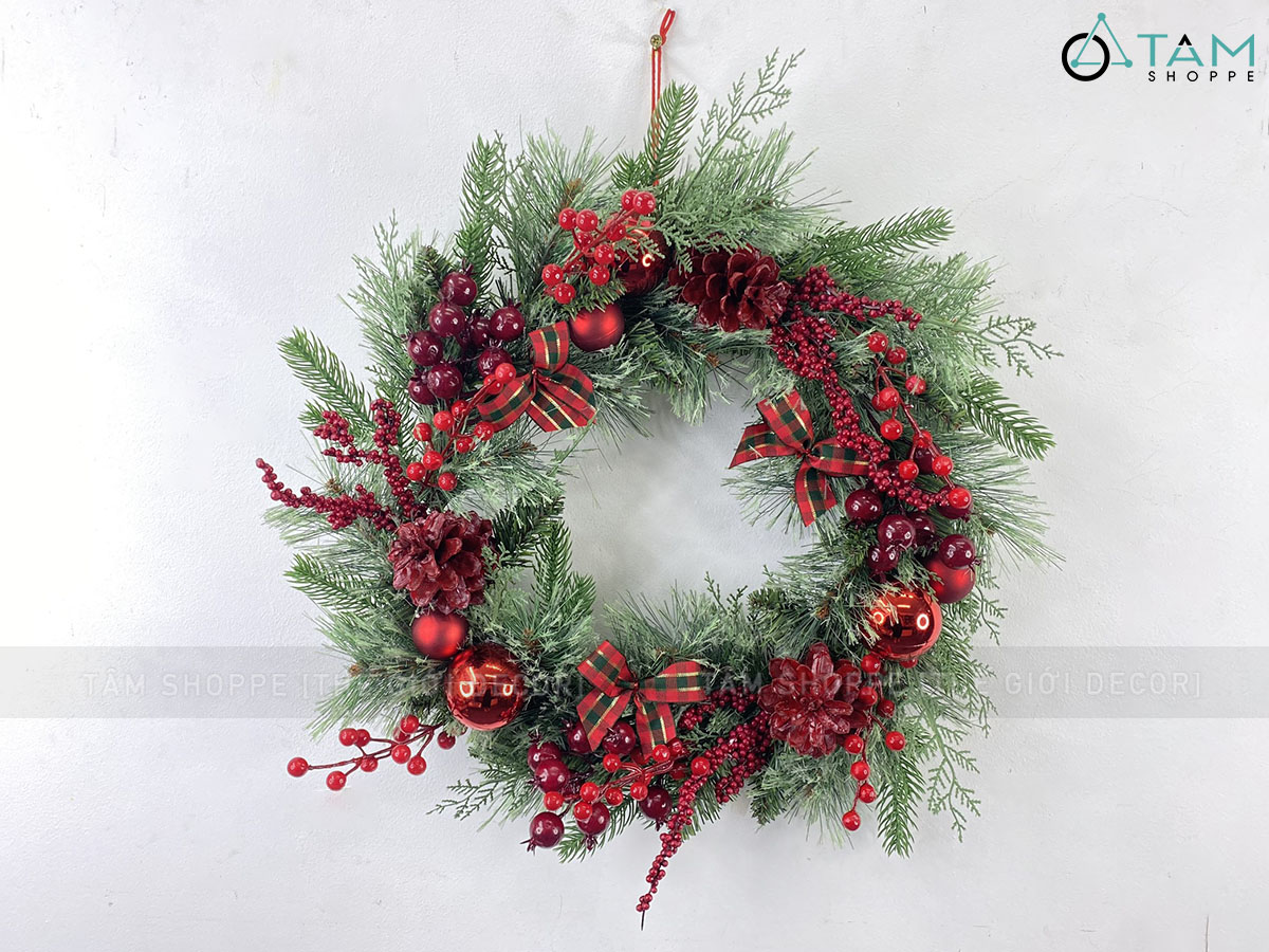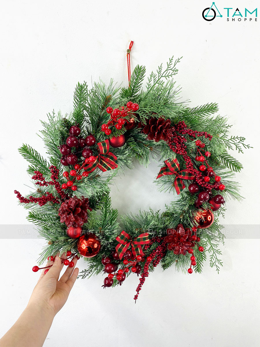 Vòng nguyệt quế 4 loại lá nơ caro đỏ ĐK 55 - 60cm trang trí đẹp mắt. Đồ trang trí Noel là các vật dụng, phụ kiện, hoặc mô hình được dùng để trang hoàng không gian trong dịp Giáng Sinh (Noel), nhằm tạo nên không khí ấm áp, vui tươi và mang đậm sắc màu lễ hội. trang trí đẹp mắt. Đồ trang trí Noel là các vật dụng, phụ kiện, hoặc mô hình được dùng để trang hoàng không gian trong dịp Giáng Sinh (Noel), nhằm tạo nên không khí ấm áp, vui tươi và mang đậm sắc màu lễ hội.