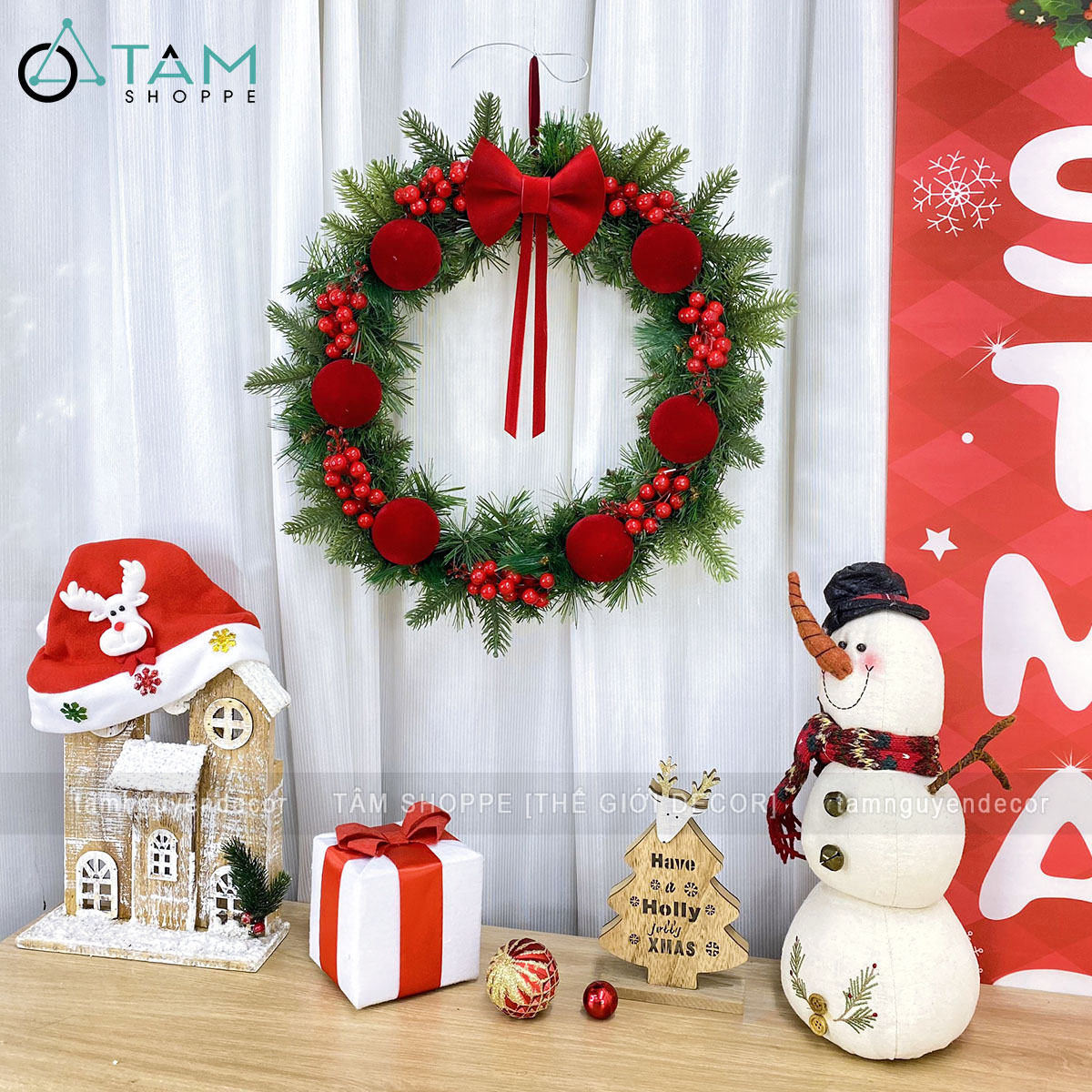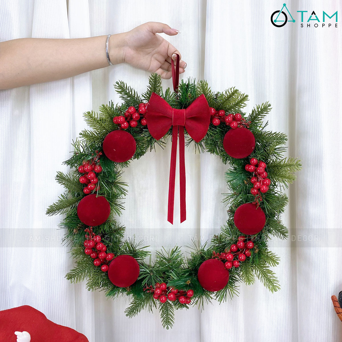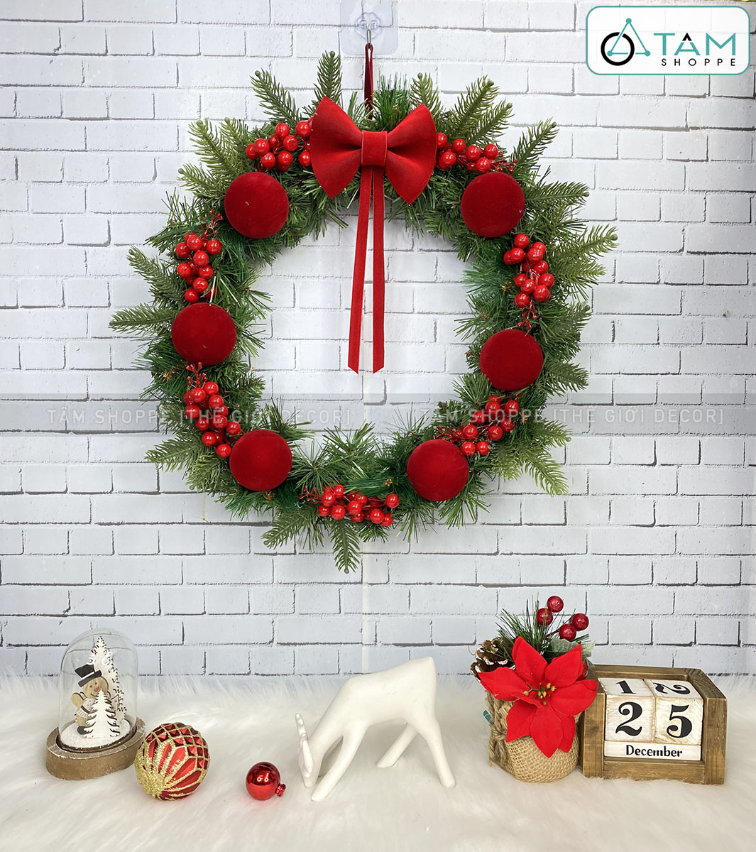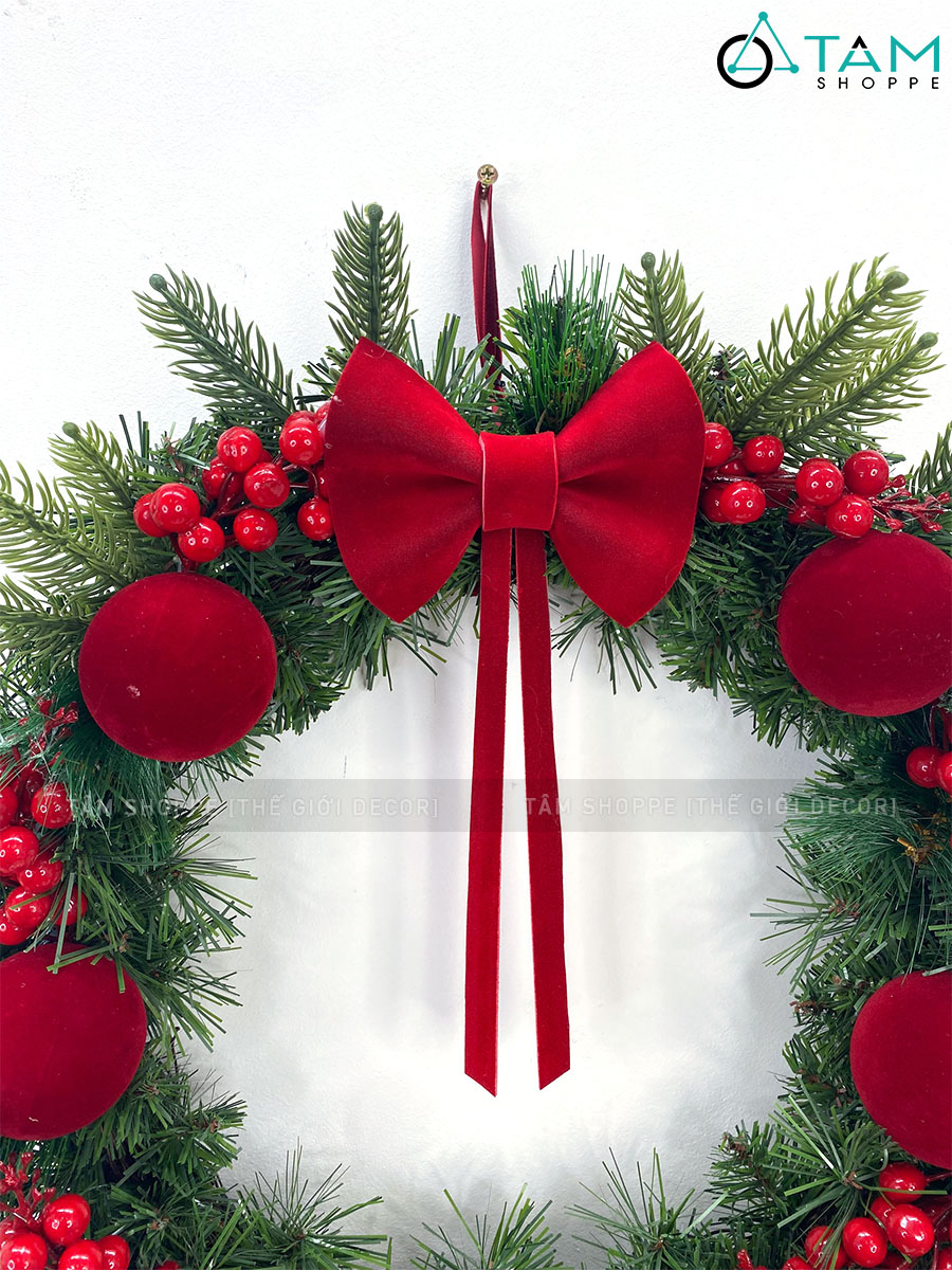 Vòng nguyệt quế Noel Châu nhung nơ đỏ ĐK 50cm trang trí đẹp mắt