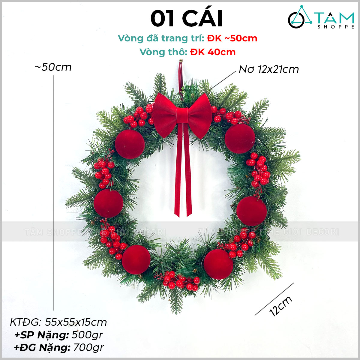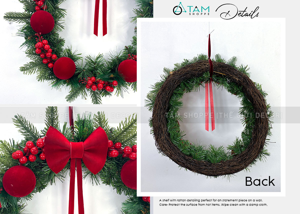 Vòng nguyệt quế Noel Châu nhung nơ đỏ ĐK 50cm trang trí đẹp mắt. Đồ trang trí Noel là các vật dụng, phụ kiện, hoặc mô hình được dùng để trang hoàng không gian trong dịp Giáng Sinh (Noel), nhằm tạo nên không khí ấm áp, vui tươi và mang đậm sắc màu lễ hội.