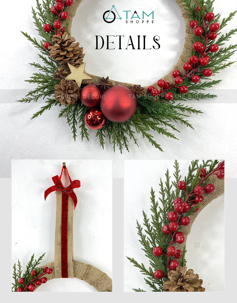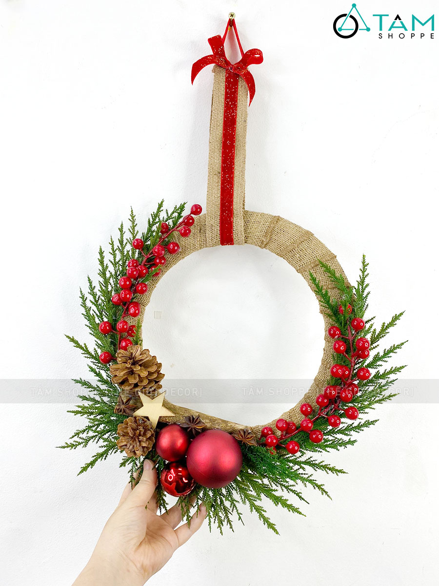 Vòng nguyệt quế chùm châu đỏ sao gỗ lá tùng thơm ĐK 40cm trang trí đẹp mắt. Đồ trang trí Noel là các vật dụng, phụ kiện, hoặc mô hình được dùng để trang hoàng không gian trong dịp Giáng Sinh (Noel), nhằm tạo nên không khí ấm áp, vui tươi và mang đậm sắc màu lễ hội. trang trí đẹp mắt. Đồ trang trí Noel là các vật dụng, phụ kiện, hoặc mô hình được dùng để trang hoàng không gian trong dịp Giáng Sinh (Noel), nhằm tạo nên không khí ấm áp, vui tươi và mang đậm sắc màu lễ hội.