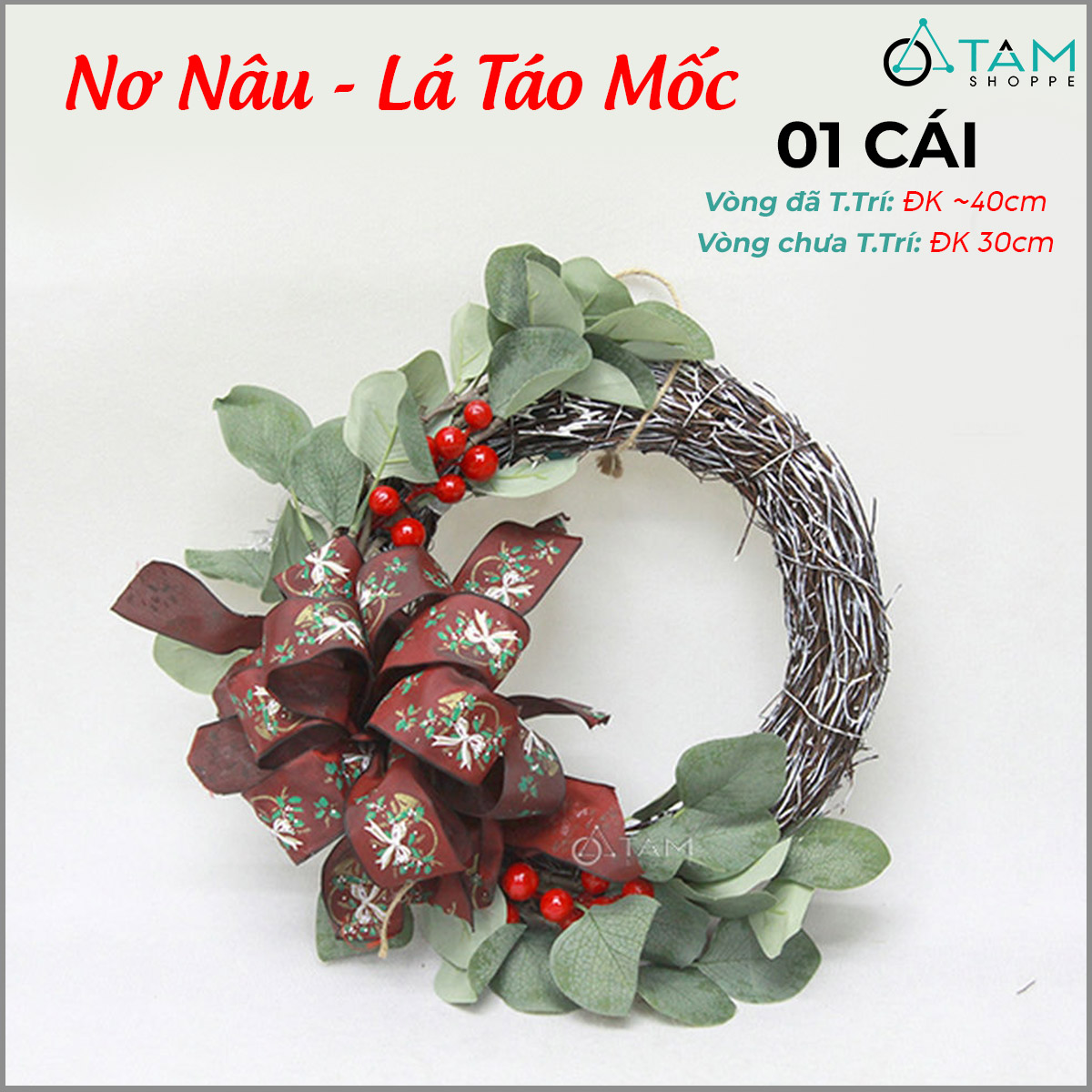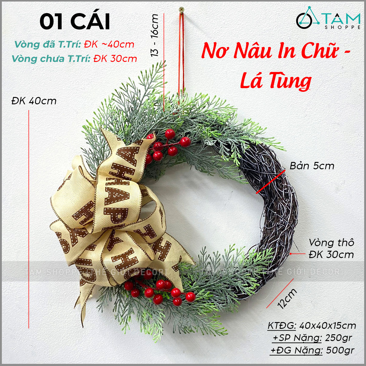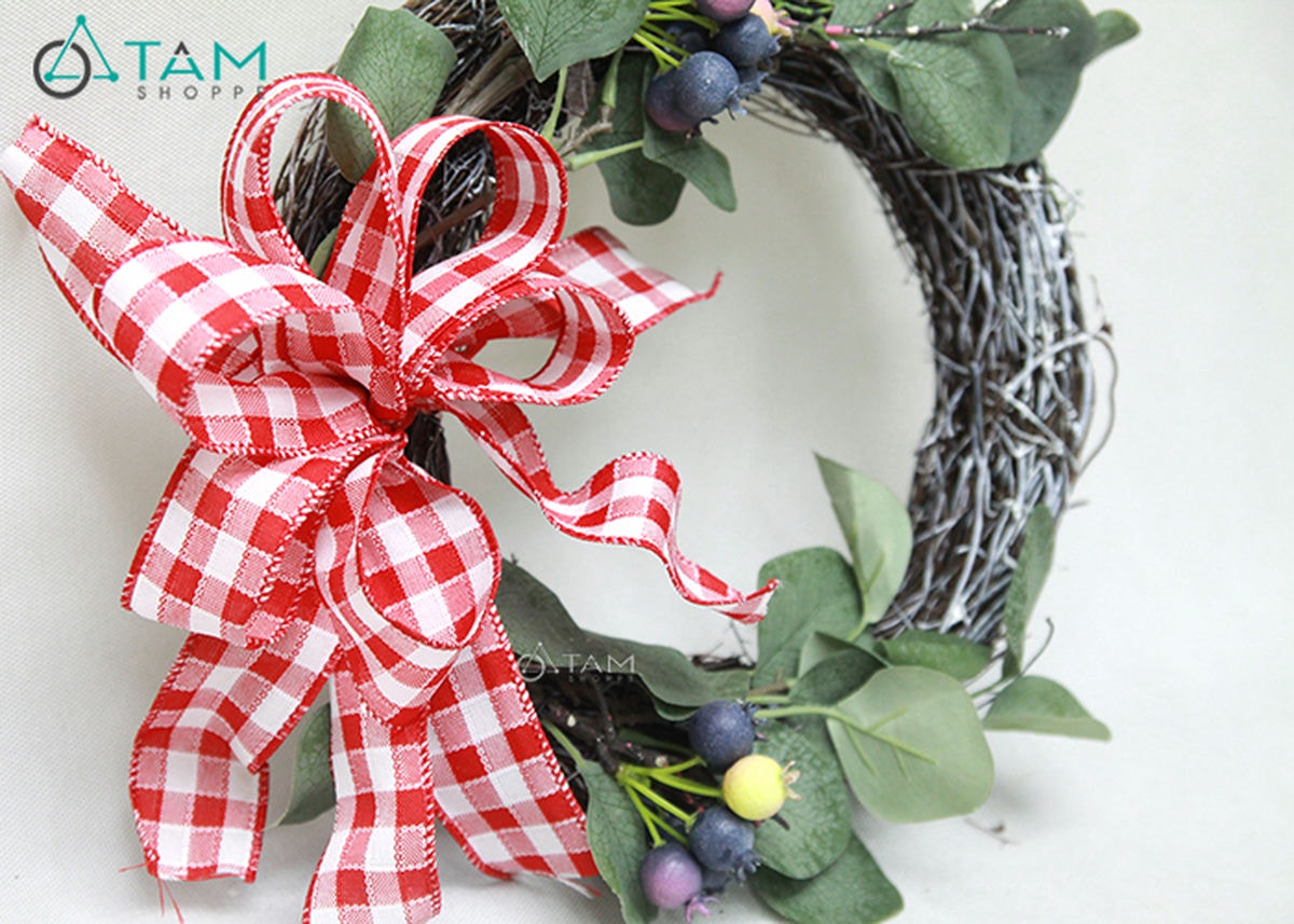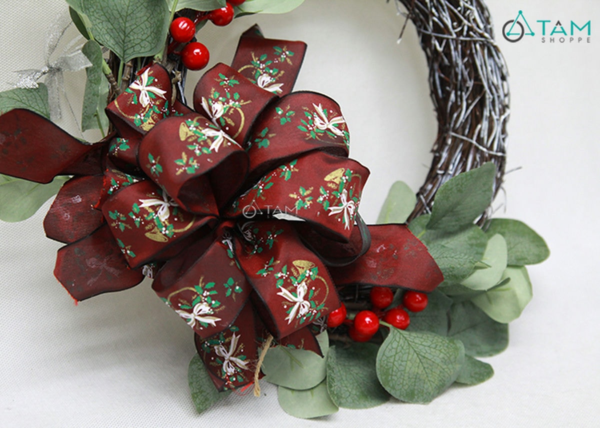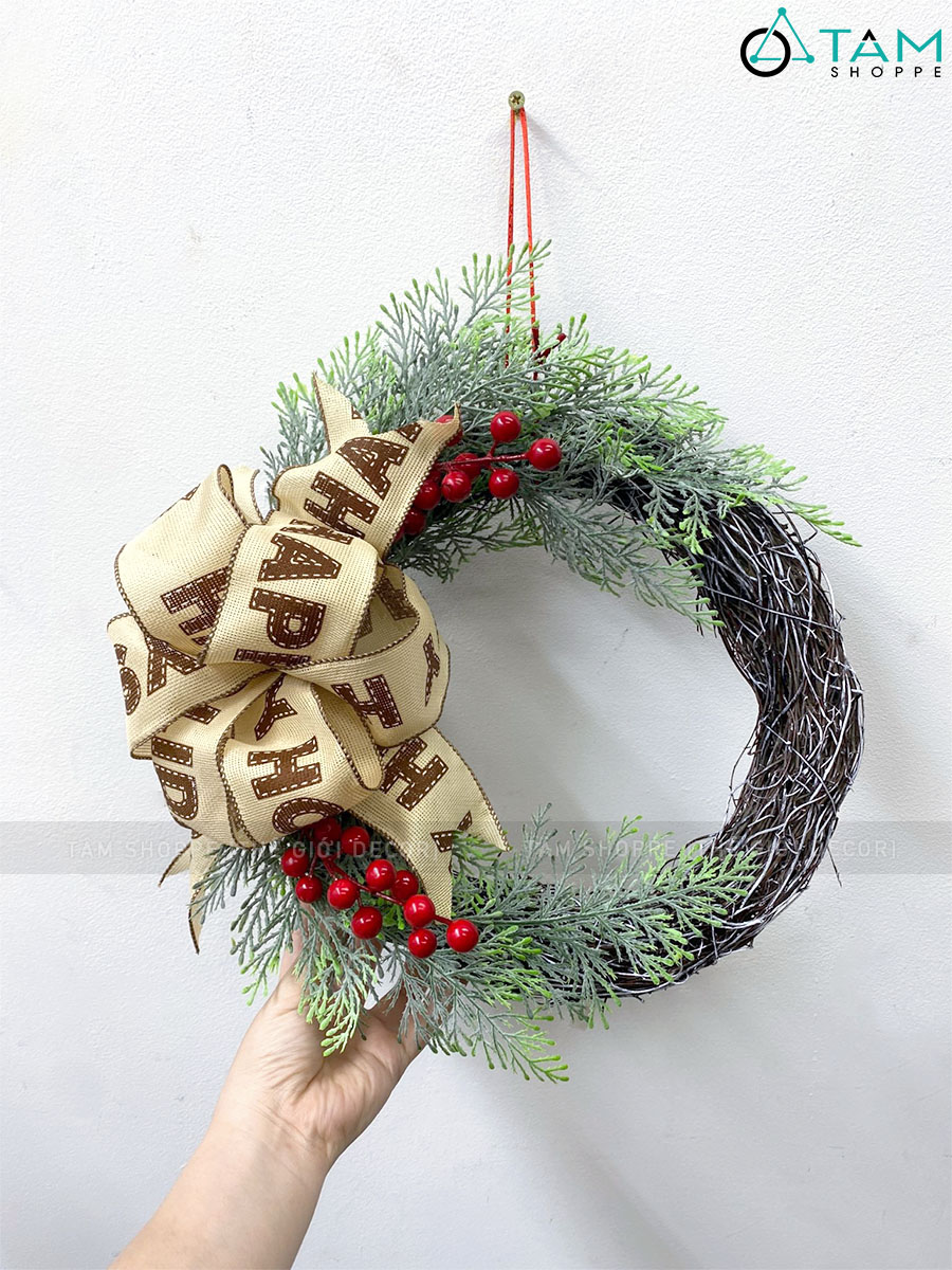 Vòng nguyệt quế Noel nửa vòng thắt nơ ĐK30cm trang trí đẹp mắt