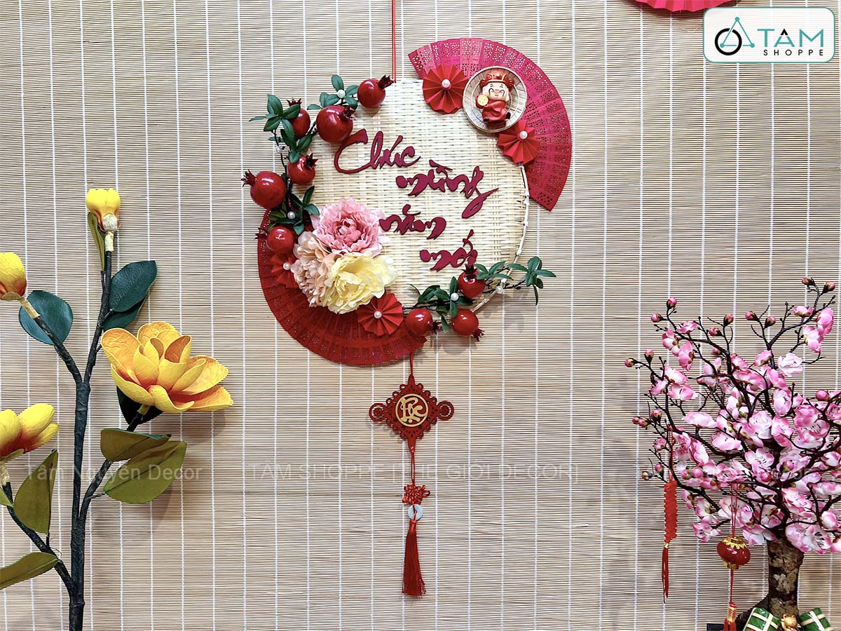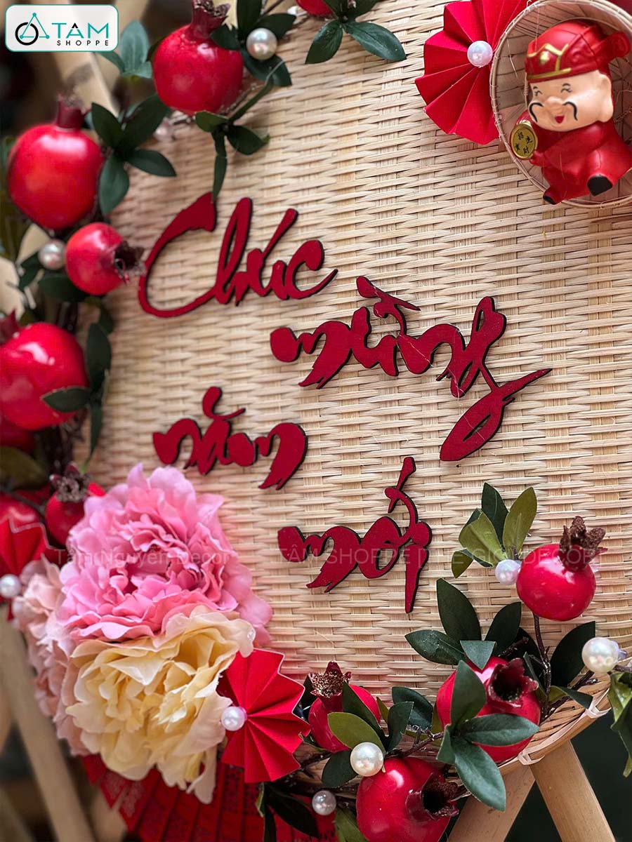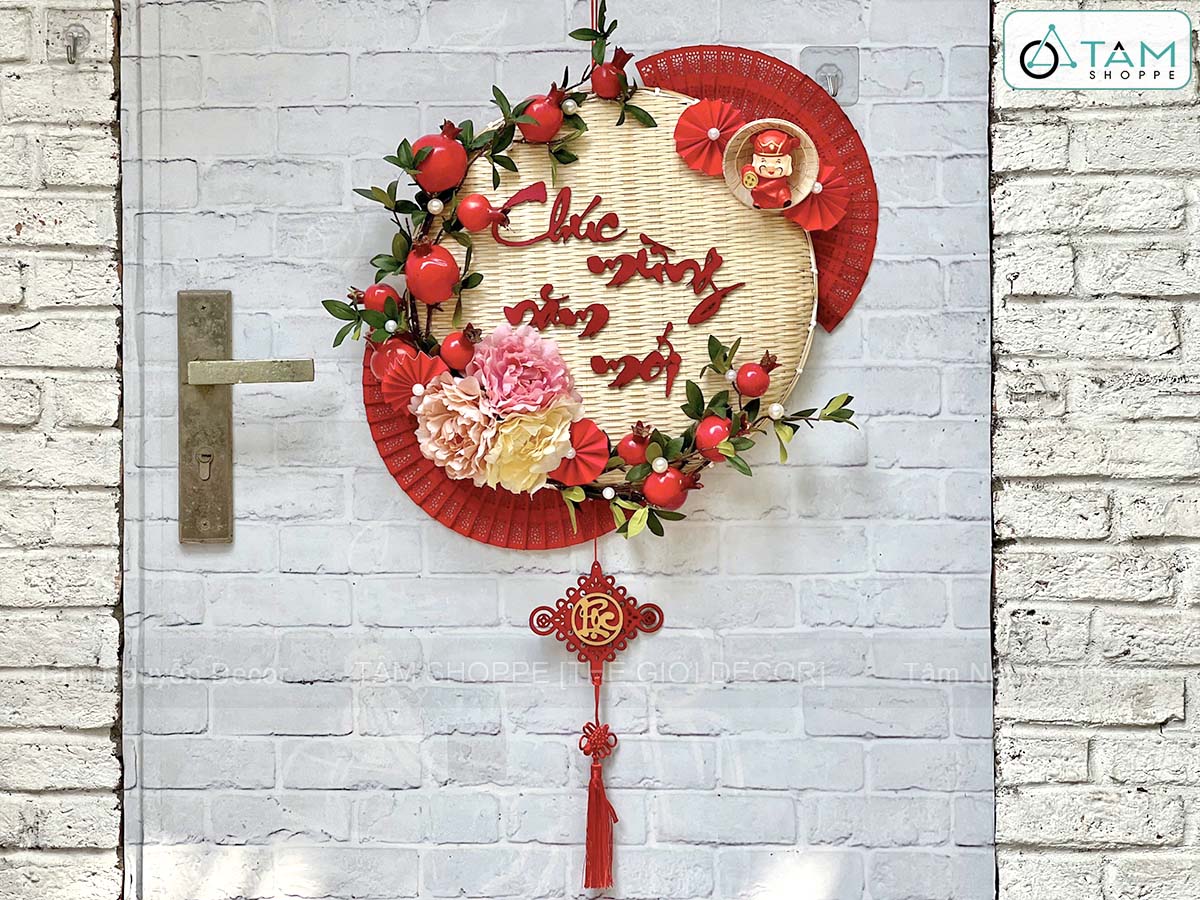Vòng treo cửa mẹt tre Chúc Mừng Năm Mới cành lựu quạt Đỏ [Vòng nhẹ] N50cm trang trí đẹp mắt. Đồ trang trí Tết là các vật dụng, phụ kiện, hoặc mô hình được dùng để trang hoàng không gian trong dịp lễ, nhằm tạo nên không khí ấm áp, vui tươi và mang đậm sắc màu lễ hội.