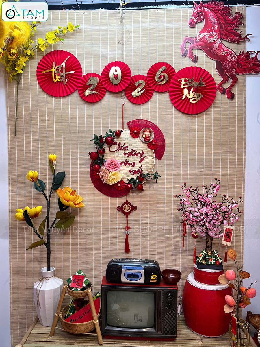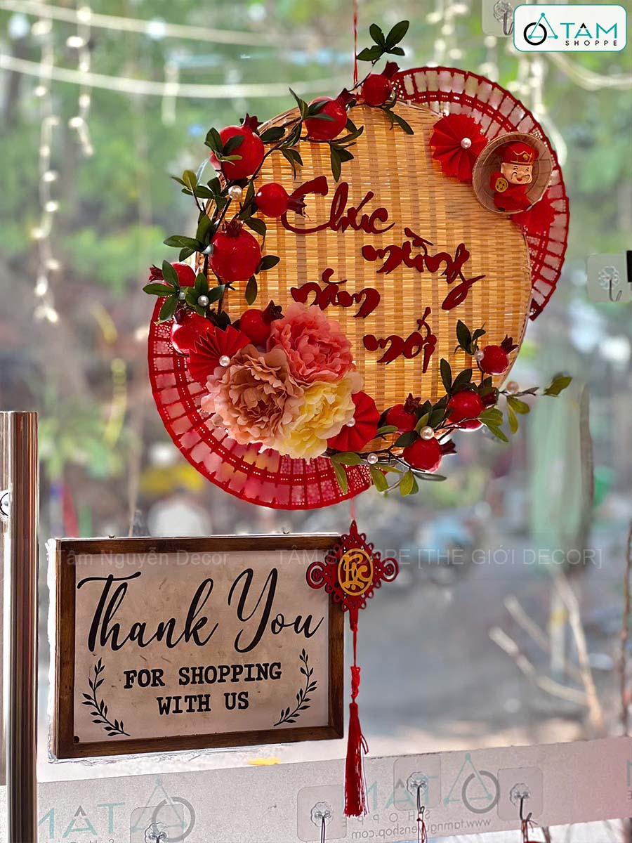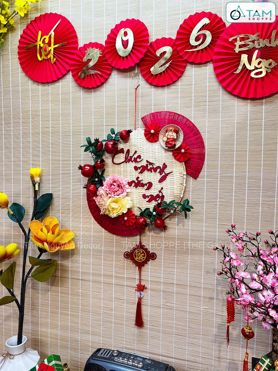 Vòng treo cửa mẹt tre Chúc Mừng Năm Mới cành lựu quạt Đỏ [Vòng nhẹ] N50cm trang trí đẹp mắt. Đồ trang trí Tết là các vật dụng, phụ kiện, hoặc mô hình được dùng để trang hoàng không gian trong dịp lễ, nhằm tạo nên không khí ấm áp, vui tươi và mang đậm sắc màu lễ hội.
